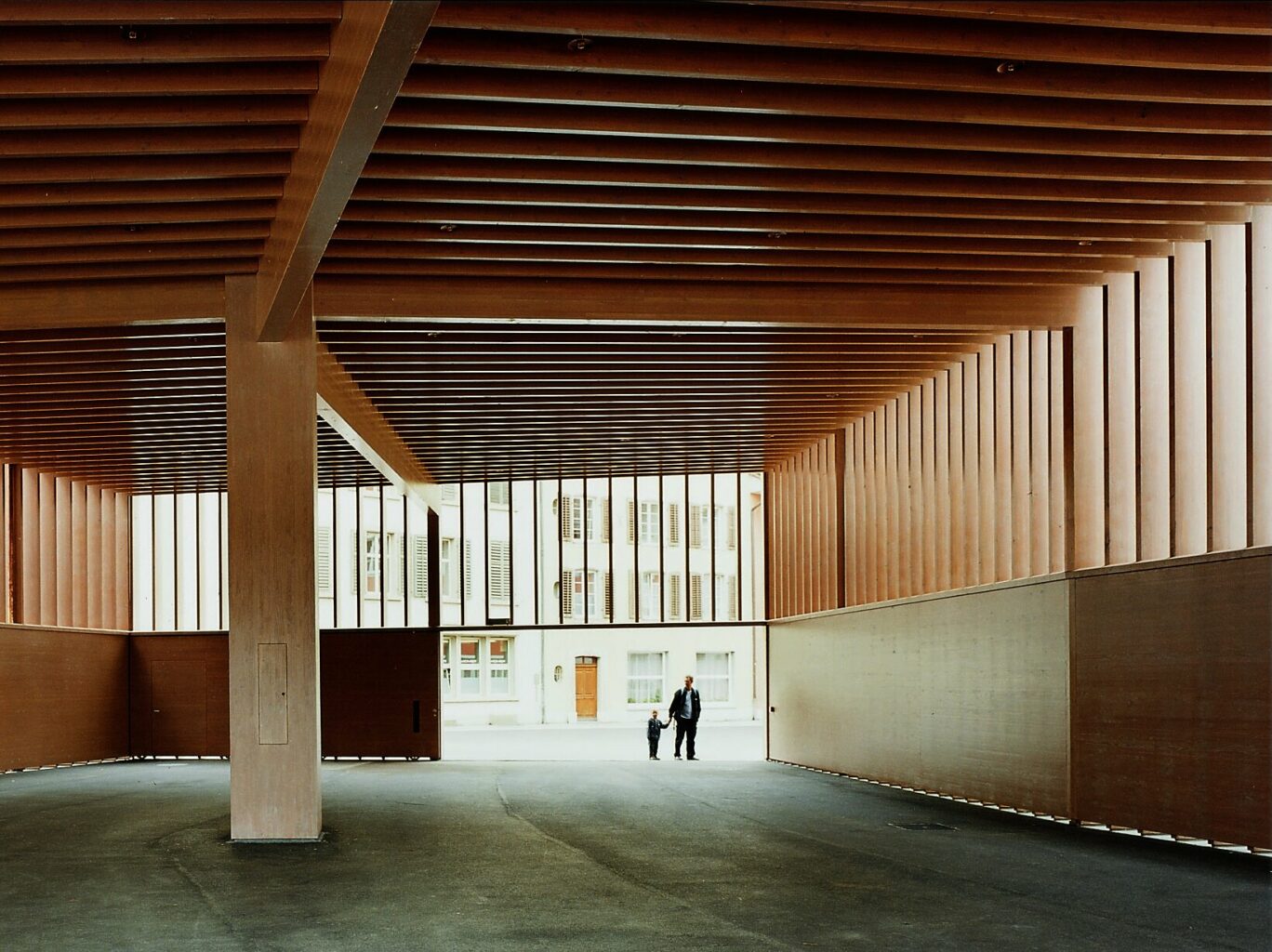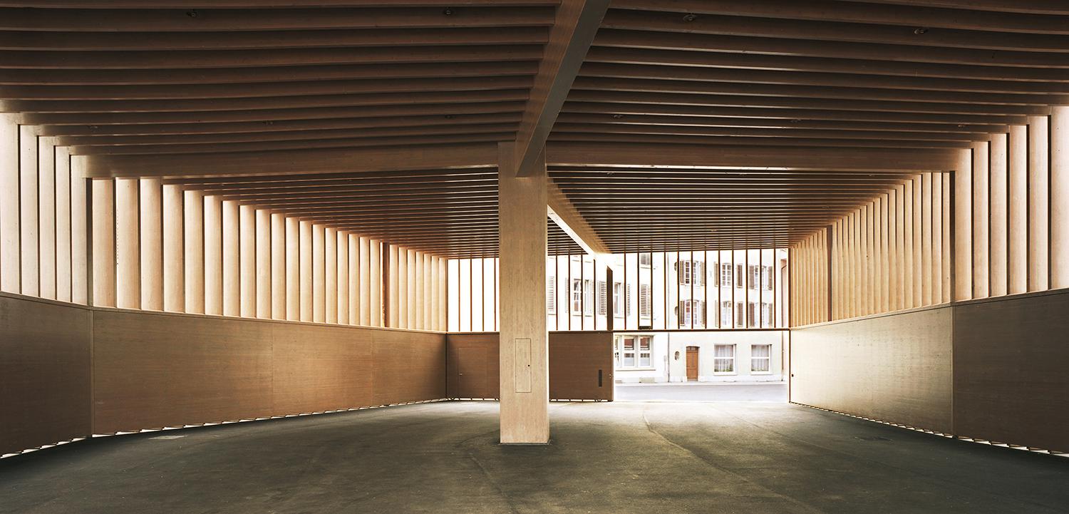 Sie ist eine stille Architekturikone. Ein Stück analoge Architektur ohne explizite Analogien – ohne Anbiederung an den historischen Kontext. Die Markthalle auf dem Färberplatz in Aarau besetzt die langgezogene Gasse zwischen dem inneren und dem äusseren Mauerring der Altstadt an der Stelle mit grösster Selbstverständlichkeit. Der Wettbewerb fand 1996 statt. Eingeweiht wurde der Holzbau 2002. Er zählt damit zum Frühwerk der damals aufstrebenden Quintus Miller und Paola Maranta. Die ungewöhnliche Konstruktion der Halle aus den zahlreichen, dicht beieinander stehenden Holzlamellen definiert im Strassenraum ein klar umrissenes Bauvolumen und verleiht diesem die architektonische Form. Architektur ist Erinnerung. In ihrer Gestalt verweist die Markthalle auf Räume mittelalterlicher Korn- und Zeughäuser. Durch die zeitgemässe Formgebung und die moderne Konstruktionsweise ist sie jedoch Ausdruck ihrer Zeit innerhalb der gewachsenen Struktur der Stadt.