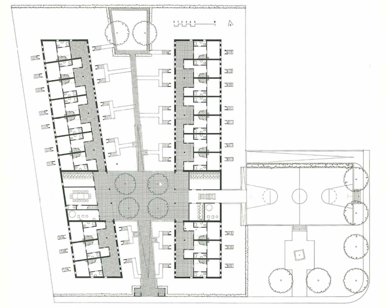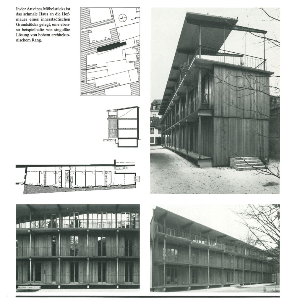 Ein paar Seiten später folgt der Auftritt von Michael Alder, der als Mitgründer der Architekturschule in Muttenz für den lokalen Architekturdiskurs eine wichtige Rolle spielte, mit den Häusern für die Wohngenossenschaft Bündten in Riehen. Reihenhäuser formieren sich um einen zentralen Platz, der das gemeinschaftliche Leben fördert. Die Jury lobt die «Nüchternheit» und die «Betonung des Gemeinsamen vor dem Einzelnen».