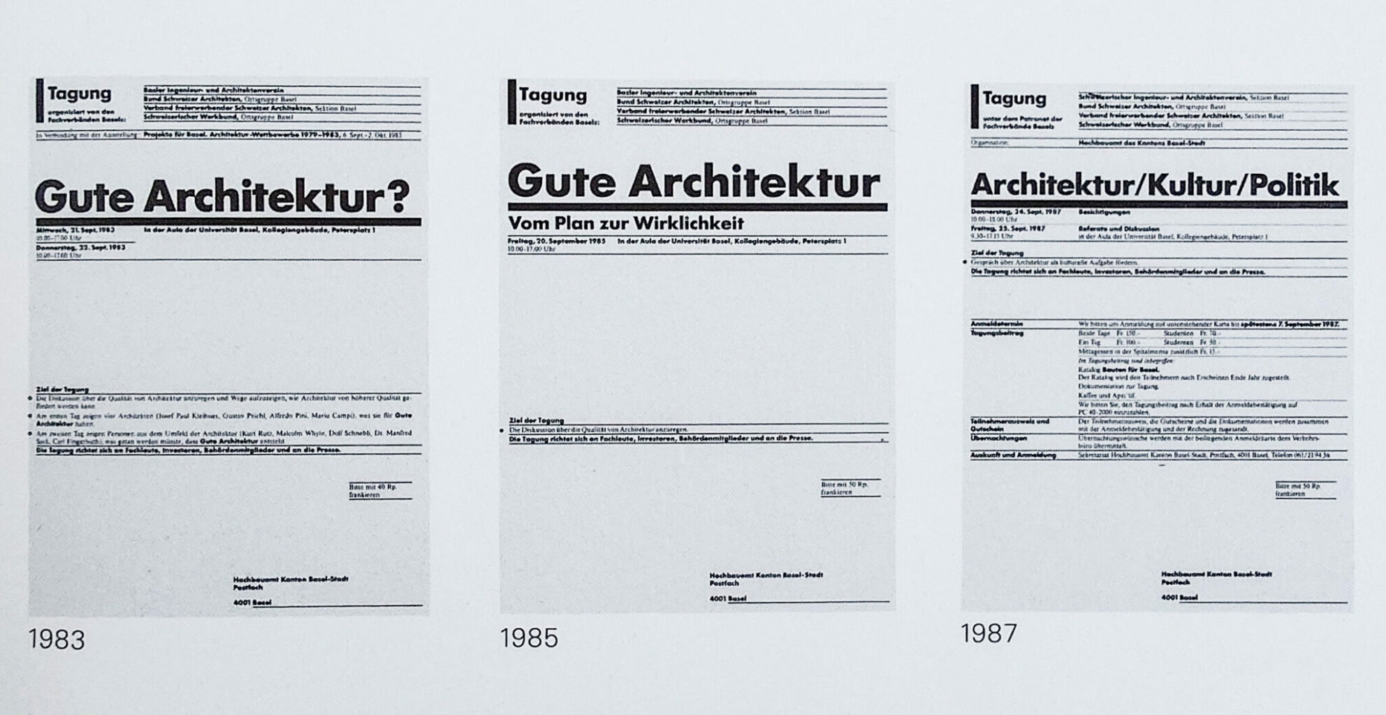 Neben den Broschüren zu den Auszeichnungen fasst eine Publikation die entscheidende Dekade zusammen. Sie heisst «Bauten für Basel 1979–1988». In der Einleitung bekennt sich der damalige Regierungsrat Eugen Keller zur Architekturstadt: «Wir müssen erreichen, dass in der Stadt ein politisches Klima entsteht, in dem gute Architektur als kulturelle Verpflichtung selbstverständlich wird und schlechte Architektur stigmatisiert wird.» Er zählt auch konkrete Massnahmen auf. Die vermittelnde Öffentlichkeitsarbeit war damals ein wichtiges Ziel. Am 21. und 22. September 1983 fand im Kollegienhaus beispielsweise eine Tagung zum Thema «Gute Architektur?» statt. Zwei Jahre später war das Fragezeichen gewichen – und man widmete sich optimistisch dem «Plan zur Wirklichkeit». Es ist bemerkenswert, dass die Architekturvermittlung in den 1980er-Jahren im Hochbauamt höchste Priorität genoss.