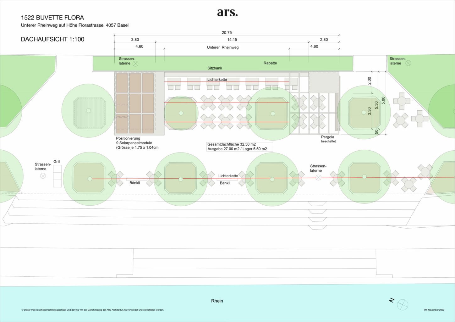 Die Buvette am Unteren Rheinweg musste nach zehn Jahren Betrieb Ende 2022 die Nutzungsbewilligung erneuern. Das Bau- und Verkehrsdepartement hatte deshalb bereits im März 2022 eine Ausschreibung für den Betrieb gestartet und 17 Gastro-Konzepte von Unternehmen und Einzelpersonen erhalten. Die Auswahlkriterien waren u.a. das gastronomische Angebot, Ästhetik und Nachhaltigkeit. Die Auslobungskommission entschied sich für das Konzept der Wyniger Gruppe. Diese beauftragte die ARS Architektur AG damit, die Flora Buvette in ihrem Sinne zu erneuern.