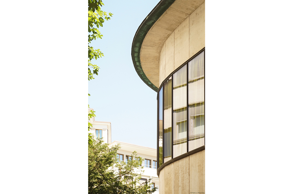 Am Ende einer schmalen Durchfahrt steht im Innenhof nahe des Picassoplatzes der Vorbau des Versammlungsraumes der First Church of Christ. Die Säulen, die Muschelkalkplattenverkleidung und die zu einem gerundeten Glasband gereihte Bronzefenster verleihen dem Gebäude den erwarteten Repräsentationsanspruch. Das Innere gibt sich mit Verputz und Holzfenstern betont nüchtern.