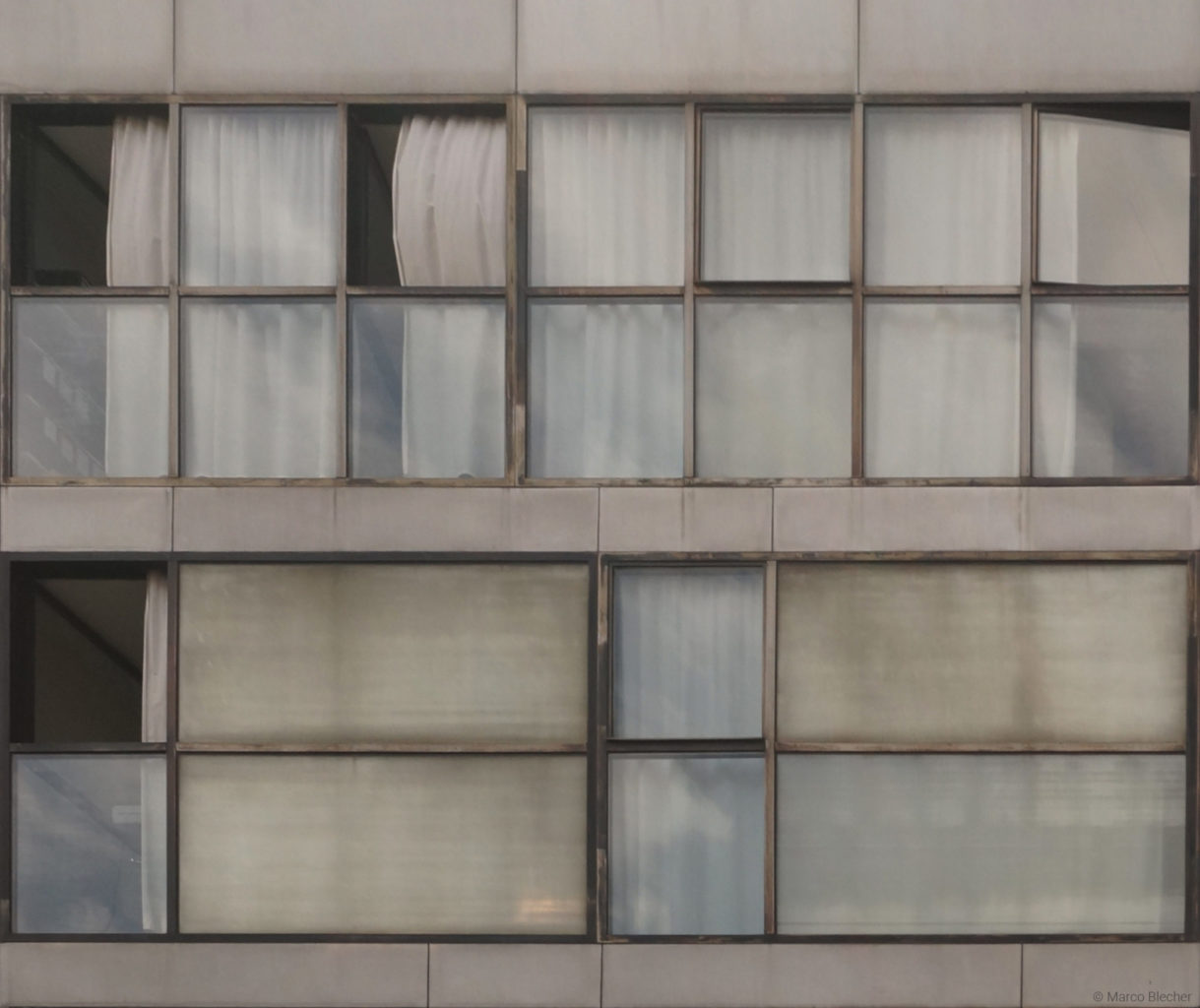Ein von Stockwerk zu Stockwerk wechselnder Rhythmus von transparenten und transluzenten Gläsern, gefasst in Eisenrahmen und ergänzt durch Blenden aus Aluminium bilden eine harmonische Komposition auf der flächig ausgeführten Fassade.
