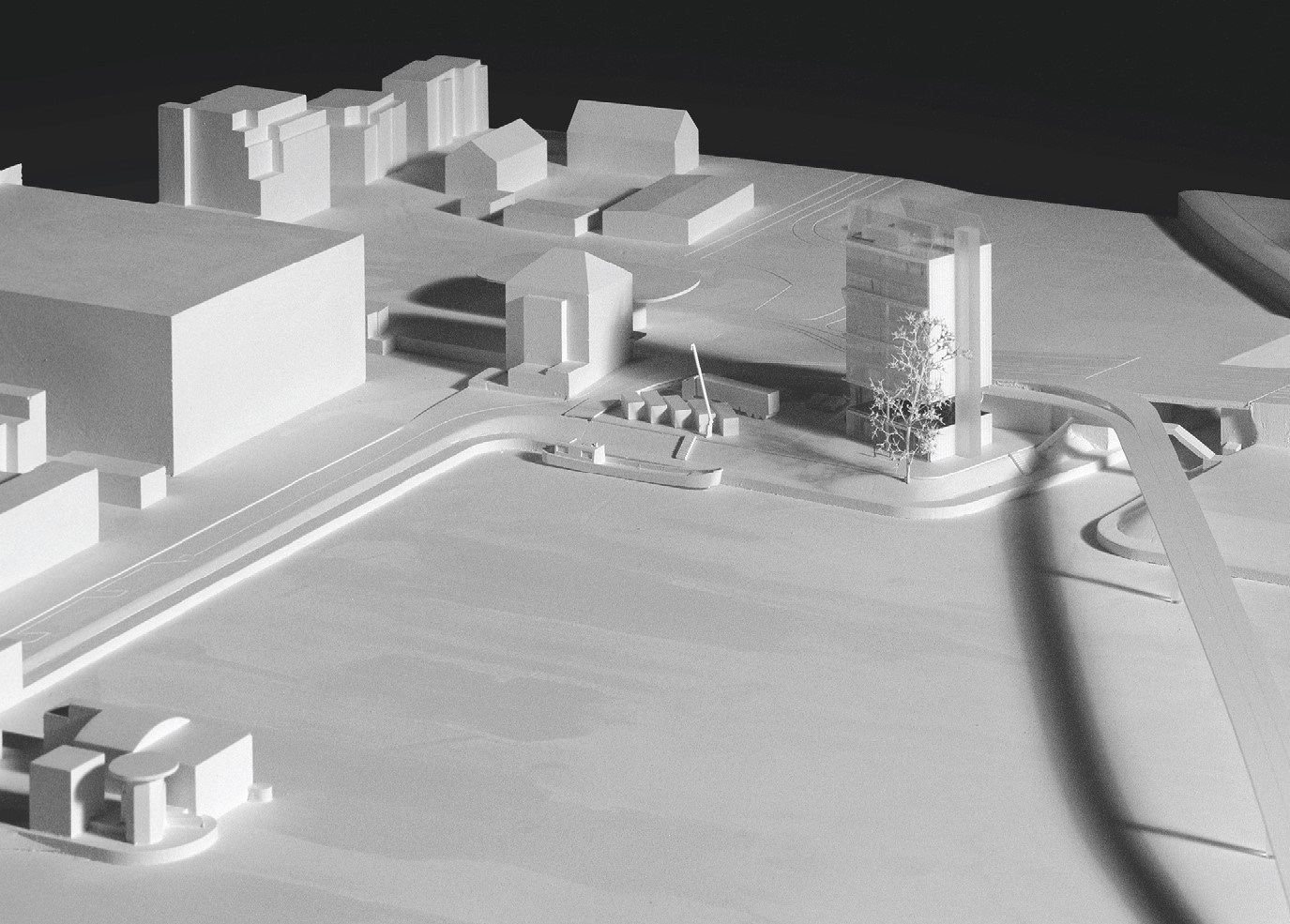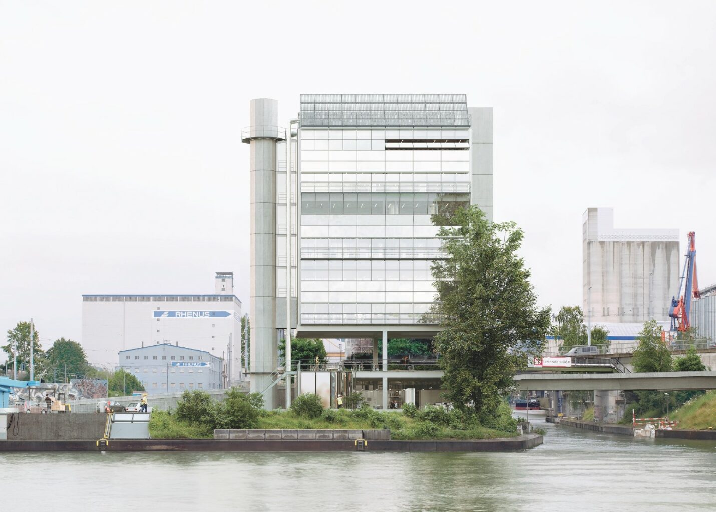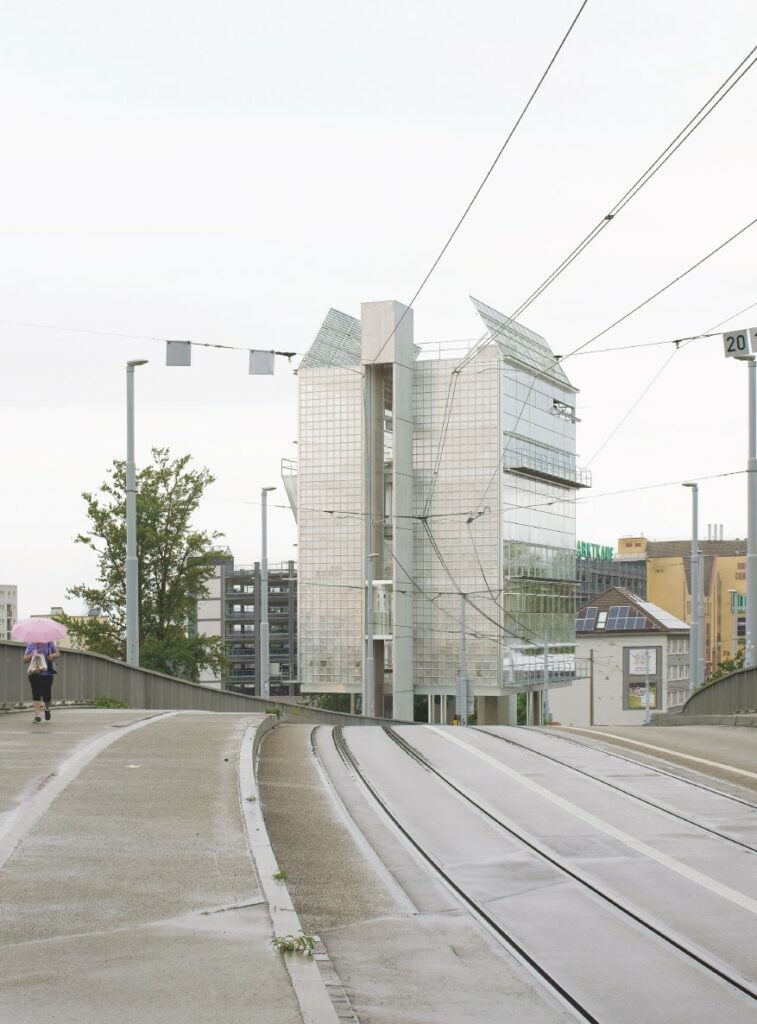 Die abgedrehte Stellung des Gebäudes vermag den geometrischen Konflikt zwischen Brücke und Bau geschickt aufzulösen, dabei wird die vorgefundene Situation an und unter der Brücke mit angenehmer Nonchalance in ihrem etwas ruppigen Hafencharakter bewahrt und gemäss den funktionalen Anforderungen genutzt. Von der Hiltalingerstrasse schwingt sich eine Rampe bis in die Mitte des Hafenbalkons, welcher vielfältig deutbar ist: als Teil der Infrastruktur, Sitzplatz und/oder Freiluftfoyer. Die seitlich am Hafenbalkon ansetzenden Erschliessungsstrukturen von Liftschacht und Treppenspirale tragen die Büros über dem Luftgeschoss, zwei schlanke mittige Stützen stabilisieren den angehobenen Baukörper optisch. Das Nachzeichnen eines Kräfteverlaufes streicht die konstruktive Leichtfüssigkeit der offenen Ecken des Balkons hervor.