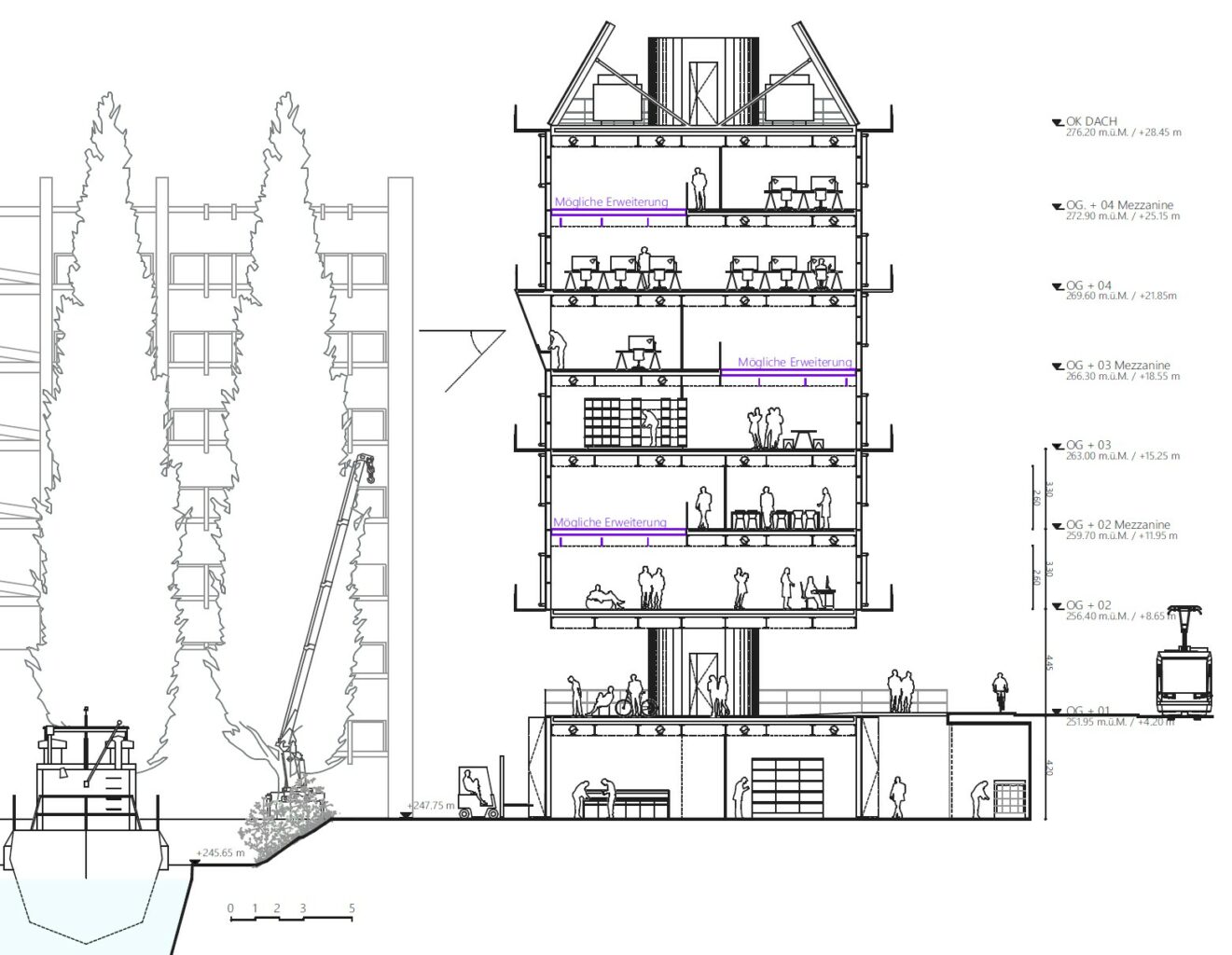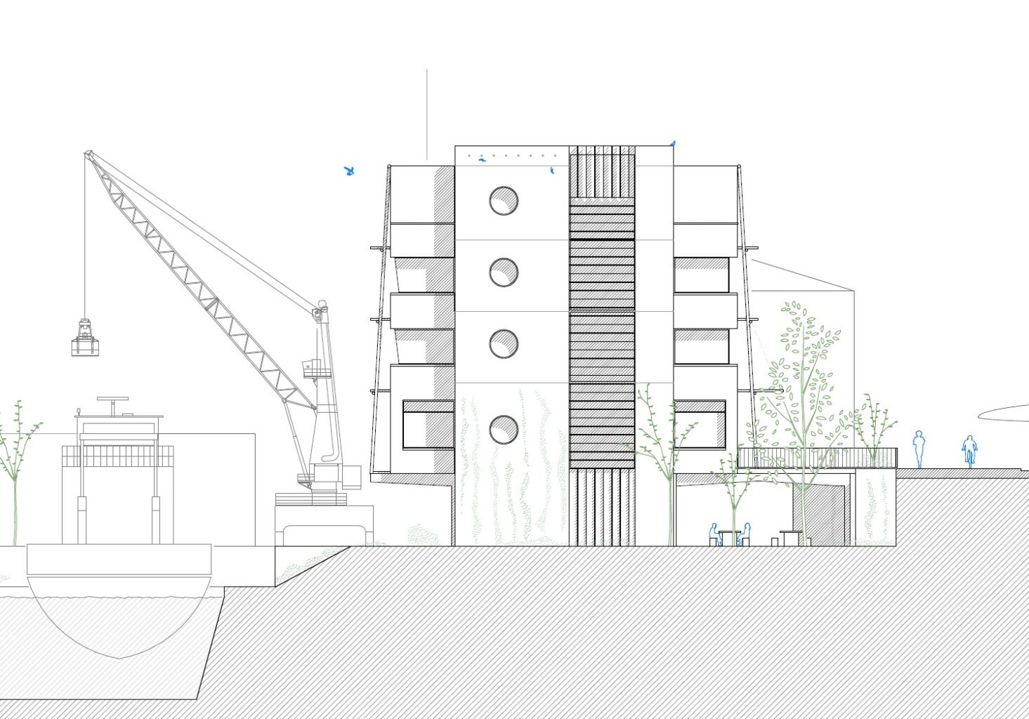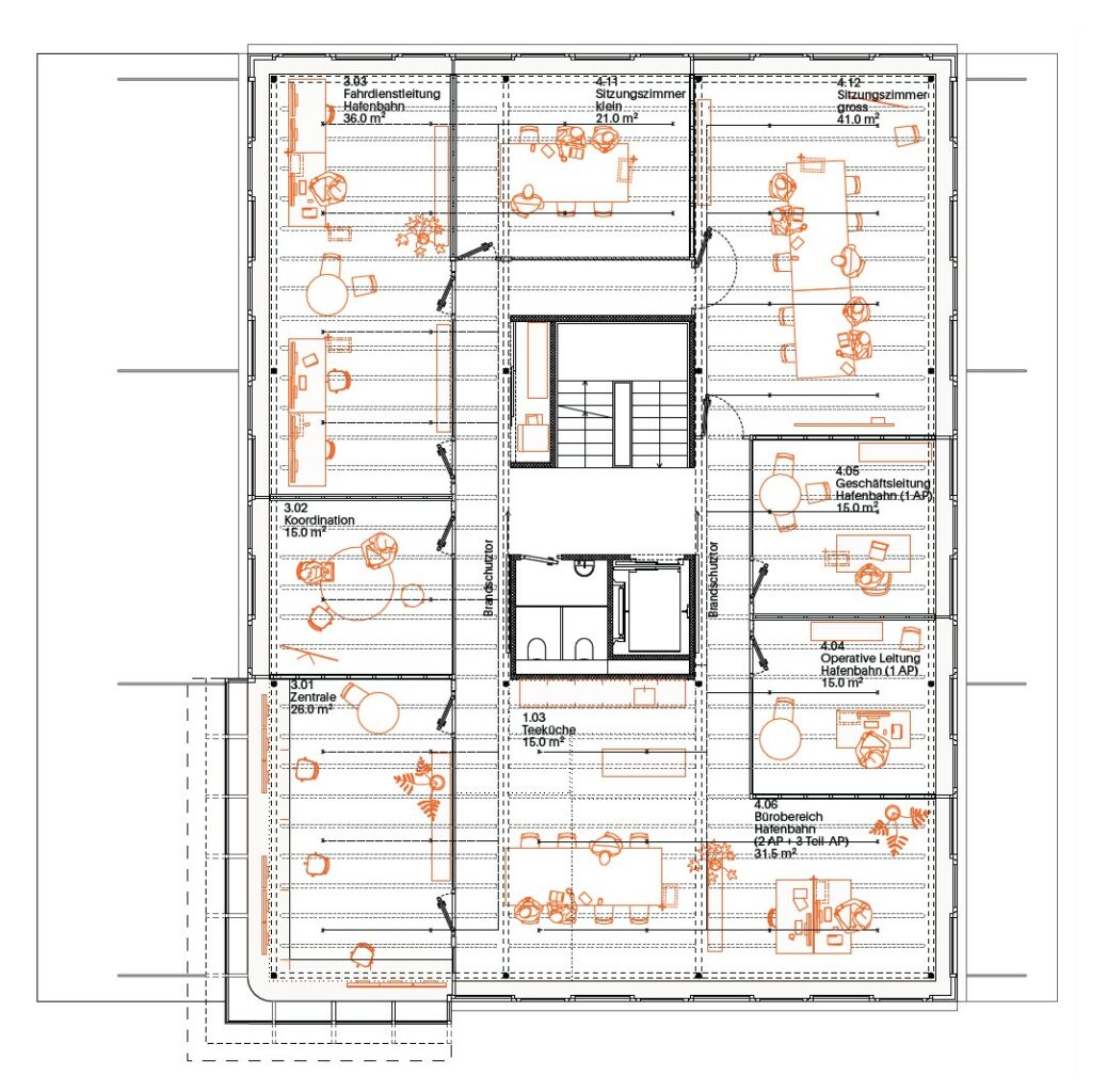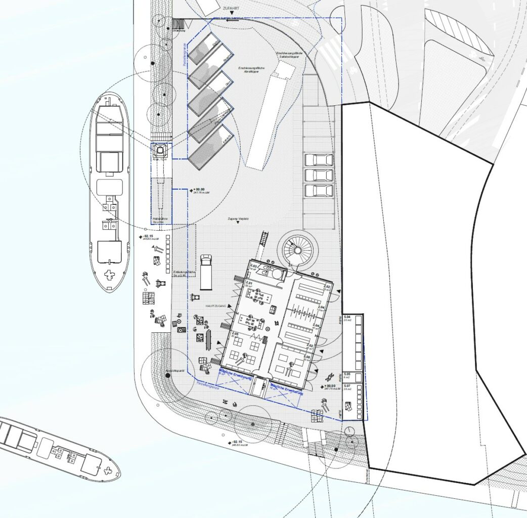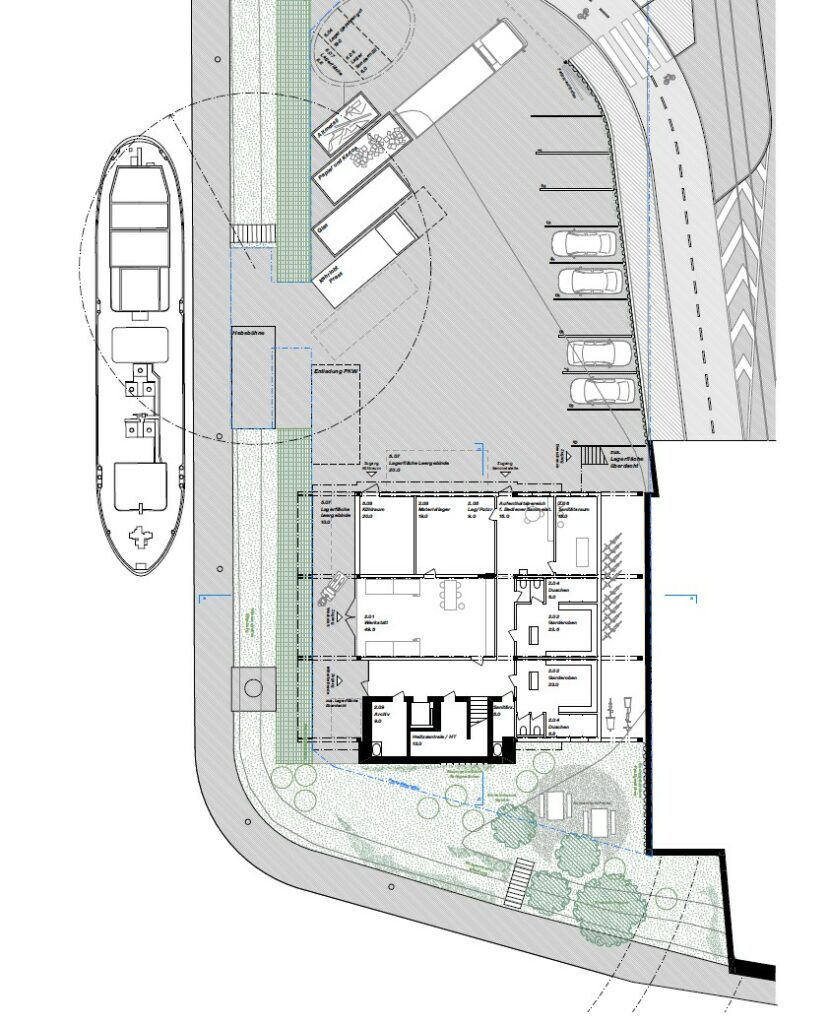 Die Kommandozentrale ist mit Sicht über die Hafenzufahrt im 6. Geschoss angeordnet, sie zeichnet sich durch die wasserseitig gekippte Glasfront in der Fassade ab. Auf den übrigen Geschossen erlaubt der neutrale Grundriss die flexible Einteilung der die Raumschichten entlang der Hauptfassaden. Auf der Hafenebene finden sich die Werkstätten, Falttore erlauben eine robuste Verschränkung dieser mit dem Aussenraum und Lieferbereichen, eine Aussentreppe schafft direkten Zugang zum Balkon, Treppenhaus und Lift verbinden die Werkstätten mit den Büroflächen der oberen Geschosse. Die Berme wird analog zur restlichen unbebauten Parzellenfläche im Originalzustand belassen, der Baum erhalten.