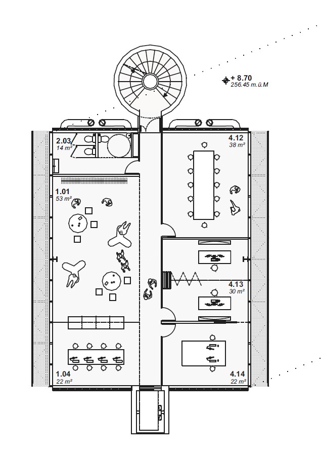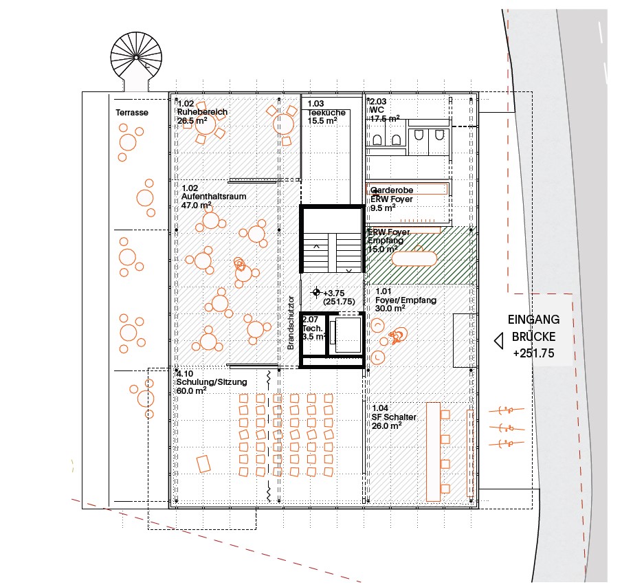 Das Projekt zeigt einen differenzierten Ansatz zur Erweiterbarkeit, der die langfristige Nutzbarkeit des Gebäudes gewährleistet. Einerseits wird vorgeschlagen, die unterhalb der westseitig gelegenen Terrasse zum Rhein liegenden Flächen für eine Vergrösserung der Werkstätten und Lagerräume zu nutzen. Diese Erweiterung respektiert den Aussenraum und integriert sich harmonisch in das bestehende Gebäudevolumen. Zudem kann das Foyer im Erdgeschoss erweitert werden, um eine höhere Frequentierung zu ermöglichen. Die Erweiterung der Büroflächen wird als Aufstockung auf dem Dach vorgeschlagen. Die im Grundbedarf enthaltene Dachterrasse mit Pergola, PV und Retentionsfläche muss dafür weichen, bzw. an anderer Stelle ersetzt werden.