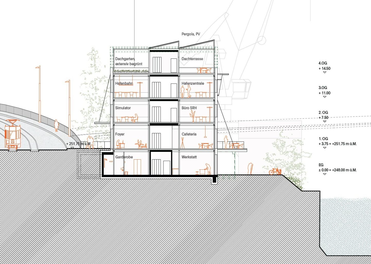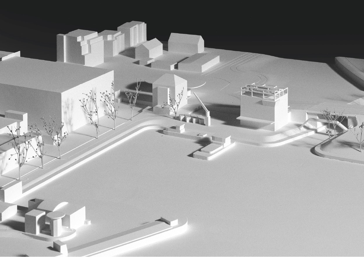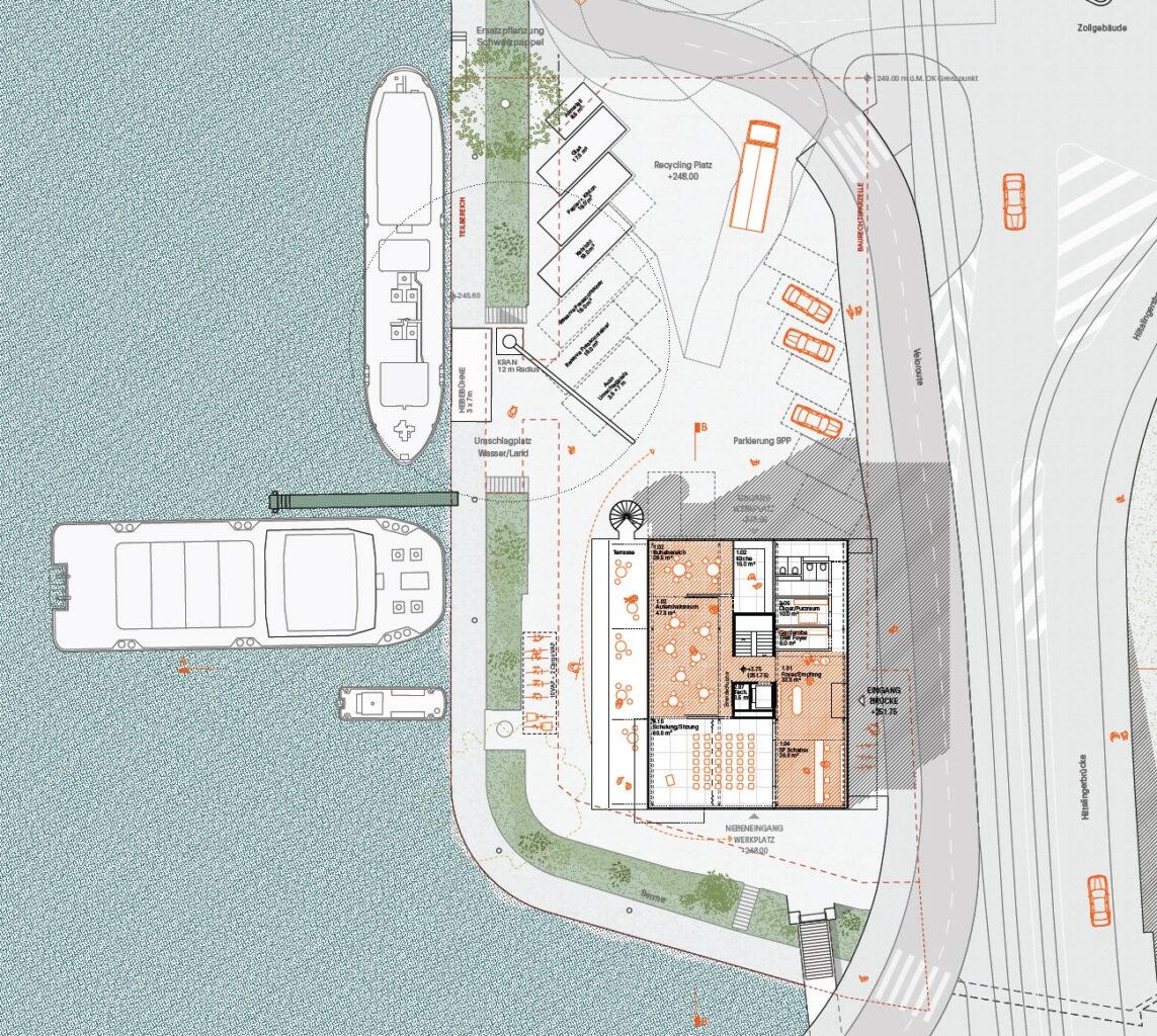 Der Neubau wird im Süden der Parzelle gesetzt, um einen umfassenden Überblick auf die Hafenbecken zu erhalten und die Hafeneinfahrt städtebaulich zu festigen, und um gleichzeitig einen möglichst zusammenhängenden Bereich für den Werkhof im Norden zu erhalten. Die Volumetrie der viergeschossigen Baute ist kompakt gehalten und bietet Platz für zukünftige Entwicklungen. Die Stahlstruktur auf dem Dachgeschoss wird in einer ersten Phase als gedeckter Aussenraum für die Mitarbeitenden genutzt und zeichnet von Anfang an die geplante Erweiterung des Verwaltungsbaus. Das markante und leicht erhöhte Treppenhaus an der Südfassade verankert das Gebäude und kündigt es stadtauswärtsfahrend an. Das Absetzen des Baukörpers von der Hiltalingerbrücke ermöglicht einen kleinen Vorplatz auf Strassenebene, der den Zugang für Besucher und Mitarbeitende markiert. Die Umgebung wird möglichst entsiegelt und zusätzlich begrünt. Dies geschieht vor allem im Übergang zur instandgesetzten Berme und im Süden der Parzelle. Ein neuer Pappelhain vor dem Treppenhaus wird zum erdgeschossigen Aussenraum für die Mitarbeitenden. Die Teilbegrünung des Treppenhaussockels sowie der neuen Stützmauer aus wiederverwendeten Spundwänden entlang der Hiltalingerstrasse soll die Biodiversität fördern und Nistplätze für Kleintiere bieten.