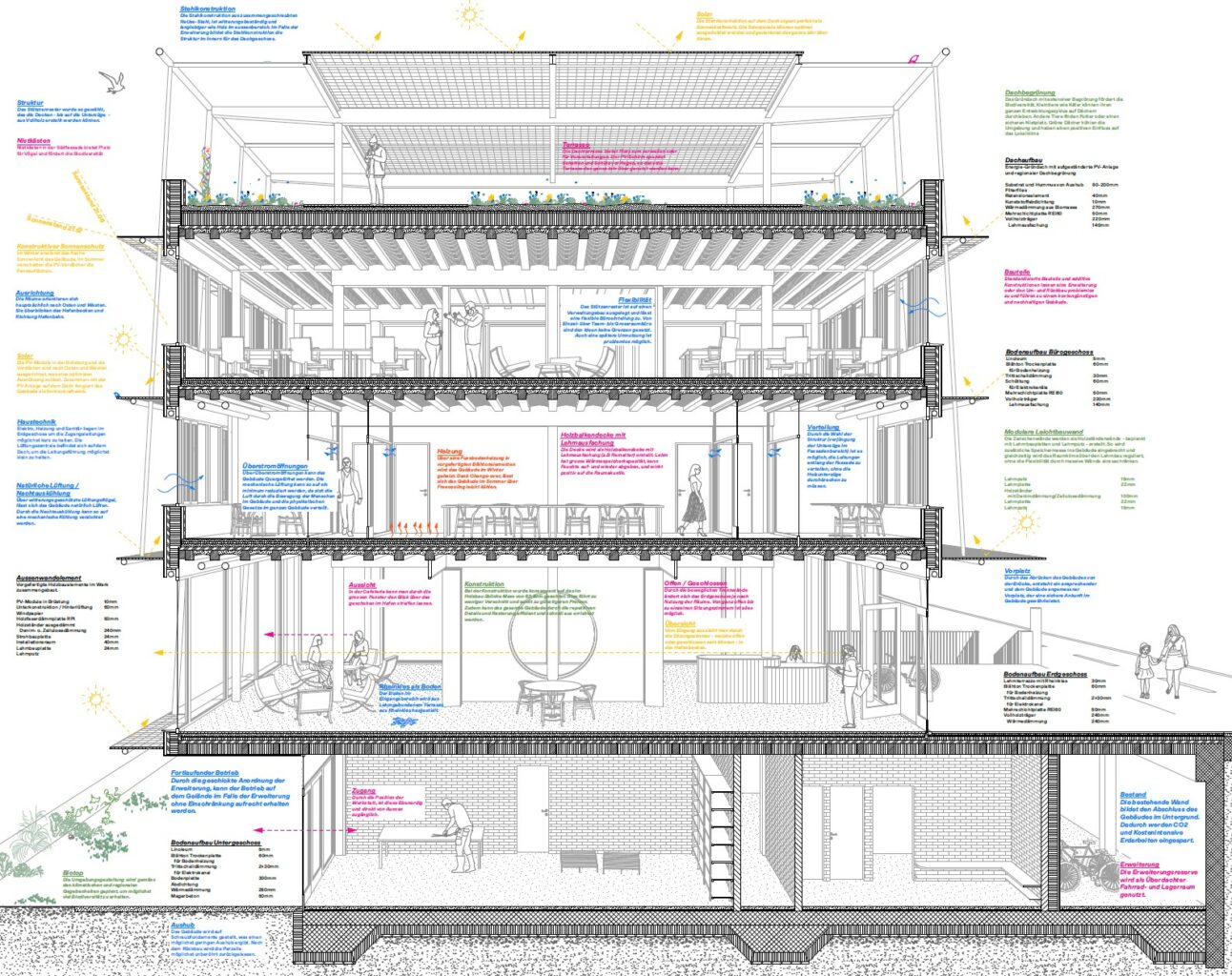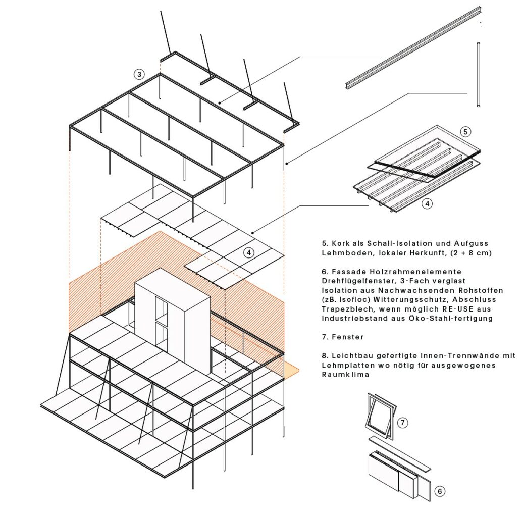Die Gliederung der Fassaden mit unterschiedlichen Baustoffen entsteht aus dem additiven Prinzip der Systemtrennung. So verleihen Fassadenbänder und Vordächer aus Photovoltaik-Paneelen dem Gebäude einen ruhigen Ausdruck und dienen der Energiegewinnung sowie der Verschattung der Innenräume zugleich. Eine vorgelagerte Stahlkonstruktion dient der unabhängigen Befestigung der Vordächer und bindet die 3 Obergeschosse. Der Hauptzugang an der Hiltalingerstrasse wirkt indes fast unscheinbar und untergeordnet. Auch im Innenraum wird auf den Einsatz von möglichst effizienten und nachhaltigen Materialien geachtet. Ein Holzskelettbau bietet eine hohe Flexibilität, vorfabrizierte Holzbalkendecken mit Lehmausfachungen ermöglichen eine schnelle Montage und lösen die Anforderungen an das Innenraumklima und die Akustik, und mit Lehmbauplatten beplankte Leichtbauwände regulieren bei Bedarf die Raumfeuchtigkeit.