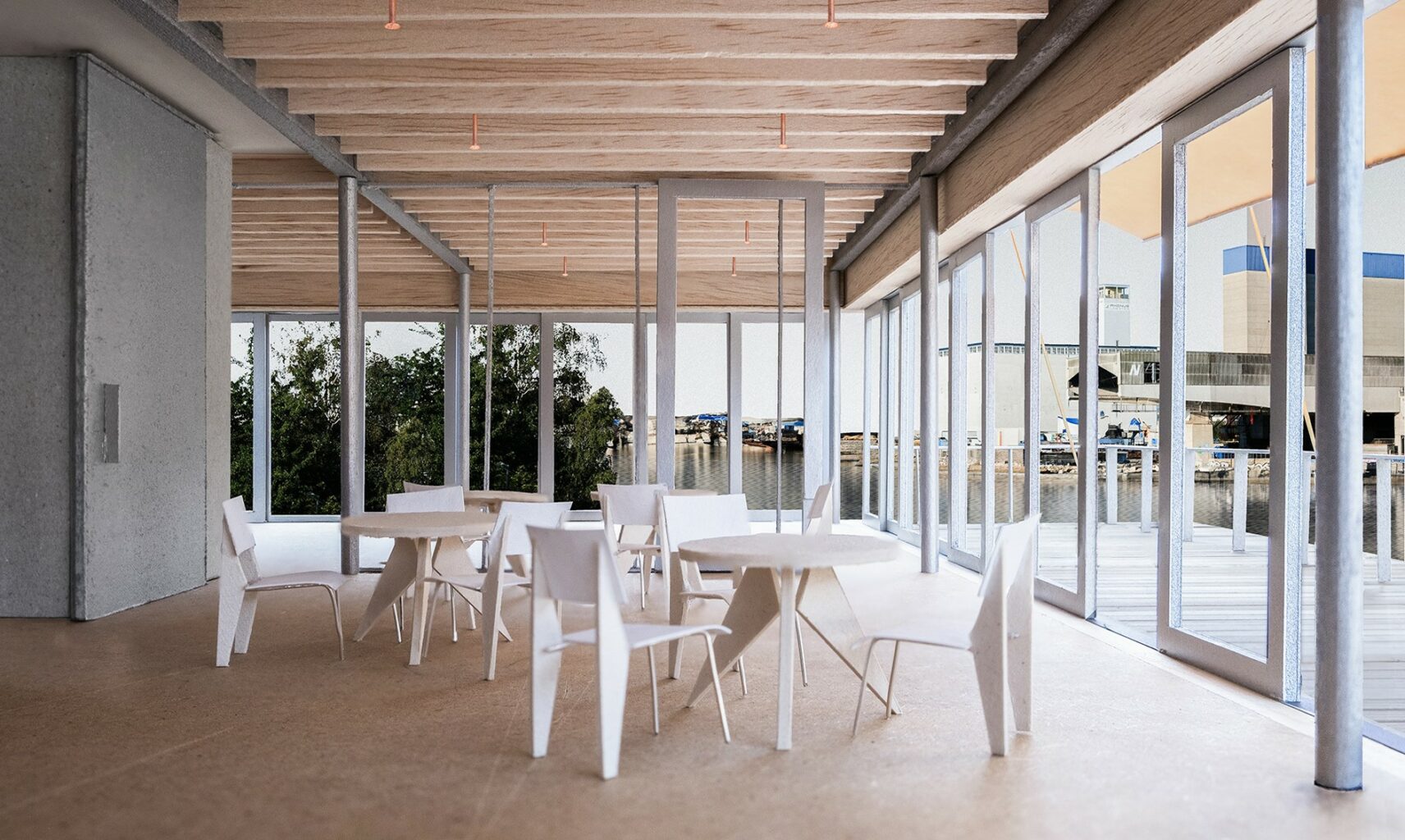 Die architektonische Gestaltung wird durch eine klare Material- und Konstruktionswahl geprägt, die sowohl funktional als auch ästhetisch kohärent ist. Der zentral angeordnete Erschliessungskern besteht aus Beton und bietet eine robuste Basis für die Gesamtstruktur. Die Primärstruktur des Gebäudes, geplant als ökologische Stahlbauweise, trägt Holzelemente, die den Decken aufliegen. Diese Hybridkonstruktion aus Stahl und Holz verdeutlicht das Bestreben nach Nachhaltigkeit und Ressourcenschonung. Auch die Fassadenkonstruktion ist aus Holz konzipiert, während die Verkleidung aus weissem, wiederverwendetem Trapezblech Bezug auf die industrielle Materialität des Hafengebiets nimmt. Dies verankert das Gebäude kontextuell in seiner Umgebung, ohne seine eigenständige Architektursprache zu verlieren. Die grosszügige Verglasung sorgt für helle, offene Arbeitsräume, während der aussenliegende Sonnenschutz für ein angenehmes Raumklima sorgt. Die industrielle Materialität des Stahl-Holz-Verbunds verspricht eine hochwertige und zugleich funktionale Arbeitsumgebung. Bemerkenswert ist der Umgang mit dem Brandschutz: Die Verfasserschaft schlägt den Einsatz eines Sprinklersystems vor, das es ermöglicht, die Stahlkonstruktion offen und sichtbar zu belassen. Dies verleiht dem Gebäude eine rohe, ehrliche Materialität, erfordert jedoch eine komplexe Sprinklerinstallation. Eine Sprinklerzentrale, die für diesen Ansatz notwendig ist, fehlt jedoch noch in der aktuellen Planung.