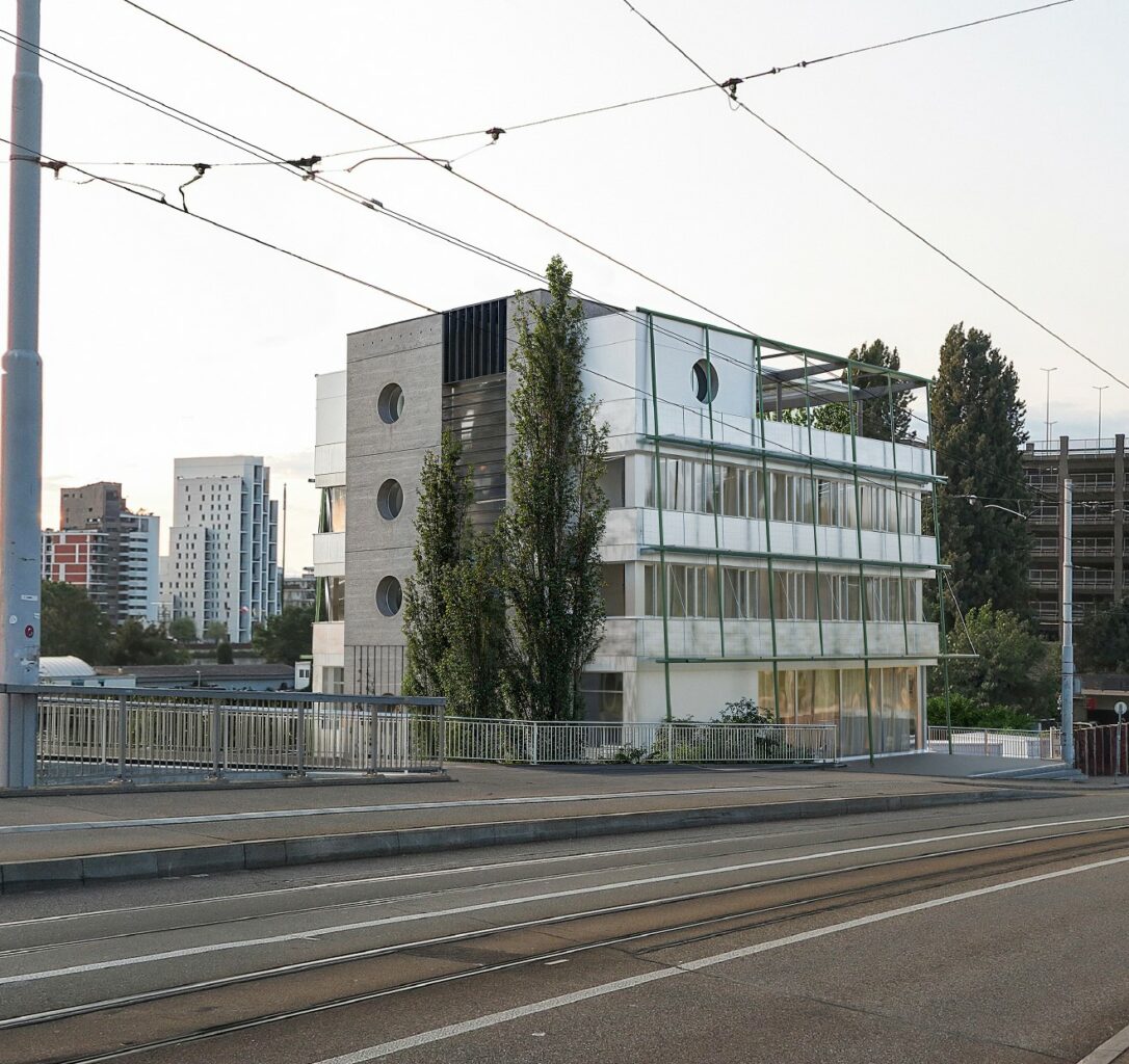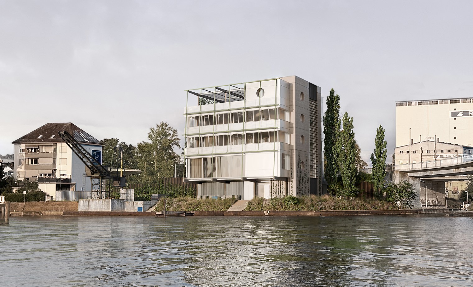 Der Entwurf stellt ein funktionales, allseitig orientiertes Bauwerk vor, das sich durch seine präzisen und reduzierten architektonischen Gesten auszeichnet. Diese Zurückhaltung fördert die Klarheit der konzeptionellen Absichten. So wird das einfache, kubische Volumen zur Brücke hin durch ein Vordach ergänzt, welches die Eingangssituation betont und klar definiert. Zur Rheinseite hin erhält die Fassade durch ein weiteres Vordach eine Gliederung, das nicht nur der architektonischen Lesbarkeit dient, sondern auch als Gemeinschaftsterrasse genutzt wird. Diese Terrasse schafft eine wertvolle soziale Schnittstelle zwischen Innen- und Aussenraum und lädt zur Interaktion ein. Die streng gerasterte Fassade wirkt funktional, doch der hohe Glasanteil verleiht ihr eine einladende Transparenz. So entsteht ein durchlässiger Dialog zwischen dem Inneren des Gebäudes und seiner Umgebung. Die Dachterrasse mit Pergola und Photovoltaikanlage bildet den krönenden Abschluss der vertikalen Dimension. Die innere Organisation des Gebäudes um den zentralen Erschliessungskern ermöglicht eine sinnvolle Raumnutzung und betont die Allseitigkeit des Baukörpers.