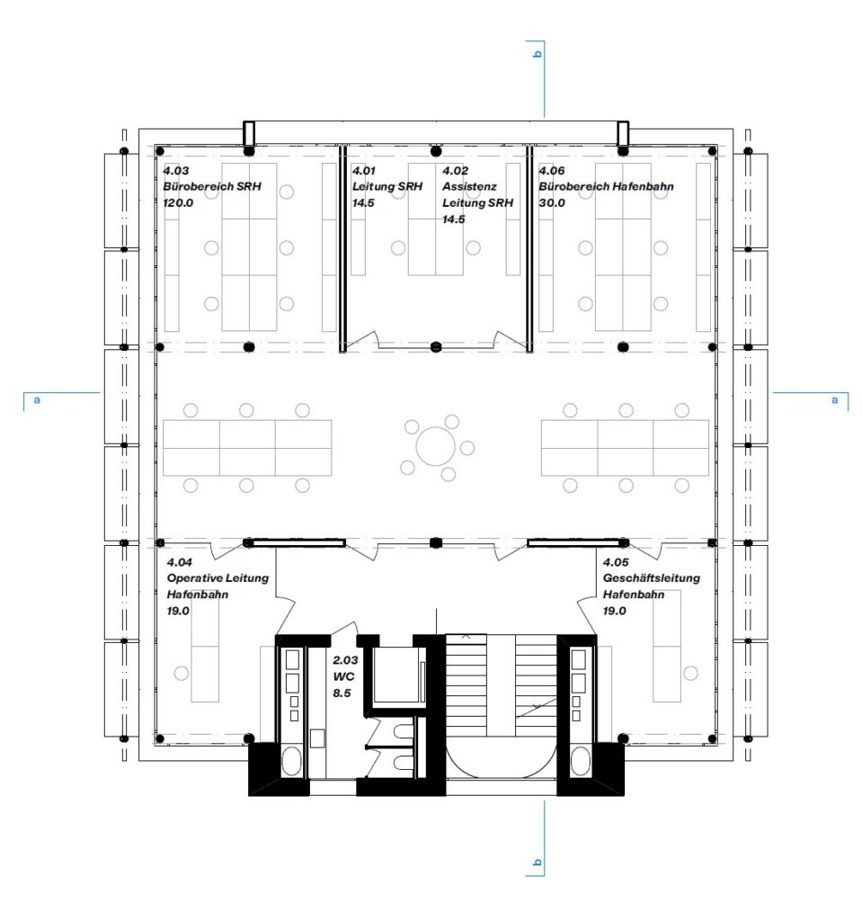 Die städtebauliche Präsenz des Gebäudes wird durch die Integration des zukünftigen Raumbedarfs im Gebäudevolumen erkauft: jedes zweite Geschoss ist im Grundausbau als Mezzanin ausgebildet. Die resultierende grosszügige Raumwirkung mit Nutzungsclustern über zwei Etagen bildet einen spannenden Kontrast zu den komprimierten Vertikalerschliessungen. Funktional wird die akustische und räumliche Interferenz zwischen den Geschossen kritisch betrachtet, ebenso die mindestens sequentielle Nutzungseinschränkung während des Einbaus der zusätzlichen Nutzflächen. Der Hauptzugang ist unmittelbar aus dem Luftgeschoss über den Lift in die offenen Arbeitsebenen vorgesehen, der Zugang vom Treppenhaus nimmt eine nachgeordnete Rolle ein, er wird von den Sanitärräumen und der Teeküche flankiert. Die zweiseitige Erschliessung führt zumindest im öffentlichen Bereich zu funktionalen Herausforderungen, da die Bewegung der Besuchenden durch das Haus nicht vollends antizipierbar ist und im Treppenturm selbst eine effiziente Barriere zur Abgrenzung der nichtöffentlichen Geschosse geschaffen werden müsste. Grundsätzlich wird das Fehlen eines Schwellenraumes bedauert. Der Hafenbalkon kann in seiner städtebaulich motivierten Offenheit den betrieblichen Ansprüchen an Adressierung, Empfang und Triage noch nicht gerecht werden.