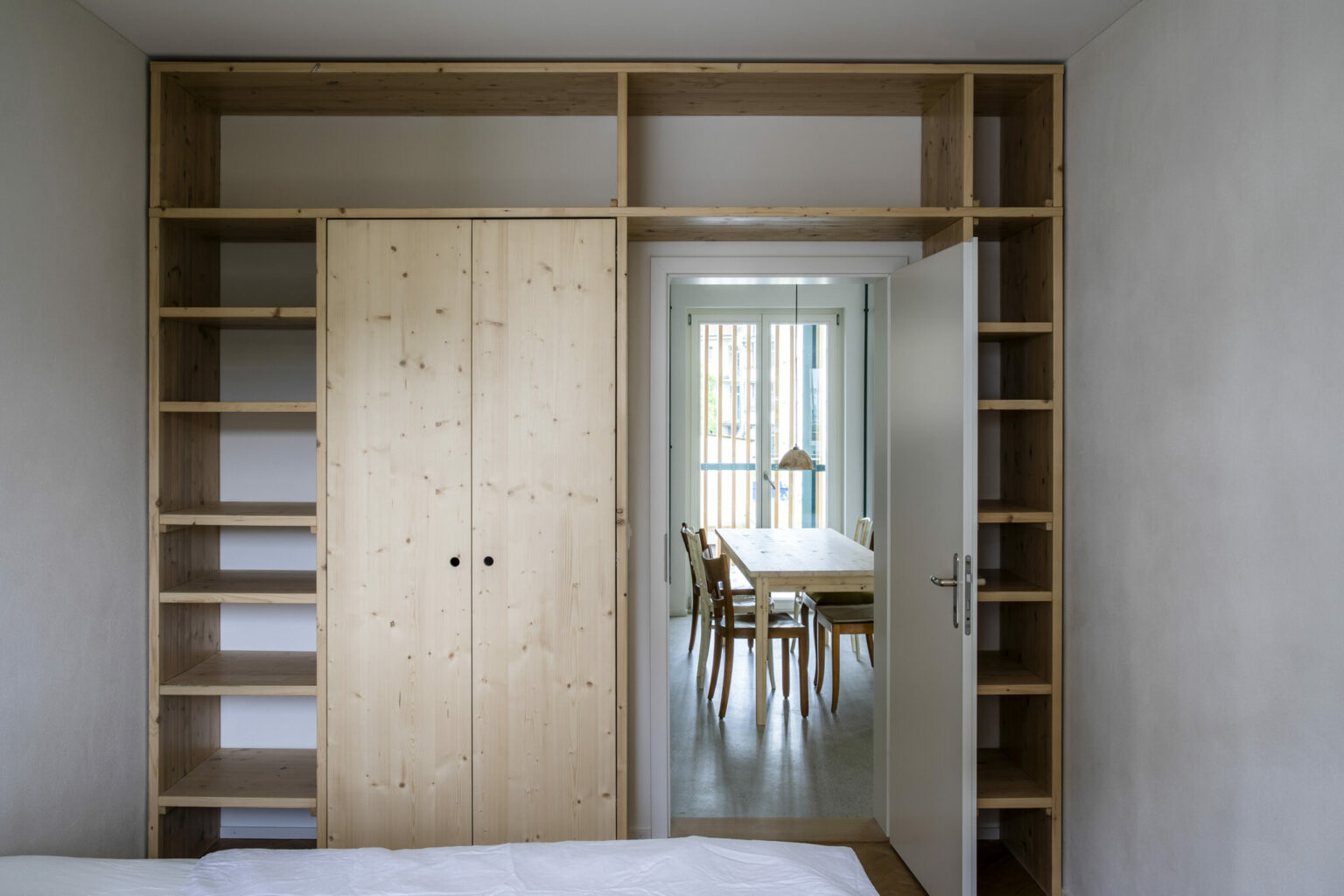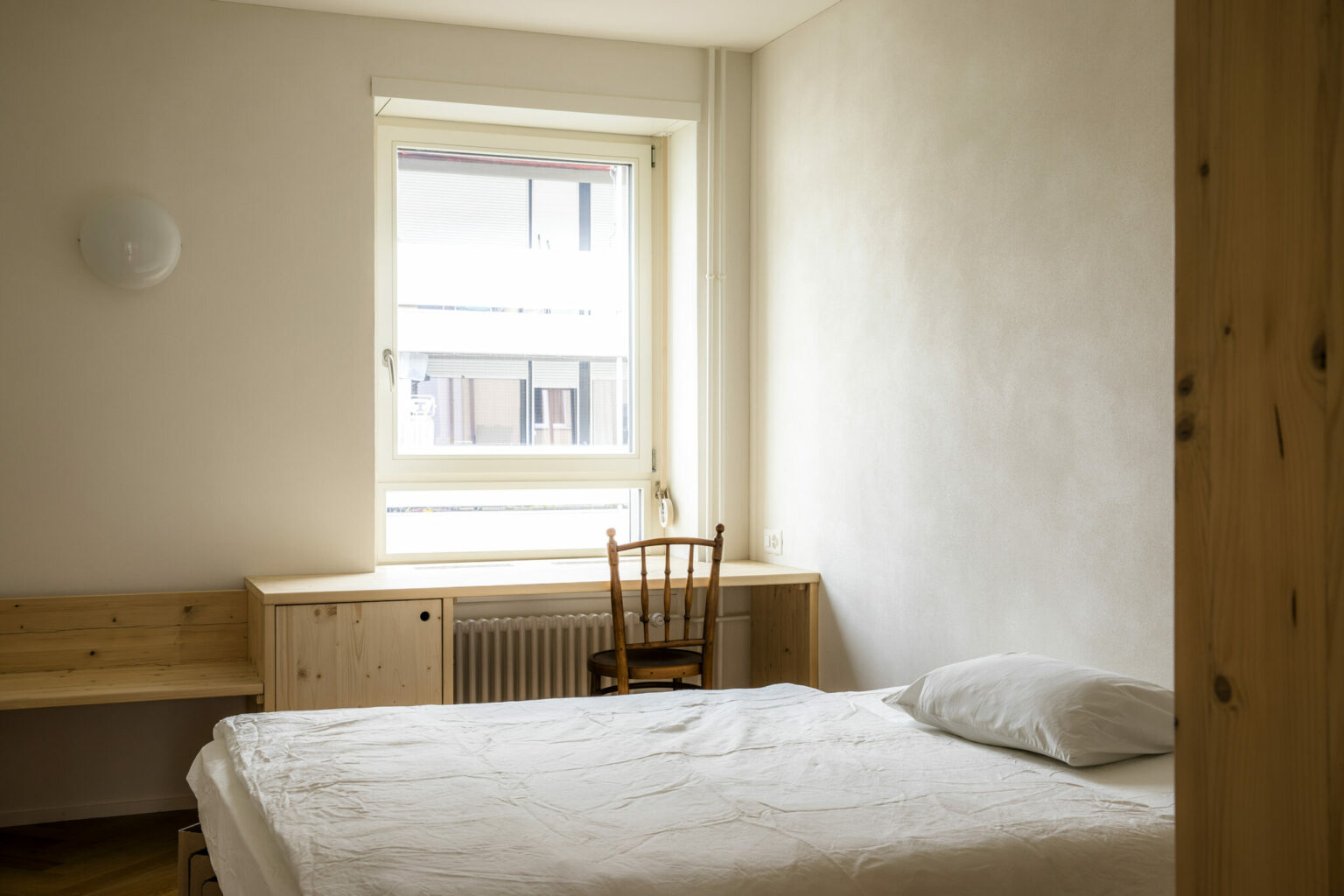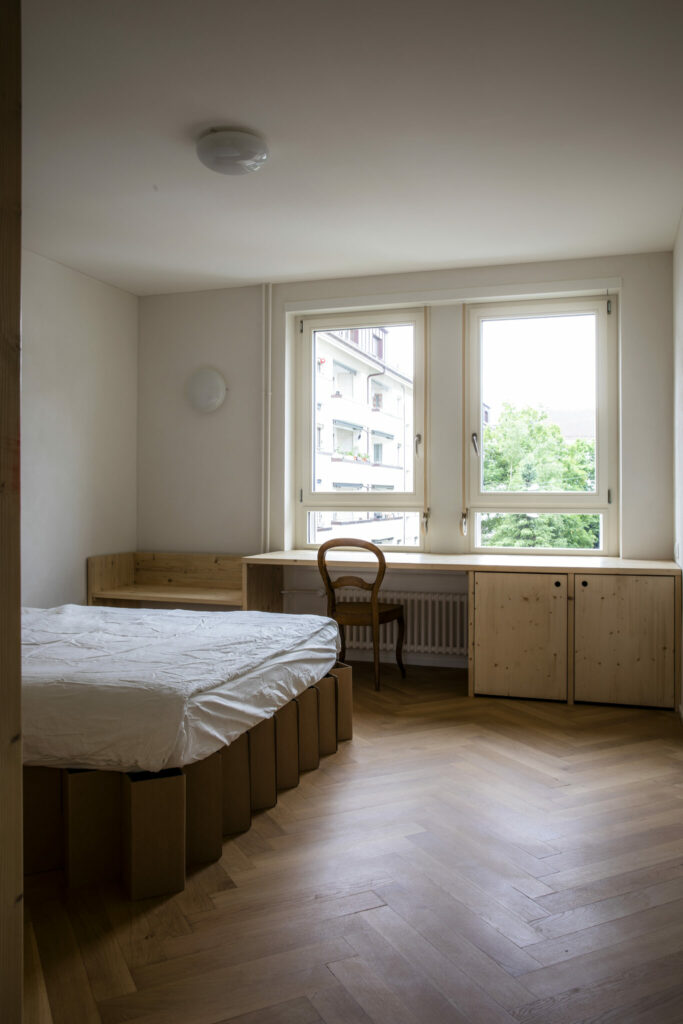 "Myzelium ist ein Projekt, das ich parallel zur Architektur gemeinsam mit Freunden unter dem Namen EMO Objects betreibe. Uns interessiert das Material, seine radikale Nachhaltigkeit und die gestalterischen Möglichkeiten, die sich eröffnen. In Bezug auf WG29 war es mir ein Anliegen, die Wohnungen, die möbliert vermietet werden, mit den wesentlichen Möbeln und Objekten auszustatten. Auf diese Weise werden die Lernenden und Studierenden davon entlasten, die Möbel selber kaufen zu müssen. Darüber hinaus war es mich wichtig, mit den Einbaumöbeln aus Gerüstdielen oder den Leuchten aus Myzelium gestalterisch klare Akzente zu setzen, die den Wohnungen einen spezifischen Charakter verleihen. Der klassische Wohnungsmarkt ist geprägt von einer weitestgehenden Nüchternheit und Reduktion, die nicht zuletzt in einer Optimierung der Baukosten begründet liegt. Hier möchten wir dagegenhalten. Robuste Einbaumöbel haben eine grosse Qualität. Sie optimieren den nutzbaren Wohnraum, sind nachhaltig durch ihre lange Nutzungszeit und prägen die architektonische Atmosphäre eines Raumes."