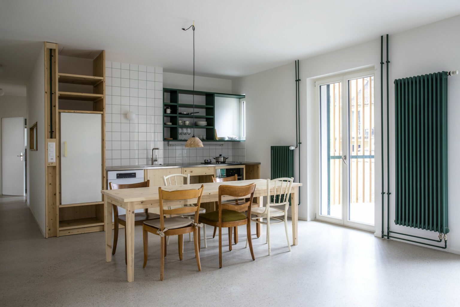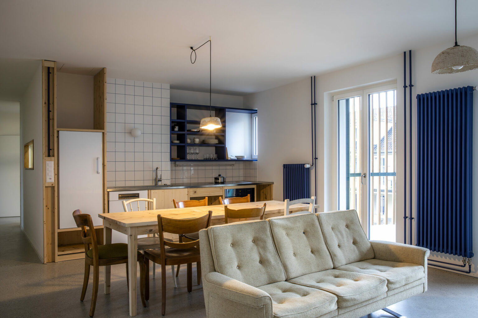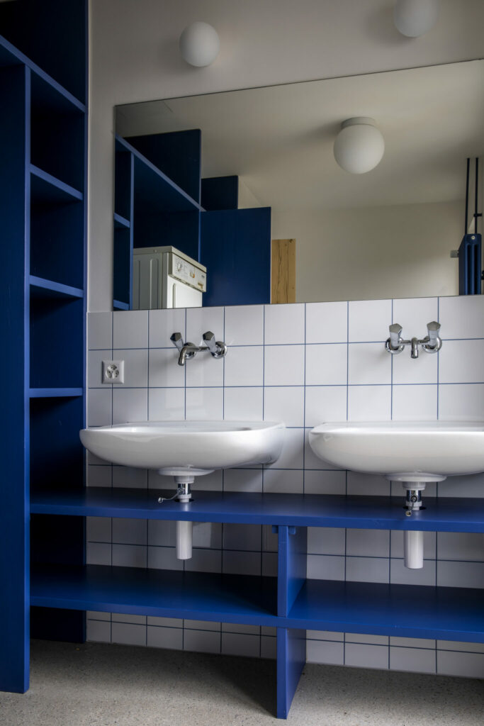 "Es ist beides. Die gestalterische Haltung entwickelt sich gewissermassen aus der pragmatischen Strategie. Wenn man mit Re-Use arbeitet, dann wird der Entwurf noch viel stärker zu einem Prozess, der lange offen bleibt und sich oft erst mit dem konkreten Material oder dem gefundenen Objekt konkretisiert. Dieser Prozess erfordert Spontanität, schnell und unverkrampft auf neue Gegebenheiten zu reagieren. Mich reizt aber auch die gestalterische Herausforderung. Man arbeitet mit dem, was man findet und das ist teilweise nicht das „Schönste“. Beispielsweise stammen die Plättli in den Badezimmern und der Küche aus Lagerbeständen und waren für die Mulde bestimmt. Die Plättli sind eher langweilig weiss. Um sie aufzuwerten und ihnen gestalterisch einen Twist zu geben, haben wir farbige Fugen verwendet."