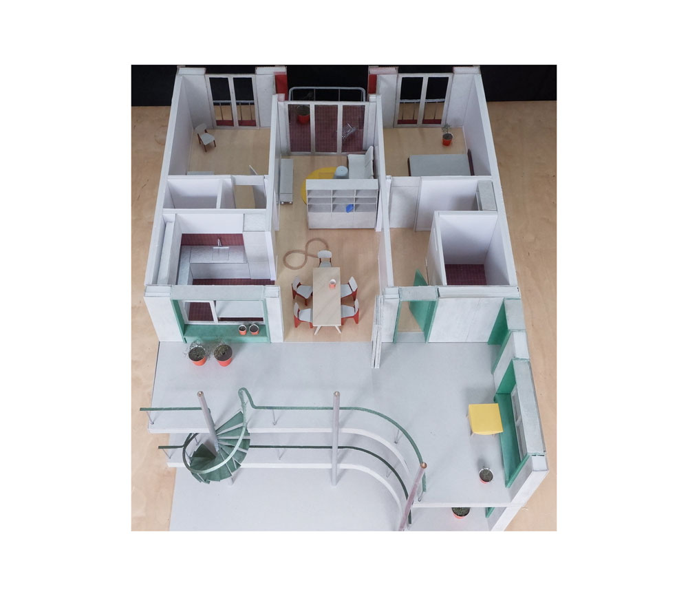 Der von den Verfassern entwickelte Baustein mit dem von der Stadtebene losgelösten Gartenhof bildet eine in sich abgeschlossene Einheit. Dies stärkt seine Stellung als Kopfbau. Mit der vollständigen Überbauung des Innenhofes im Erdgeschoss und der treppenartigen Öffnung der darüberliegenden Geschosse unterscheidet sich der Charakter des neuen Innenhofs auffällig stark vom bestehenden grossen Wohnhof. Der grosse Hof wird durch diese Geste räumlich geschlossen und dadurch klar gefasst. Indem die gesamte Erdgeschossfläche des Kopfbaus überbaut wird, bietet sie ein gutes Potential für die noch nicht abschliessend bestimmte Erdgeschossnutzung und trägt zur Wirtschaftlichkeit des Projektes bei. Die «Dichte des Zusammenlebens» am kleinen Innenhof ist nochmals höher und wird von den Verfassern durch die Wahl der Erschliessung und Gestaltung der Wohnungen als spezifische Qualität interpretiert. Es entsteht der Eindruck eines kollektiven Wohnmodells mit experimentellen Ansätzen. Die Erschliessung der Wohnungen über den grossen Hof entspricht dem Konzept des Regelwerks der übrigen Bausteine und verhilft zu einer einfachen Adressierung. Die beiden Treppenhäuser sind sinnvoll in den Kreuzungspunkten der Lauben verortet, die Erschliessung mit zwei Treppen und zwei Liften ist sehr ökonomisch. Die beiden Eingangshallen mit den räumlich geschlossenen Treppen dürften aufgrund der Bedeutung allerdings etwas grosszügiger sein. Die Austritte in den Obergeschossen führen zu den Laubengang-Anbindungen der benachbarten Bausteine. Hier fehlt es an Sichtbezügen in den Innenhof des Kopfgebäudes – womit die Orientierung und der Zugang erschwert werden.