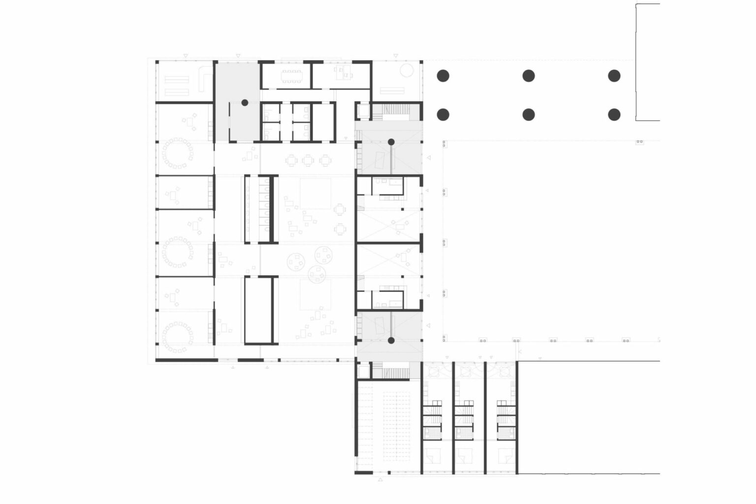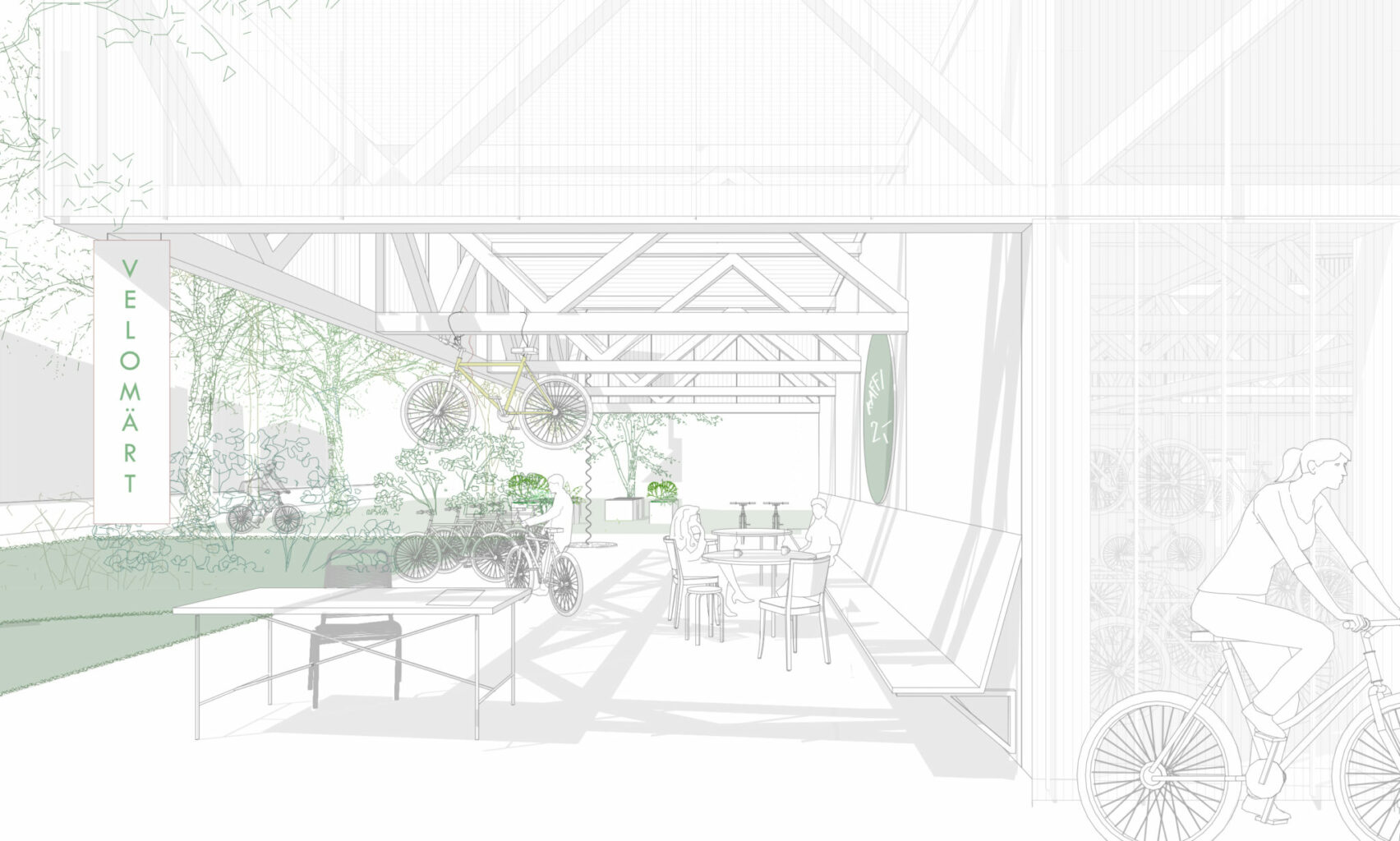 Das Sockelgeschoss nimmt öffentliche Nutzungen wie die Kinderbetreuung und kleine Gewerbeflächen am Forum auf. Durch eine geschickte Anordnung entsteht eine nachhaltige Flexibilität in Bezug auf die Nutzung der Flächen. So kann die Spielhalle tagsüber für die Kinderbetreuung genutzt werden, am Abend und an den Wochenenden über einen separaten Zugang durch die Bewohnerinnen und Bewohner des Westfelds. Gleichzeitig ermöglicht die flexible Struktur längerfristig auch eine Nutzungsänderung. Die Erschliessung der Wohnungen erfolgt vom allgemeinen Wohnhof aus über zwei Treppenhäuser und Laubengänge in den Obergeschossen. Diese bilden eine selbstverständliche Fortsetzung des bereits in der ersten Etappe etablierten Erschliessungssystems. Gleichzeitig erschliessen die beiden Treppenanlagen über ein geschicktes Wegesystem – den Nachteilen des Laubenganges entgegenwirkend – sämtliche Wohnungen im Kopfbau.