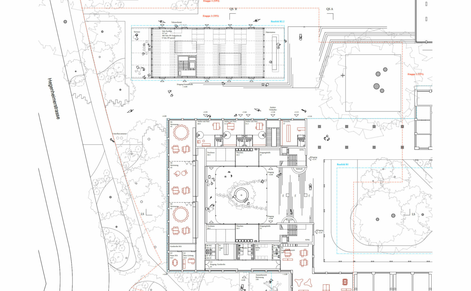 Es sind eindrückliche Dimensionen: Auf der über 35'000 Quadratmeter grossen Parzelle entstehen rund 530 Genossenschaftswohnungen. In der ersten Bauetappe werden auf dem für die Neubauten vorgesehenen Arealteil bis 2023 rund 315 Wohnungen realisiert (Teilprojekt 1), weitere 130 Wohnungen entstehen im umgenutzten Spitalgebäude (Teilprojekt 2). In der zweiten Bauetappe werden ab 2024 nochmals 70-80 Wohnungen gebaut (Teilprojekt 3). Das Teilprojekt beinhaltet einen Kopfbau als Abschluss des Blockrands zur Hegenheimerstrasse, ein viertes pavillonartiges Gebäude zwischen dem alten Spital und den Neubauten sowie eine Erweiterung der Autoeinstellhalle der ersten Bauetappe. Hinzu kommen in allen Teilprojekten Flächen für Quartiernutzungen, Dienstleistungen, Kleingewerbe und Parkierung. Um die überzeugendste Lösung für die zweite Bauetappe zu finden, lud "wohnen&mehr" im Herbst 2021 fünf Architektenteams zu einem Studienauftrag ein. Die Jury lobte, "dass sich alle Teams sehr intensiv, mit je eigenen Lösungsansätzen und auf ausgesprochen hohem qualitativem Niveau mit der gestellten Aufgabe auseinandergesetzt haben." Wir werfen einen Blick auf alle fünf Beiträge.