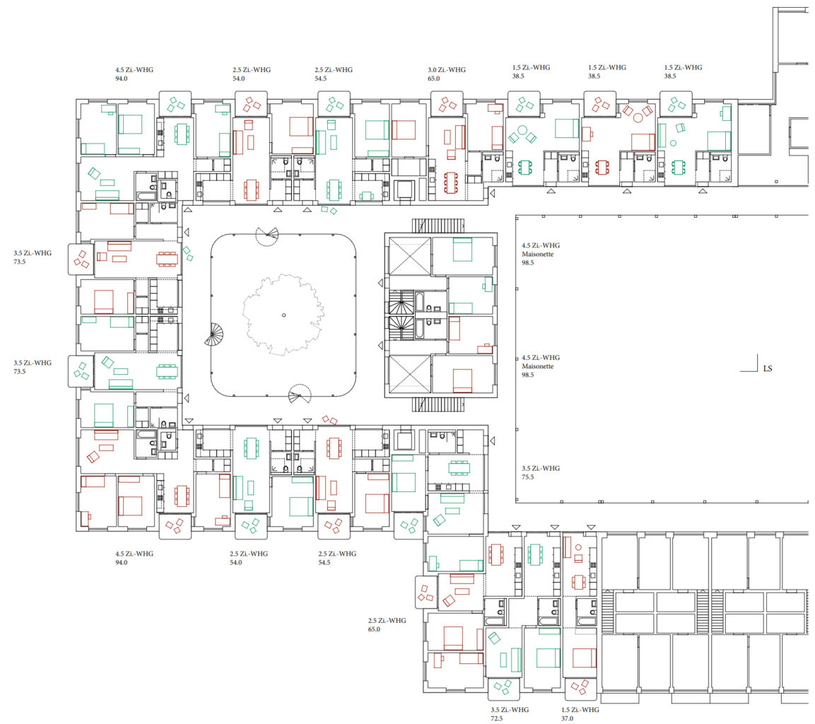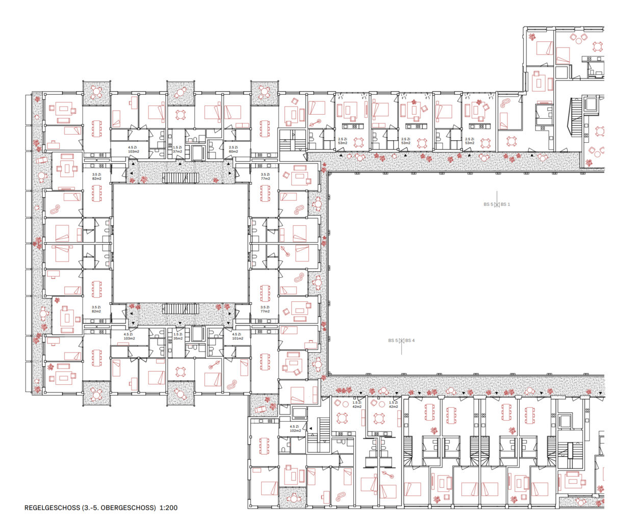 Durch die Anordnung der Wohnungen werden die notwendigen Erschliessungsbereiche auf ein Minimum reduziert. Durch die fehlenden Laubengänge im Bereich der Maisonettewohnungen kann deren Belichtung optimiert werden. Die zwischen den hofseitigen Fassaden gewonnene Distanz lässt trotz der räumlichen Nähe eine gewisse Privatheit der dahinter liegenden Räume entstehen. Gleichzeitig vermitteln die beiden übereinander gestapelten Maisonette-Typologien das Bild von aneinander gereihten Reihenhäusern, was im Kontext des vorhandenen städtischen Raums und des genossenschaftlichen Wohnungsbaus allenfalls etwas fremd erscheinen mag. Eine über alle Obergeschosse reichende Öffnung des kleinen Hofs zum Grünstreifen entlang der Ensisheimerstrasse verleiht diesem eine wohltuende Grosszügigkeit, ermöglicht eine gute Belichtung der Wohnungen und sorgt für eine ausreichende Belüftung dieses gemeinschaftlichen Aussenraums. Der einseitig offene Hof findet mit der durchlaufenden Schicht der Laubengänge und Terrassen an der Fassade einen filigranen, räumlichen Abschluss. Die vorgeschlagene Nutzbarkeit dieser Erschliessungsbereiche muss aufgrund der feuerpolizeilichen Bestimmungen in einer weiteren Bearbeitung überprüft werden. Ebenso soll die von innen gewünschte Transparenz – in Abstimmung mit der äusseren Erscheinung des kraftvollen Schlusssteins der Bebauung – weiter gestärkt werden. Die Vielfalt der unterschiedlichen Wohnungen und Typologien ergänzt das vorhandene Angebot auf dem Areal sehr gut. Die kleinen Studiowohnungen über dem Durchgang zum Quartierplatz vermitteln zwischen den Bausteinen 1 und 5, während mit den Geschosswohnungen zur Ensisheimerstrasse hin ein selbstverständlicher Anschluss an den Baustein 4 gewährleistet wird. Im Weiteren sind neben den 13 Maisonettewohnungen Geschosswohnungen unterschiedlicher Grösse sowie Atelierwohnungen vorgesehen. Mit dem Öffnen des Hofs wird auch für die zwischen den beiden Höfen gelegenen Wohnungen eine überzeugende Wohnqualität geschaffen. Die Wohnungen am Dachgarten im ersten Obergeschoss sollten jedoch unter Berücksichtigung ihrer besonderen Lage und der vorhandenen Einsehbarkeit noch weiterentwickelt werden.