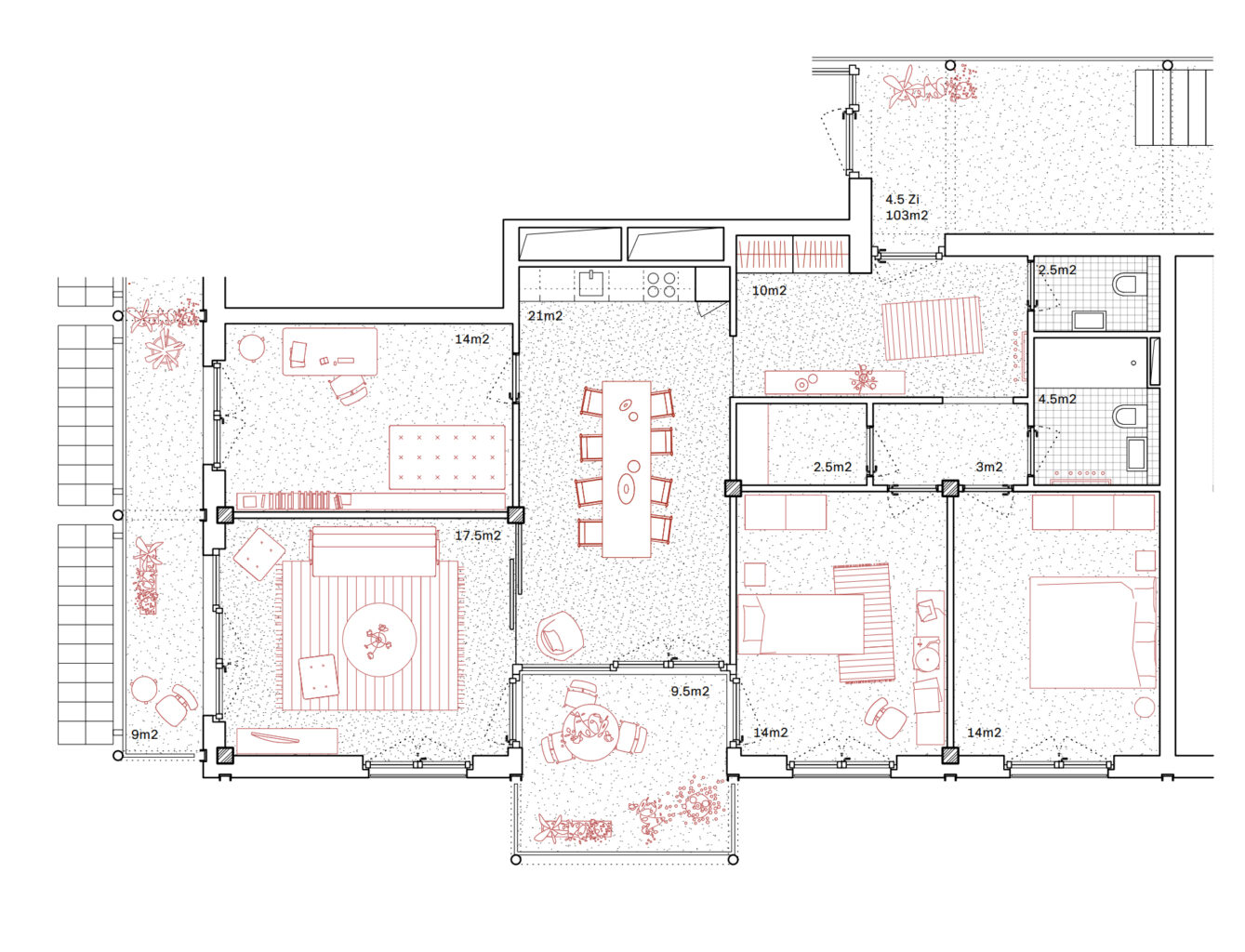 Sowohl der Gesamtgrundriss wie auch die Schnittlösung wirken aufgeräumt und klar. Der Gedanke der gelebten Nachbarschaft ist grundsätzlich interessant. Im vorliegendem Projekt wird er jedoch überstrapaziert, weshalb dem Baustein 5 eine allzu grosse Sonderstellung im Gesamtkontext zuteil wird. Der mit einer prominenten Treppen- beziehungsweise Rampenanlage artikulierte Übergang vom grossen, längs gerichteten Wohnhof zum schachtartigen, stark vertikal orientierten Hof im Baustein 5 verstärkt diesen Eindruck. Die Absicht der Projektverfasser, die beiden Höfe auf Erdgeschossniveau zusammenzubinden, gelingt hier nicht im gewünschten Masse. In den Obergeschossen bildet eine durchgehende Laubengangtypologie das zentrale Element der gelebten Nachbarschaft. Den Laubengang sehen die Projektverfasser nicht nur als Erschliessung, sondern ebenso als Treffpunkt, erweiterten Aussenraum und «Vorgarten» der Wohnung.
