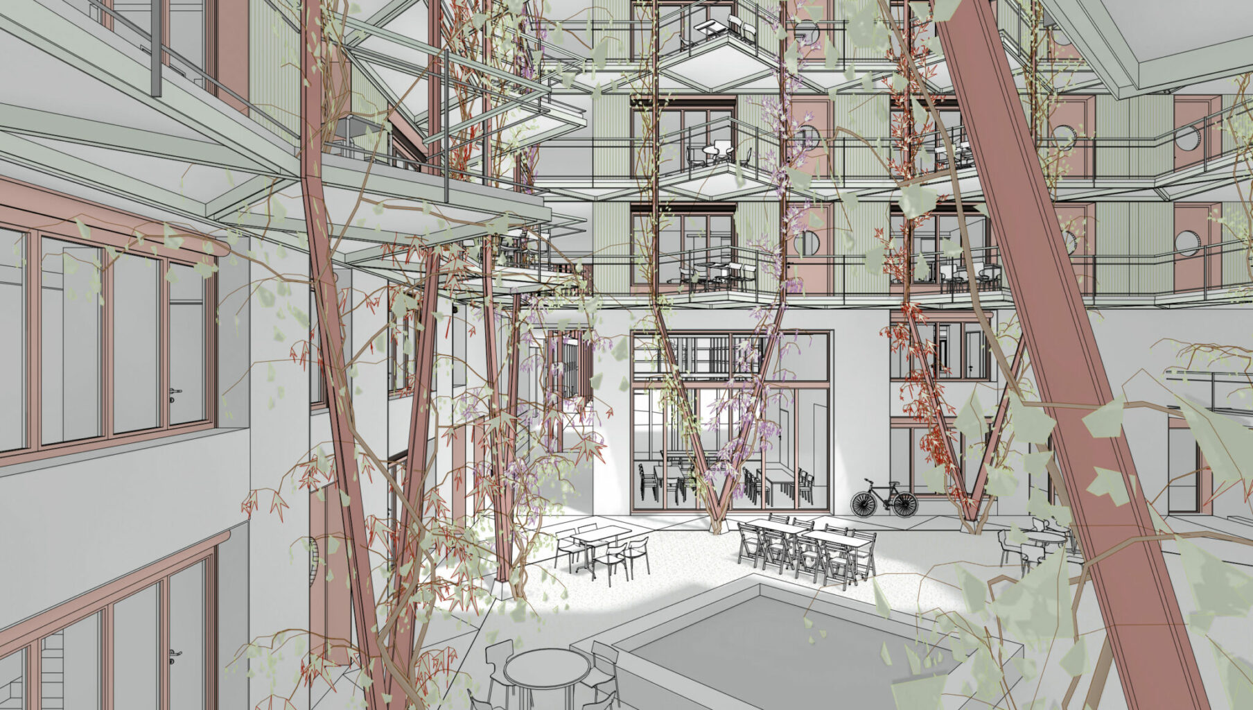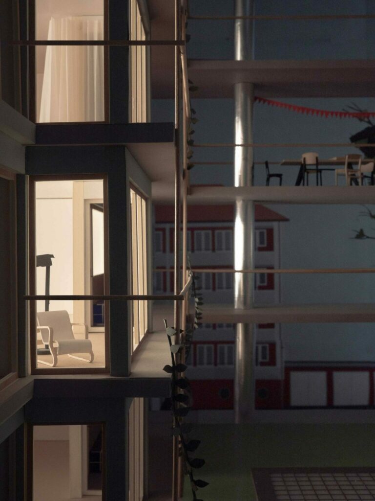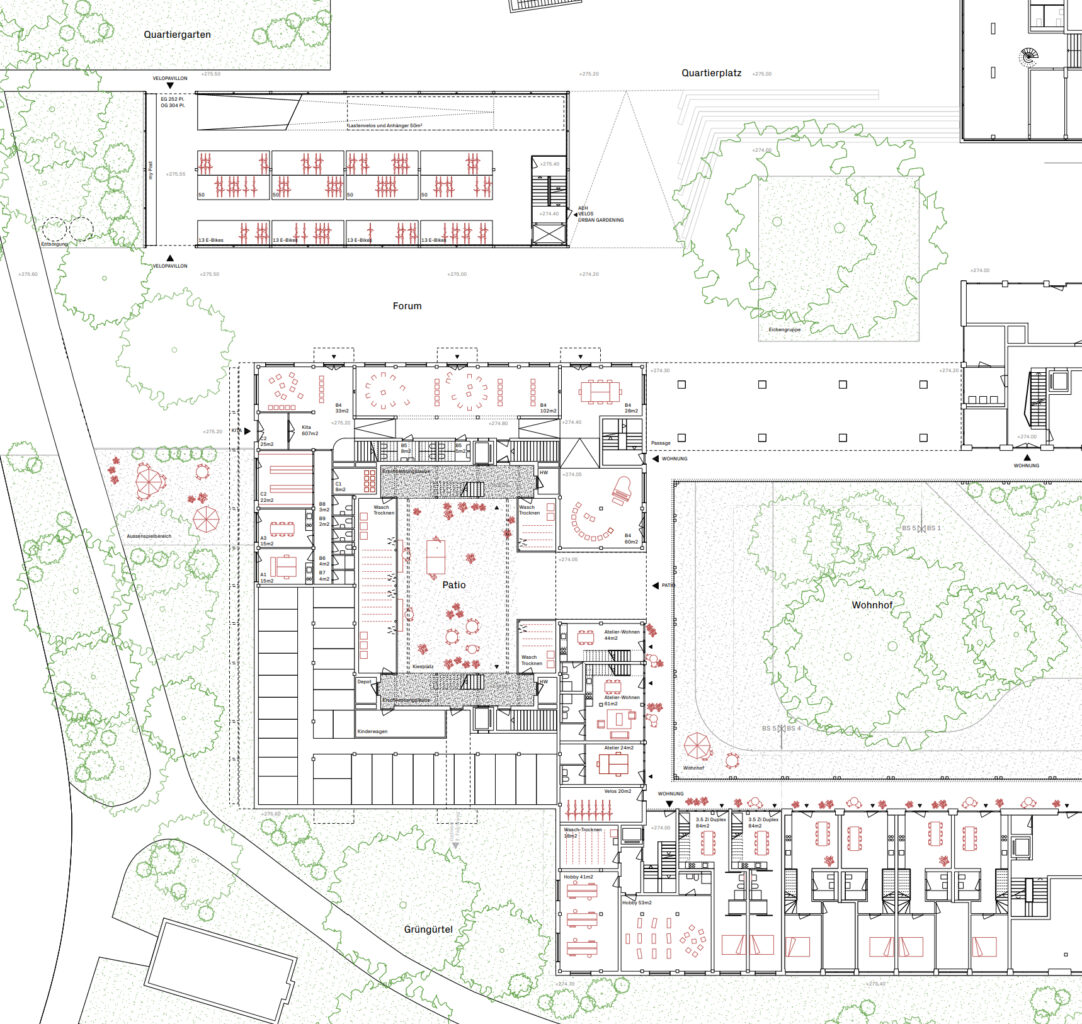 Alle Wohnungen werden über den Innenhof erschlossen, den die Verfasser als Patio verstehen. Dieser liegt entgegen dem Terrainverlauf abgesenkt auf ähnlichem Niveau wie der grosse Wohnhof. Ein doppelgeschossiges Portal verbindet die beiden Höfe. Diese Öffnung begünstigt durch den Kamineffekt eine genügende Durchlüftung und Nachtauskühlung. Zur räumlichen Gliederung werden einstöckige Vorbauten vorgeschlagen, darüber Beleuchtungsgirlanden und vertikale Begrünungselemente. Diese Gliederungsmassnahmen bewirken ein Spiel mit der Massstäblichkeit und reduzieren die gefühlte Höhe des Lichthofes. Als Nutzung der Vorbauten sind Waschsalons und Trocknungsräume vorgesehen (wobei auch andere Nutzungen denkbar sind). Die seitlich «eingekerbten» offenen Treppenhäuser tragen dazu bei, den Patio grösser wirken zu lassen. Ob der Patio tatsächlich die suggerierte Aufenthaltsqualität hat und ob die Waschhäuser als prominent in Szene gesetzter sozialer Treffpunkt funktionieren, wurde vom Beurteilungsgremium kritisch beurteilt. Einhellig positiv wurde bewertet, dem Patio nicht zu viele Funktionen einzuschreiben, sondern ihn sorgfältig-zurückhaltend als Erschliessungs- und Belichtungsraum zu inszenieren.