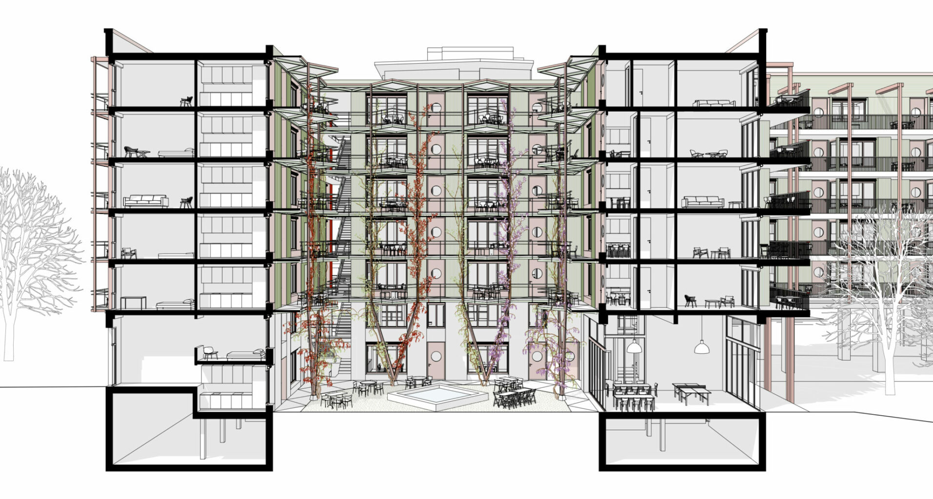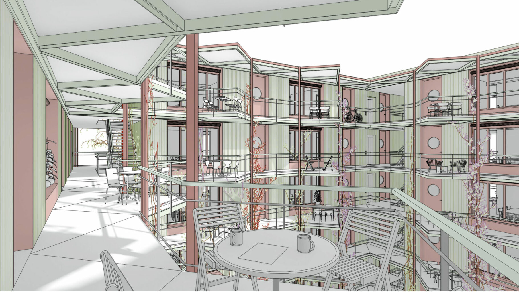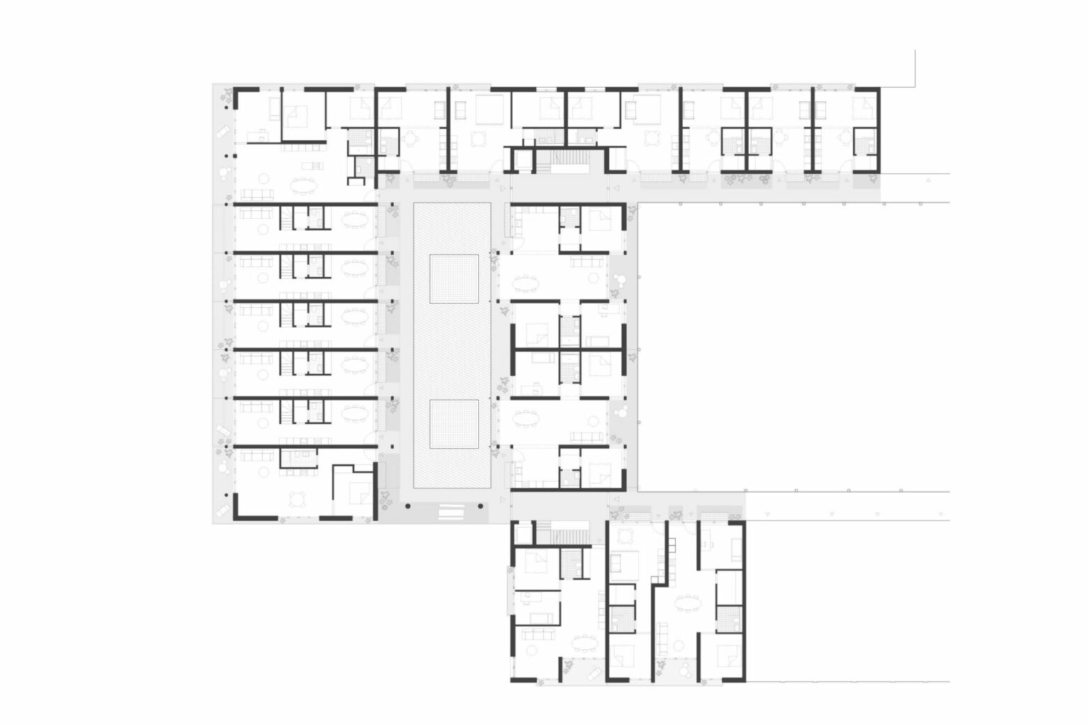 Alle Wohnungen werden über den Innenhof erschlossen, den die Verfasser als Patio verstehen. Dieser liegt entgegen dem Terrainverlauf abgesenkt auf ähnlichem Niveau wie der grosse Wohnhof. Ein doppelgeschossiges Portal verbindet die beiden Höfe. Diese Öffnung begünstigt durch den Kamineffekt eine genügende Durchlüftung und Nachtauskühlung. Zur räumlichen Gliederung werden einstöckige Vorbauten vorgeschlagen, darüber Beleuchtungsgirlanden und vertikale Begrünungselemente. Diese Gliederungsmassnahmen bewirken ein Spiel mit der Massstäblichkeit und reduzieren die gefühlte Höhe des Lichthofes. Als Nutzung der Vorbauten sind Waschsalons und Trocknungsräume vorgesehen (wobei auch andere Nutzungen denkbar sind). Die seitlich «eingekerbten» offenen Treppenhäuser tragen dazu bei, den Patio grösser wirken zu lassen. Ob der Patio tatsächlich die suggerierte Aufenthaltsqualität hat und ob die Waschhäuser als prominent in Szene gesetzter sozialer Treffpunkt funktionieren, wurde vom Beurteilungsgremium kritisch beurteilt. Einhellig positiv wurde bewertet, dem Patio nicht zu viele Funktionen einzuschreiben, sondern ihn sorgfältig-zurückhaltend als Erschliessungs- und Belichtungsraum zu inszenieren.