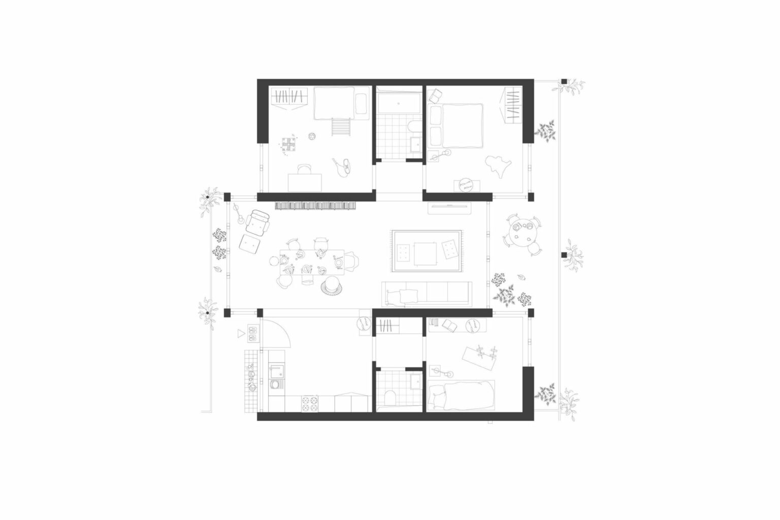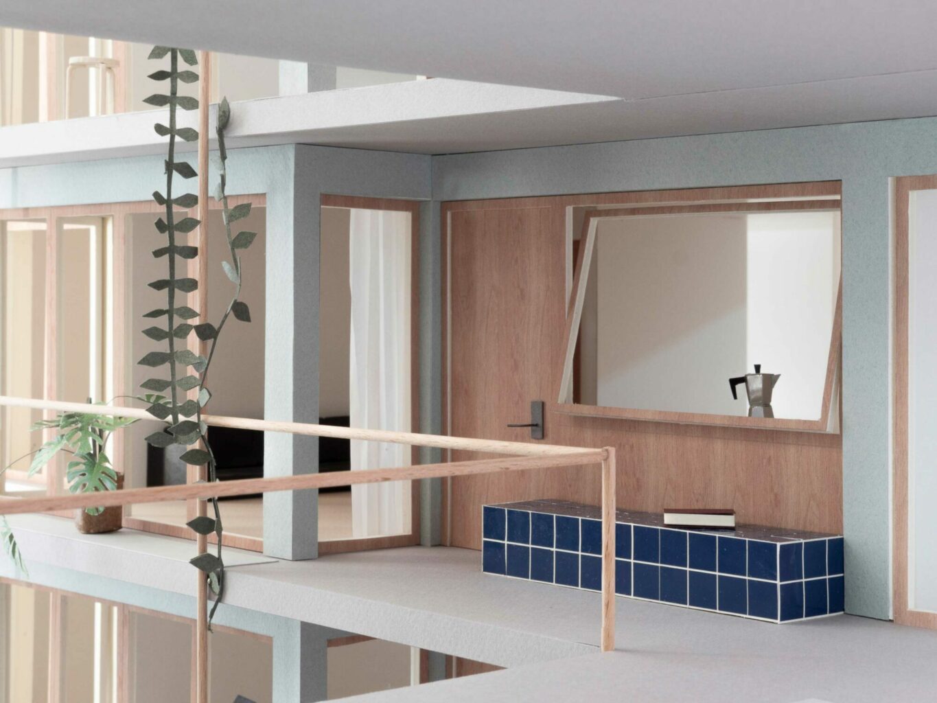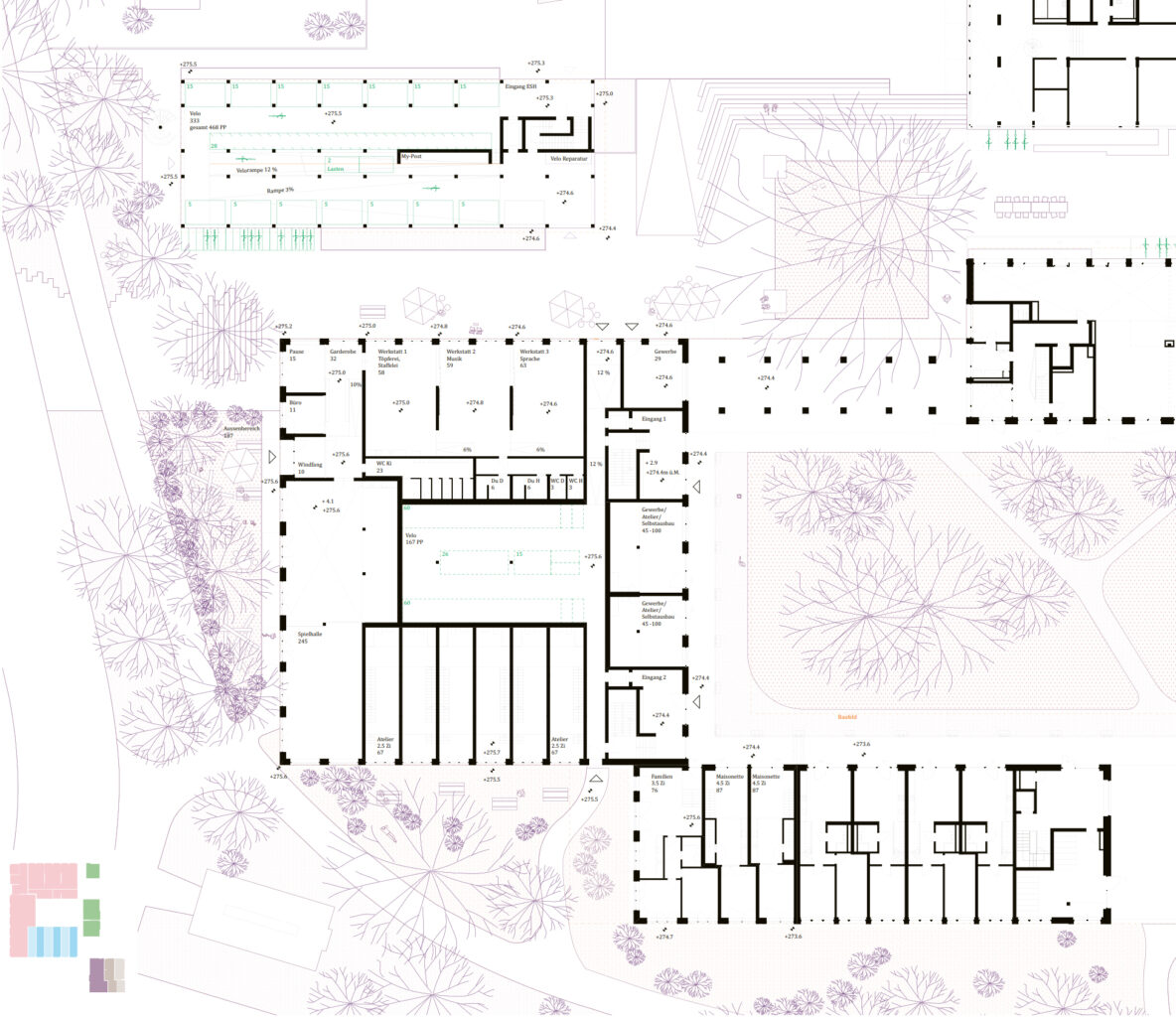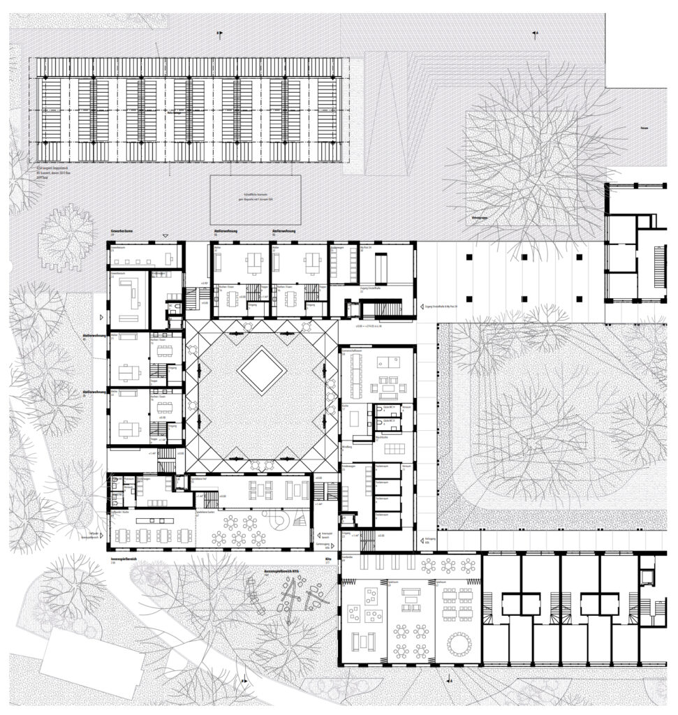 Im Erdgeschoss nehmen überhohe Studiowohnungen mit einer Splitlevel-Typologie geschickt den abfallenden Terrainverlauf auf. Die ebenfalls im Erdgeschoss angeordnete Kinderbetreuung, welche zur Grünraumseite orientiert liegt, vermag hochwertige Bezüge zu den Aussenräumen herzustellen. Durch ihre lose räumliche Nutzungsanordnung sind gewisse betriebliche Abläufe etwas eingeschränkt – was allerdings in der Zwischenpräsentation als mögliche Konzession beurteilt wurde. Gewisse Anforderungen, beispielsweise an die Fläche des Innenspielbereichs oder das Verpflegungskonzept, wären in einer Weiterbearbeitung noch aufzunehmen gewesen. In den Obergeschossen finden die Vertikalerschliessungen ihre räumliche Fortsetzung auf den Laubengängen. Mit der Positionierung der Treppen können somit jeweils drei Wohneinheiten pro Geschoss erschlossen werden. Die Wohnungen in den Obergeschossen lassen ein pragmatisches Grundrissprinzip erkennen, bei welchem die Wohn- und Essräume dem belebten Innenhof zugewandt sind und die privateren Zimmer der äusseren Fassadenabwicklung folgen. Die Grundrisstypologie, welche auf dem stringent entworfenen Holzbausystem basiert, wird in den Obergeschossen geschickt für einen flexiblen Wohnungsspiegel genutzt. Die Wohnungsgrössen können über die Anzahl der Zimmer auf der hofabgewandten Fassadenseite verändert werden.