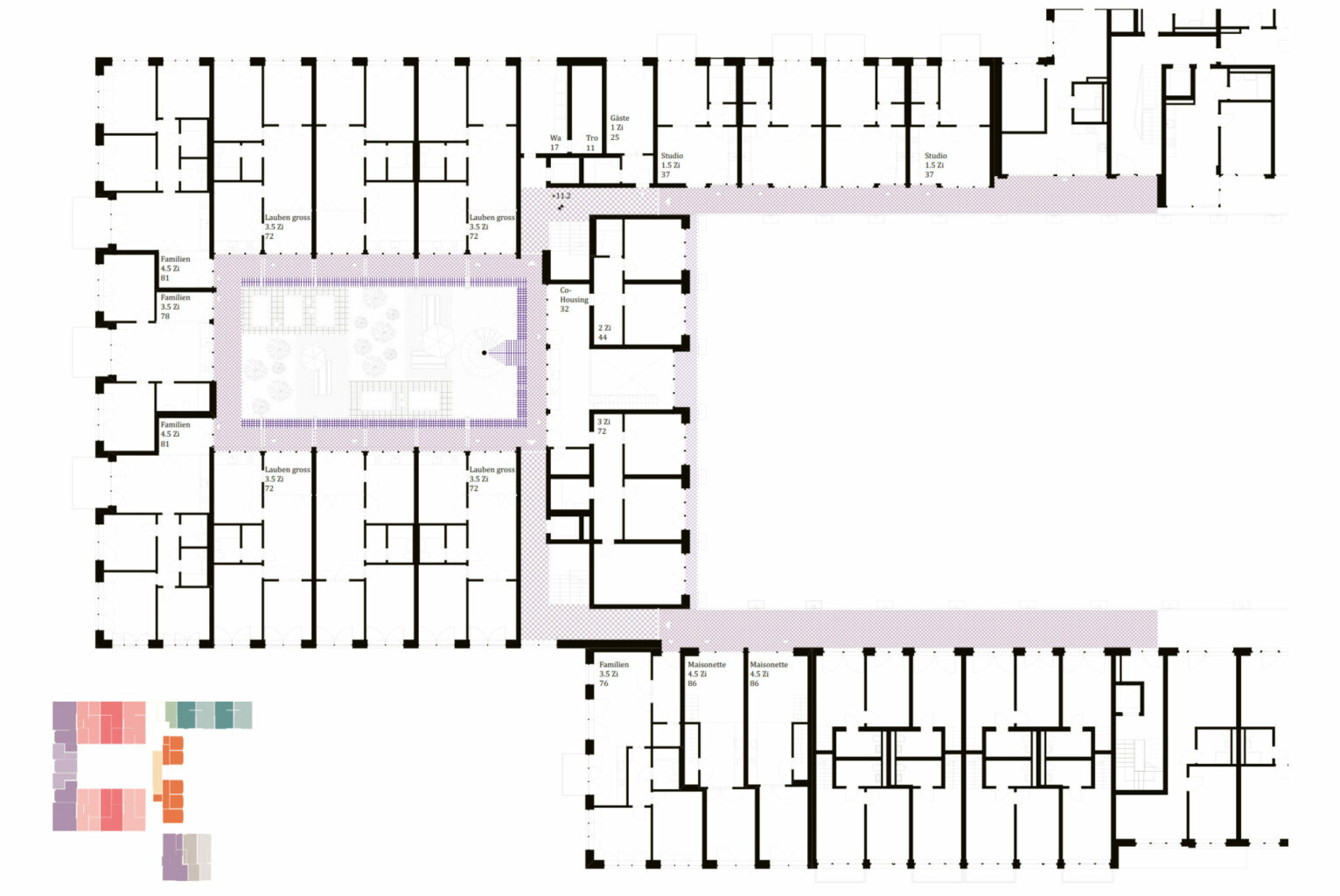 Der Hof ist zunächst einfach Hof. Dies funktioniert auch darum gut, weil er nicht überstrapaziert wird mit zu vielen Begegnungsangeboten oder einer Wegführung, welche allzu direkte Einblicke in die Privatsphäre erlauben würde. Diese entspannte Haltung führt zu einem gut vorstellbaren, wenngleich noch etwas «glatten» Hofbild. In den zwei Gebäudeflügeln an den Anschlüssen zur ersten Bauetappe sind zwei weitere Erschliessungskerne vorgesehen – was die Erschliessungseffizienz etwas mindert. Auch bei den Grundrissen wurde ein geschickter Umgang mit der Thematik von Nähe und Distanz gefunden. So wurden Puffer- und Filterräume geschaffen, die den Rückzug ins Private ermöglichen. Die Vielzahl effizient geschnittener, zweiseitig belichteter Wohnungen – von der Geschosswohnung bis zur Maisonettewohnung, vom Durchwohnen bis zum Wohnen an der Laube – schafft ein attraktives Angebot für das genossenschaftliche Wohnen.