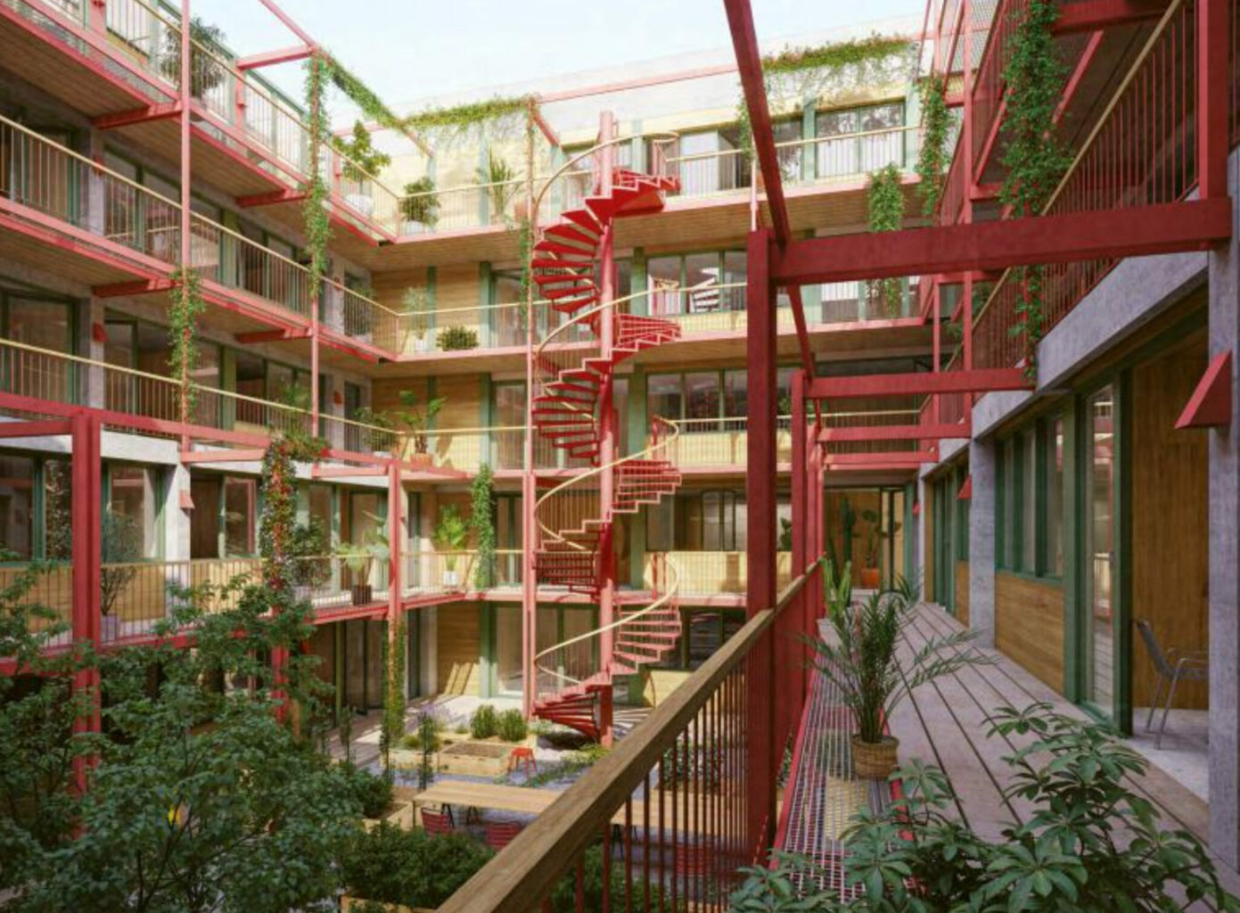 Durch die Abstufung zu den darüberliegenden Geschossen wirkt der Laubengang offen, der Blick zum Himmel ist vom ersten Obergeschoss an für alle Wohnungen gegeben. Der Gartenhof ist atmosphärisch reizvoll und animiert zu gemeinsamen Aktivitäten der Bewohnerinnen und Bewohner. Die Möglichkeit, die Stahlkonstruktion zu beranken und Topfpflanzen aufzustellen, führt zu einer wohnlichen Ausstrahlung. Der Wohnungsmix ist sehr vielfältig. Mit verschiedenen Wohntypologien reagieren die Verfasser auf die unterschiedlichen Situationen. Die konsequente Reaktion auf die unterschiedlichen Ausrichtungen und die räumliche Situation führen zu einer hohen (aus Sicht des Beurteilungsgremiums zu hohen) Diversität.