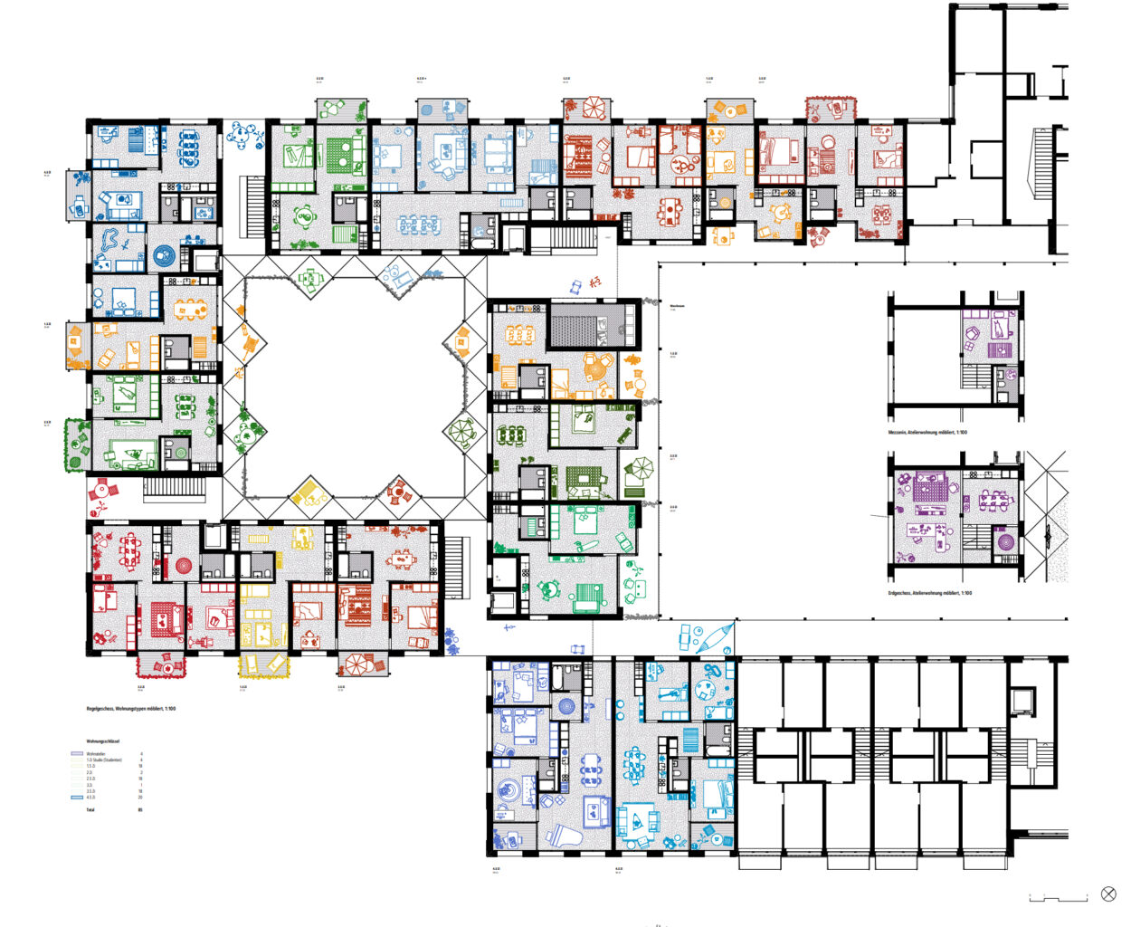 Die Typologie der Wohnungen soll vom Mehrwert des Laubengangs profitieren und dessen Nachteile reduzieren. Entlang der Erschliessung sind deshalb vorwiegend störungsunempfindliche Räume angeordnet. Im Alltag dürfte die durch die durchgängige Laubengangtypologie forcierte Gemeinschaft eher beengend als bereichernd wirken. Insbesondere die räumliche Enge des Hofes, die durch die überbreiten Laubengänge entsteht, und die allseitig gleiche Bespielung mit «Vorgärten» führen zu einer ständigen, gegenseitigen Exponierung. Der allseitig geschlossene Hof dürfte auch hinsichtlich interner Lärmentwicklung nicht ganz unproblematisch sein. Positiv zu erwähnen ist, dass die Nachtauskühlung im Sommer durch die grosse Öffnung im Erdgeschoss begünstigt wird. Die Grundrisse der Wohnungen überzeugen durch das durchgehende Leitmotiv der flexiblen Wohnhalle. Das Motiv findet sich bei unterschiedlichen Wohnungsgrössen und in verschiedenen Lagen. Der Gedanke, dass die durchgesteckte Wohnhalle als Bindeglied zwischen Stadt- und Hofseite funktioniert, ist reizvoll. Gleichzeitig schlagen die Projektverfasser optional eine Segmentierung der Halle mittels Raumteiler vor. Was als gleichsam korridorlose Wohnung und als individuelle Aneigenbarkeit durch die Mieter positiv gewertet kann, kann aufgrund der Überlagerung von Zirkulations- und Aufenthaltsbereichen im Alltag auch nachteilig sein und die Wohnhalle ihrer Grosszügigkeit berauben. Als sehr gelungen wird der Vorschlag gewertet, an der Schnittstelle der beiden Höfe einen Typologiewechsel vorzunehmen. Die Maisonette-Typologie ist hier eine geschickte Antwort auf die spezifische Lage der Wohnungen ohne Bezug zum Stadtraum. Die teilweise doppelgeschossigen Raumzonen schaffen unter Einbezug der dritten Dimension eine wohltuende Weite.