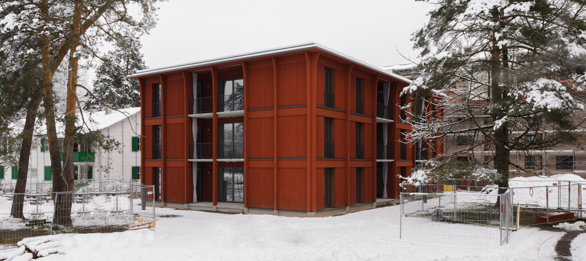 Am Hirtenweg sind die ersten Wohnungen des Wohnbauprogramms 1000+ bezugsbereit. Die Architektur stammt aus der Feder von Harry Gugger Studio. Die kostengünstige Holzmodulbauweise zeichnet sich durch eine sehenswerte rote Fassade aus. Günstig ist hier wörtlich gemeint: Eine Neubauwohnung mit viereinhalb Zimmern kostet 1'784 CHF Monatsmiete.