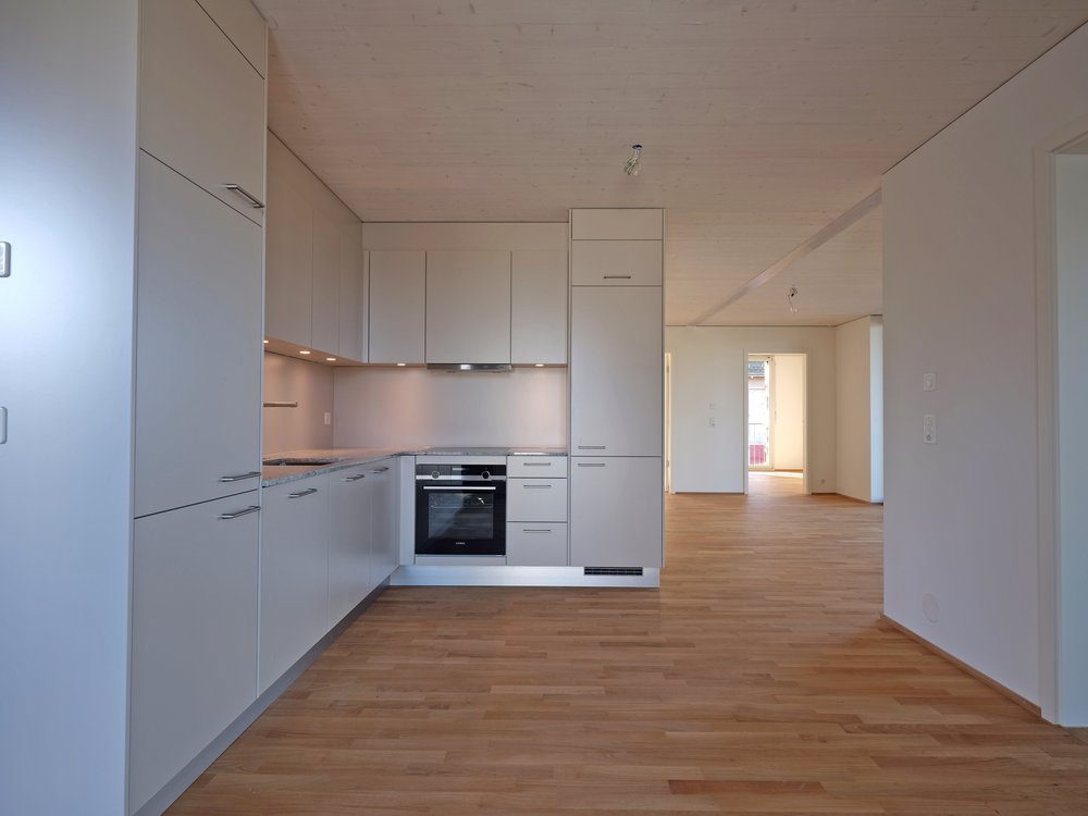 Der erste der drei Neubauten ist nun bezugsbereit. Die modulare Massivholzbauweise, welche die Architekten zusammen mit der Erne AG entwickelten, ermöglichte eine kurze Bauzeit, denn die Holzmodule wurden in der Produktionshalle vorgefertigt und das Gebäude auf der Baustelle innerhalb kürzester Zeit zusammengefügt. "Die Wohnungen zeichnen sich durch effiziente Grundrisse, ohne klassische Verkehrsflächen aus. Charakteristisch für die Wohnungen ist ein versetztes Durchwohnprinzip mit dem direkten Eingang in die grosse Wohnküche", heisst es in der Medienmitteilung.