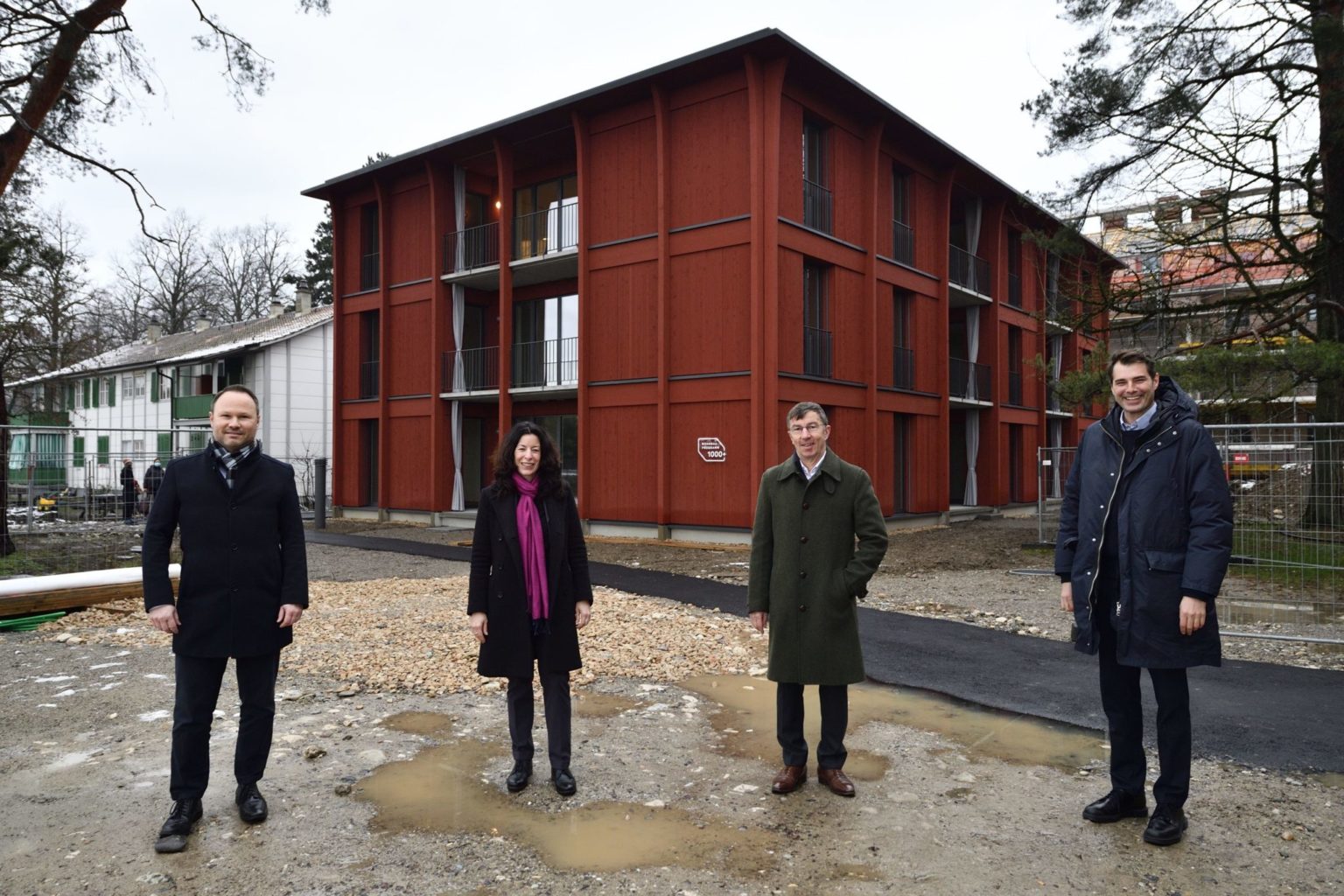 Einweihung der ersten 1000+ Wohnungen am Hirtenweg 14 mit v.l. Rolf Borner, Geschäftsleiter Immobilien BS, Tanja Soland, Vorsteherin des Finanzdepartements, Harry Gugger, Architekt und Daniel Erne, Erne AG Bauunternehmung, Gesamtleister am Donnerstag, 28. Januar 2021 in Riehen. © Dominik Plüss