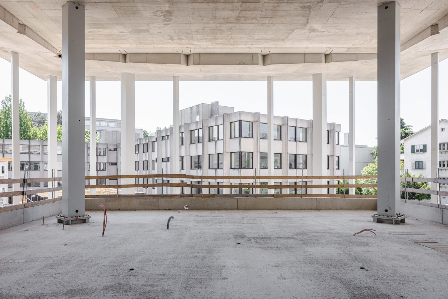 "Das Auditorium als Zwischenbau verbindet die beiden Zwillingshochbauten miteinander und stellt gleichzeitig den neuen Haupteingang zum Campus-Gelände von Helvetia dar. Der Bau besticht durch seine transparente Ausbildung und scheint auf 24 Stützen zu schweben. Die grosszügige, offen gestaltete Raumform, beinhaltet den Empfang und das darüber angeordnete Auditorium, das mit einer frei ausladenden Treppenanlage erschlossen wird. Das Dach wird aus einer 40 cm dünnen vorgespannten Flachdecke gebildet und ist an den ausladenden Rändern gevoutet gestaltet. Gelagert wird das Dach auf 12 primären und 12 sekundären Stützen, die symmetrisch angeordnet sind. Die Hauptstützen übernehmen zusätzlich zu den Vertikallasten auch die Lasten aus dem Wind und dem Erdbeben. Die Stützen sind in den Decken über den 1. und 2. Untergeschosse eingespannt, so dass der Zwischenbau ohne Wände auskommt. Die allseitige Ausladung des Daches über den Grundriss des Auditoriums hinaus stärkt die Grosszügigkeit und Leichtigkeit des Raumes."