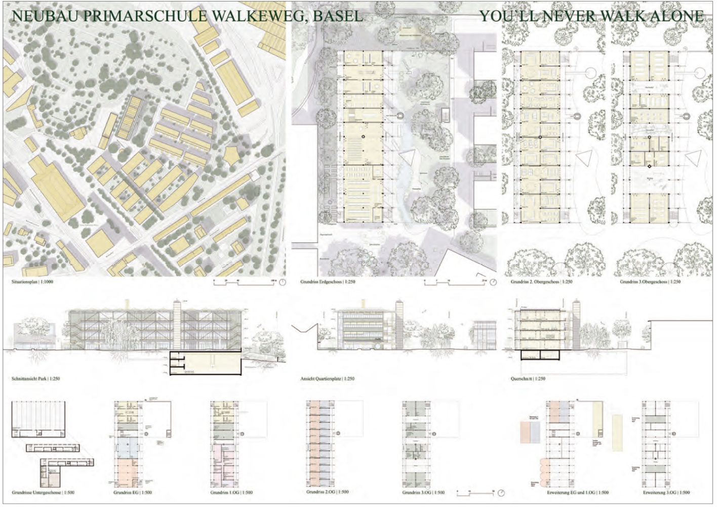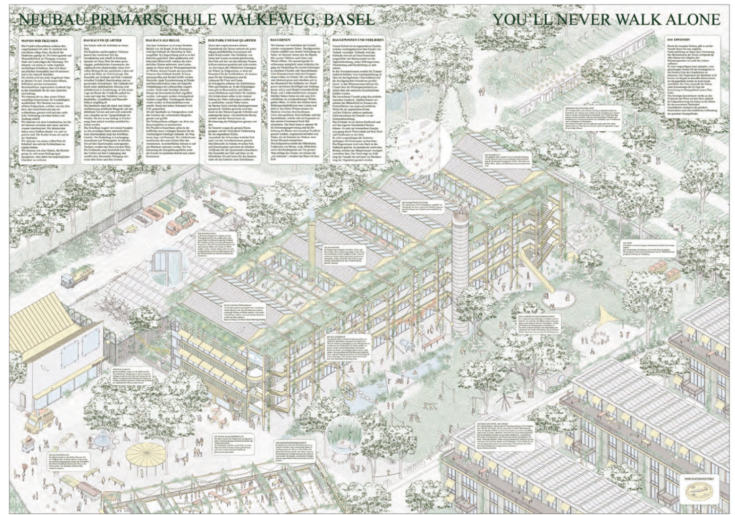 Im Ideenwettbwerb wurde der Fächer für innovative nachhaltige Lösungen geöffnet: "Das Schulhaus soll ein wegweisendes Beispiel für Antworten auf die aktuellen Fragen der Nachhaltigkeit in möglichst vielen Bereichen geben. Dabei soll der Fokus neben relevanten Themen wie CO2-Emissionen insbesondere auf klimagerechtes Bauen und Kreislaufwirtschaft, aber auch auf soziale Nachhaltigkeit gelegt werden." Auf dem Areal zwischen dem Friedhof Wolfgottesacker und Walkeweg in Basel, das bisher mehrheitlich mit Freizeitgärten genutzt wurde, soll in mehreren Etappen eine neue Wohnsiedlung entstehen. Neben den Wohnbauten ist ein Primarschulhaus mit Doppelturnhalle und Kindergarten geplant. "Da auf dem Weg zur Entwicklung eines nachhaltigen Gebäudes mit seinen breiten und innovativen Themenfeldern laufend Zielkonflikte entstehen, will die Bauherrschaft sicherstellen, dass die Möglichkeit besteht, diese Konflikte zu diskutieren und schon in der ersten Entwurfsphase zu gewichten." Der erste Schritt ist geglückt. Wir wünschen weiterhin gutes Gelingen - und allen Beteiligten für die weitere Bearbeitung im Studienauftrag eine produktiven, anregenden Umgang mit den genannten "Zielkonflikten". Oder frei nach den Reines Prochaines: "Allein denken ist kriminell."