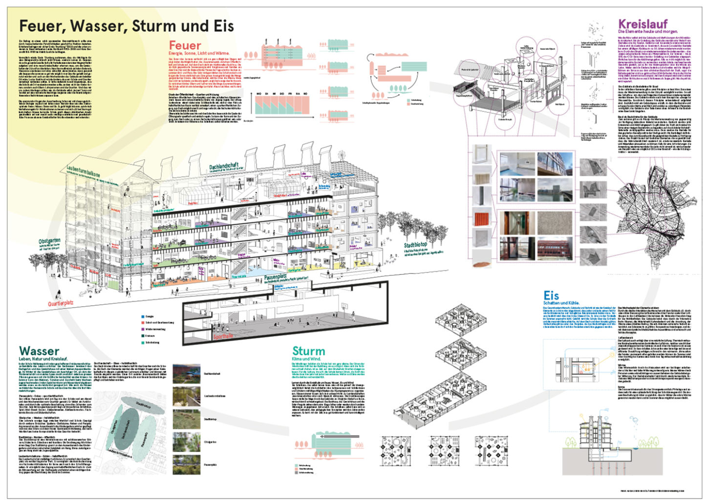 "Das Projekt «Feuer, Wasser, Sturm und Eis» sieht einen langen, viergeschossigen Gebäudekörper mit Nord-Süd- Orientierung vor. Dieser lässt sowohl eine gebührende Distanz zu den Wohnbauten im Osten, als auch einen angemessenen Abstand zur Friedhofsmauer im Westen. Die Haupterschliessung der Schule funktioniert über den östlich angeordneten Pausenplatz. Als klare Geste zum Quartierplatz hin steht an der Stirnseite des Schulgebäudes ein Laubenturm. Er dient der Schule und dem Quartier als Zugang zu den gemeinsam genutzten Räumen und dem Dachgarten. Diese schöne Geste kommt einer vertikalen Erweiterung des öffentlichen Raumes gleich, die zum Betreten einlädt."