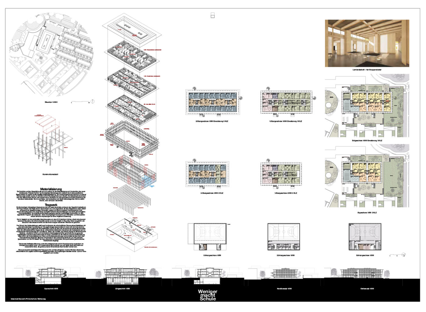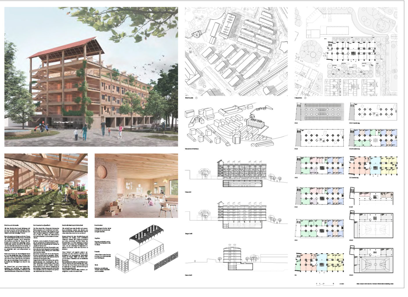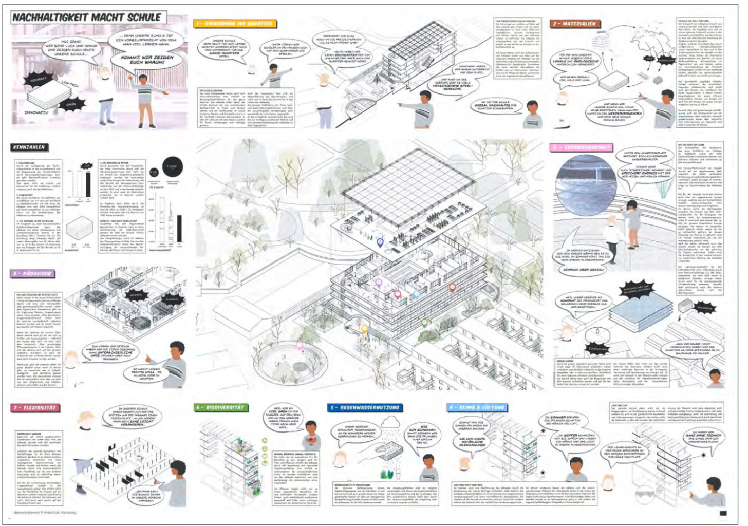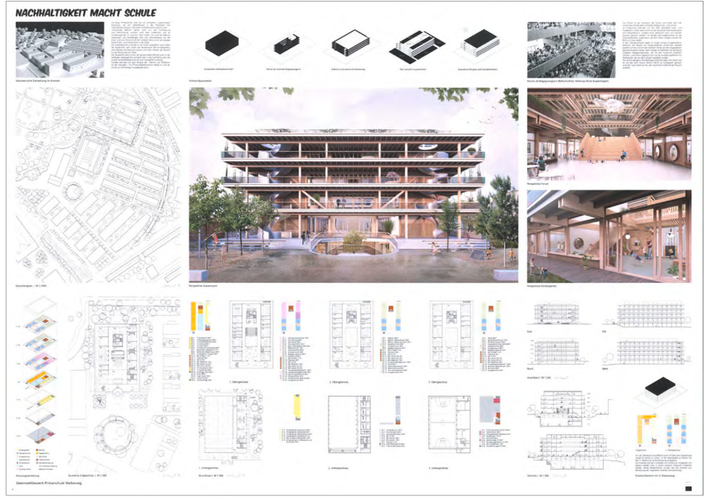 "Der Hauptzugang zum Schulhaus ist zentral auf den Quartierplatz orientiert. Vom leicht erhöhten Erdgeschoss tritt man in das Herzstück der Schule, das Forum. Über eine offene Halle wird ein von oben belichteter, anregender zentraler Begegnungs- und Lernort geschaffen. Im Erdgeschoss ist hier zugleich Foyer und Aula. In den Obergeschossen werden Gruppenarbeitsbereiche und Begegnungszonen angeboten. Über eine zentrale, grosse Treppe, welche auch als Tribüne für die Aula dient, gelangt man ins 1. Obergeschoss. Auf dem Dach stehen unter einer solaraktiven Pergola zusätzliche Pausenflächen zur Verfügung, welche z. B. auch als Pflanzgarten genutzt werden können. Weitere Pausenflächen werden auf jedem Geschoss auf den umlaufenden Balkonen angeboten. Diese sind Richtung Quartierplatz deutlich tiefer ausgebildet und mit diesem über eine grosszügige Aussentreppe und eine Rutschbahn verbunden. Diese schöne Idee hat leider zur Folge, dass der Tageslichteinfall in die dahinterliegenden Gruppenarbeitsbereiche stark reduziert wird."