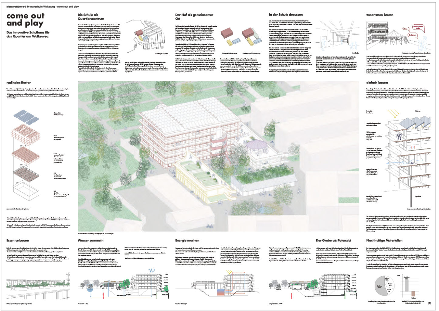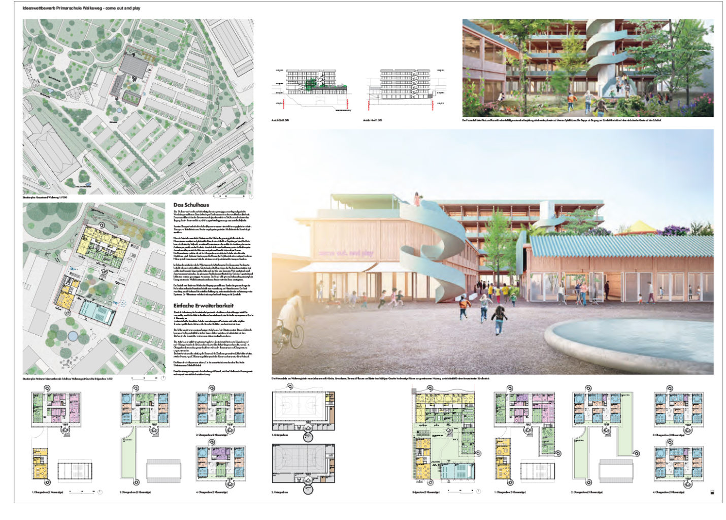 "Das Projekt «come out and play» überzeugt mit einem intelligenten Entwurf, der bereits auf städtebaulicher Ebene die Frage der sozialen Nachhaltigkeit beantwortet. Dem Team gelingt es, nicht nur ein Schulhaus zu entwerfen, sondern einen Ort zu schaffen."
