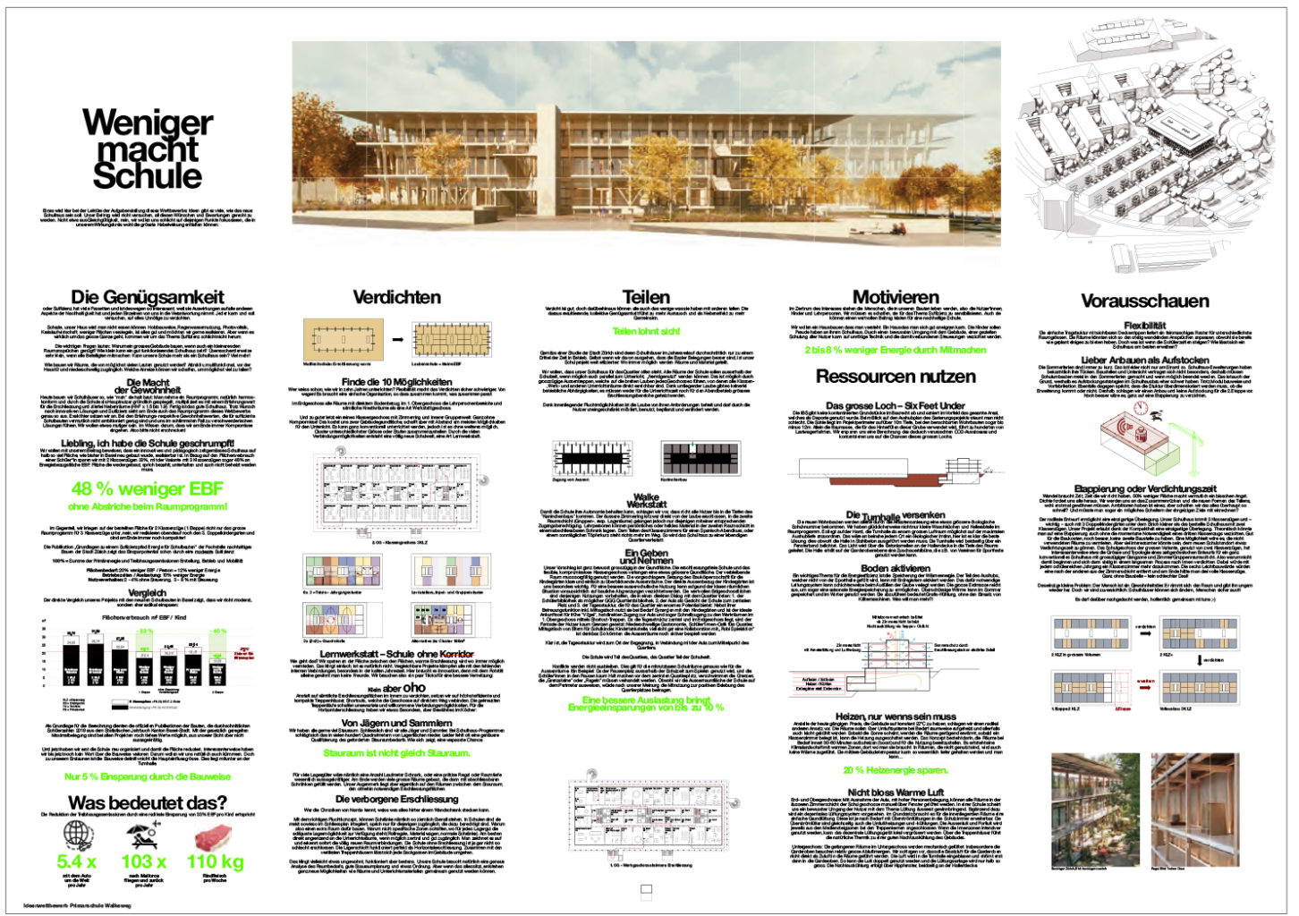 "Das Verfasserteam von «Nachhaltigkeit macht Schule» erzählt eine fundierte Innovationsgeschichte, die anregend vermittelt wird. Es setzt die Themen in einem schlüssigen Entwurf um. Die Angemessenheit des monumentalen Ausdrucks für eine Primarschule wird in Frage gestellt."