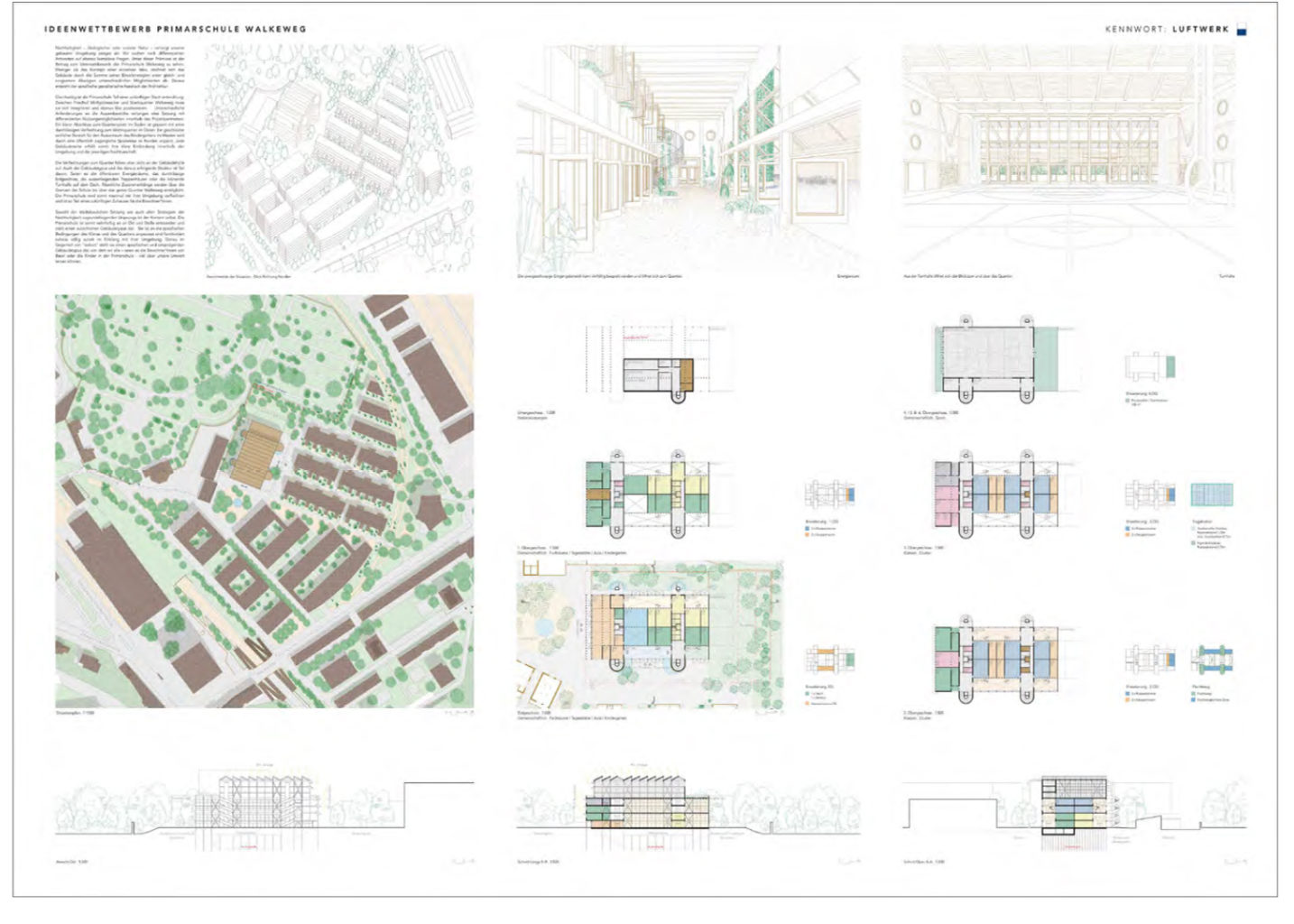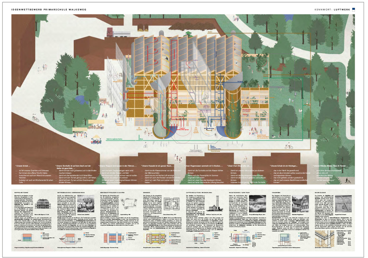 "Mit dem Projekt «LUFTWERK» zeigt das Verfasserteam ein grosses Engagement und eine fundierte Auseinandersetzung mit wichtigen Nachhaltigkeitsthemen und entwickelt daraus einen innovativen und anregenden Vorschlag für ein neues Schulhaus."