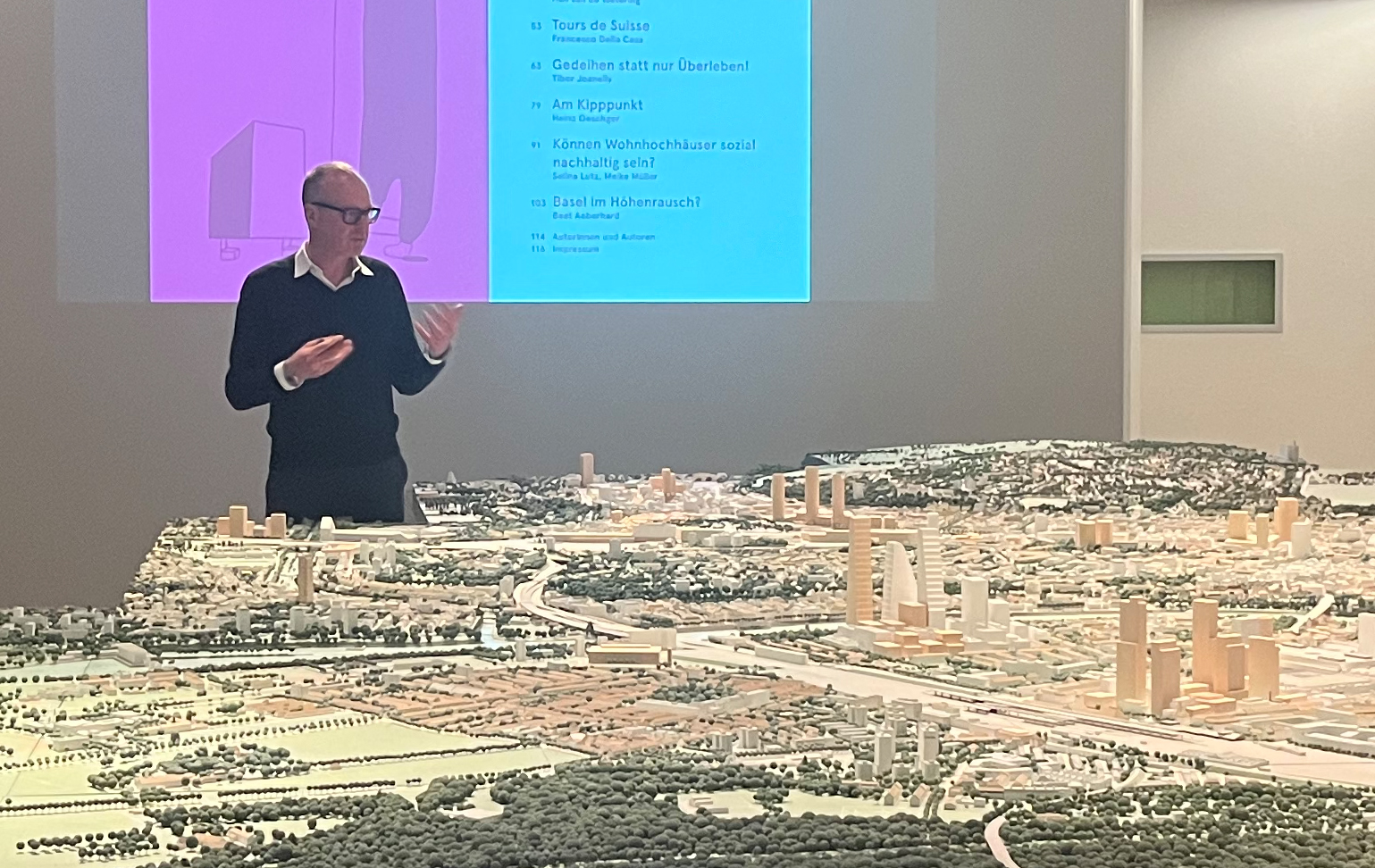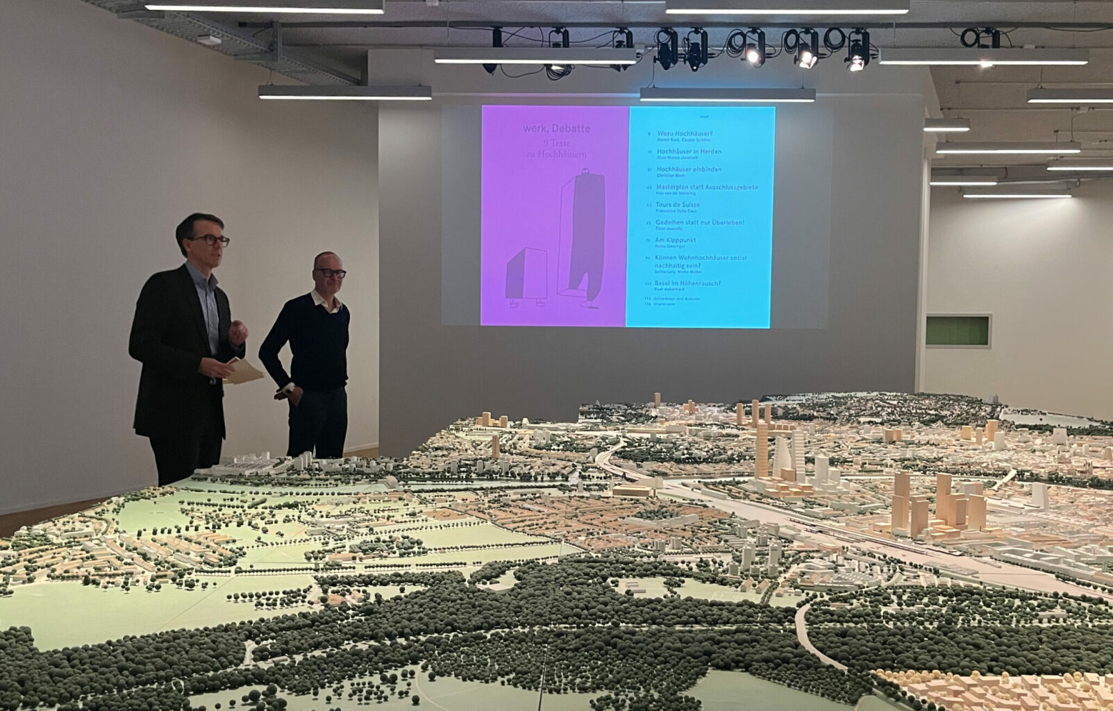 Den Start machte die Textsammlung zum Thema Baukultur, danach folgte die grüne Ausgabe zum Bauen im Klimawandel. Letzten Donnerstag lud Roland Züger, Chefredaktor des werk, bauen+ wohnen zur Vernissage des magentafarbenen, dritten Bandes über Hochhäuser ein. Am Stadtmodell führte er mit dem Basler Stadtbaumeister Beat Aeberhard, dem Autor des letzten Beitrages im Buch «Basel im Höhenrausch?», ein anregendes Gespräch über die Basler Hochhauspolitik. Nach einer Einführung zum Buch fasste Roland Züger die Inhalte der neun sehr unterschiedlichen Texte für das Publikum zusammen. Das Thema Hochhäuser bewegt, der Bautypus ist umstritten und die Debatte daher lebendig und lesenswert. Roland Züger stellte fest, man schaue von Zürich mit etwas Neid auf Basel, weil hier ein Konzept sichtbar sei.