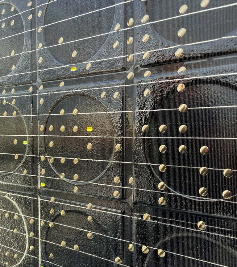 "Dank farbiger Punkte und einer strukturierten Oberfläche aus gehärtetem Schmelzglas verändert sich je nach Blickwinkel und Sonneneinstrahlung das Lichtspiel in den Modulen."