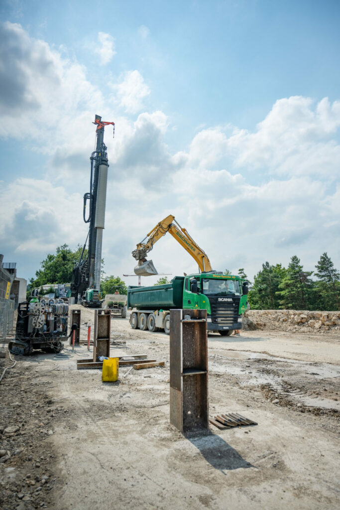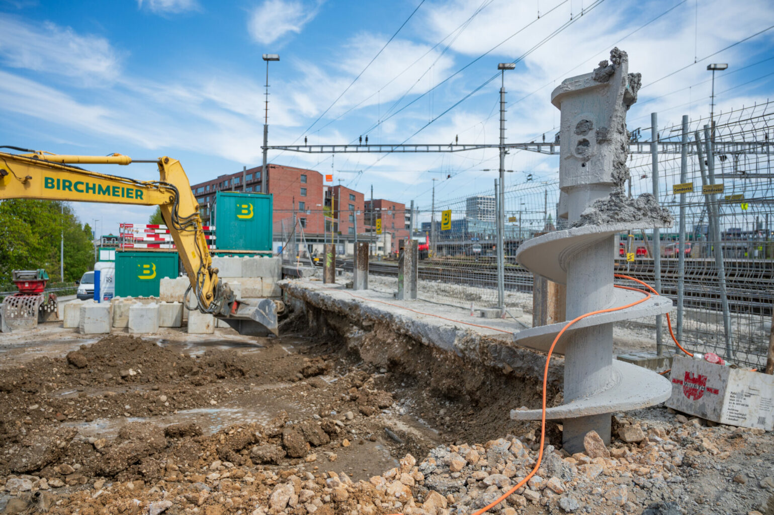 Seit Januar 2025 schreiten die Arbeiten am unterirdischen Parking unter dem Erdbeergraben voran. Nach vorbereitenden Baumfällungen und der Sperrung der Verkehrsachse wurde die Baugrube durch eine Stützwand aus rund 250 Grossbohrpfählen gesichert. Diese Pfähle, in Kombination mit bis zu 25 Meter tief reichenden Ankerlagen, übernehmen die Baugrubensicherung, da eine Böschung aufgrund der engen Platzverhältnisse ausgeschlossen ist. Die Lage im unmittelbaren Grenzbereich zu den SBB-Gleisanlagen erfordert ein engmaschiges Monitoring: Drei Messstationen und rund 450 Messprismen auf Schwellen, Stützmauern, Brückenwiderlagern und Fahrleitungsmasten liefern in Echtzeit präzise Deformationsdaten. Die geotechnische Überwachung stellt sicher, dass Baufortschritt und Bahnbetrieb parallel und ohne Einschränkungen ablaufen. Die Fertigstellung der Baugrube ist für Frühjahr 2026 vorgesehen, ab April soll der Rohbau starten. Die Inbetriebnahme des Parkings ist für Ende 2027 geplant.
