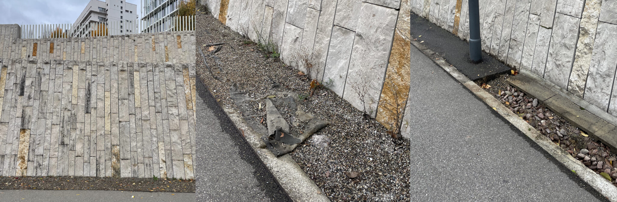 Im Kiesstreifen entlang der Mauer sollten Pflanzen wachsen. Ein Vlies zwischen Kies und Boden erschwert die Ansiedlung der Pflanzen und darunter viel Beton. © Martin Zwahlen
