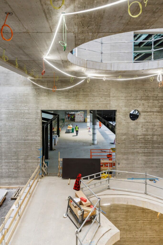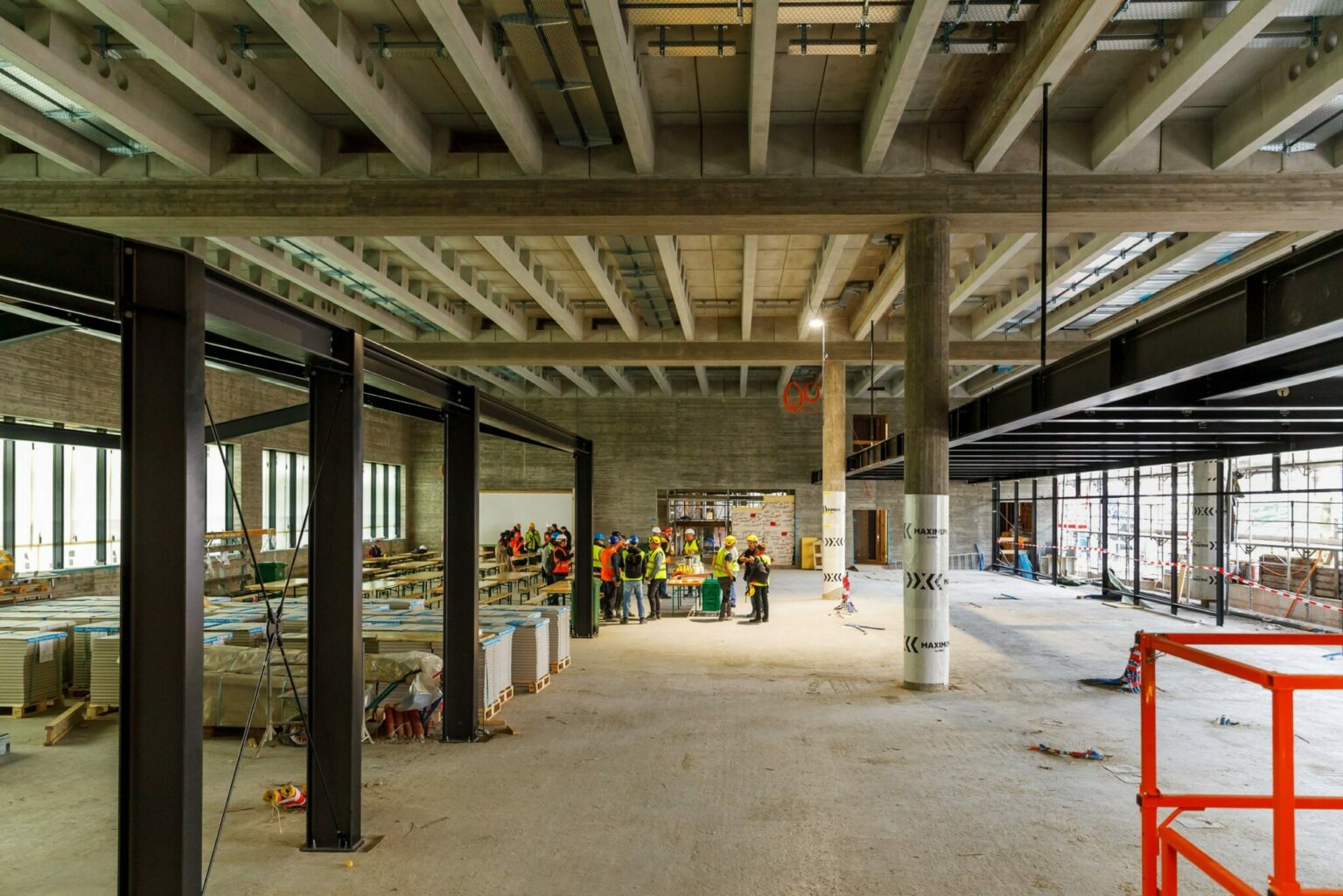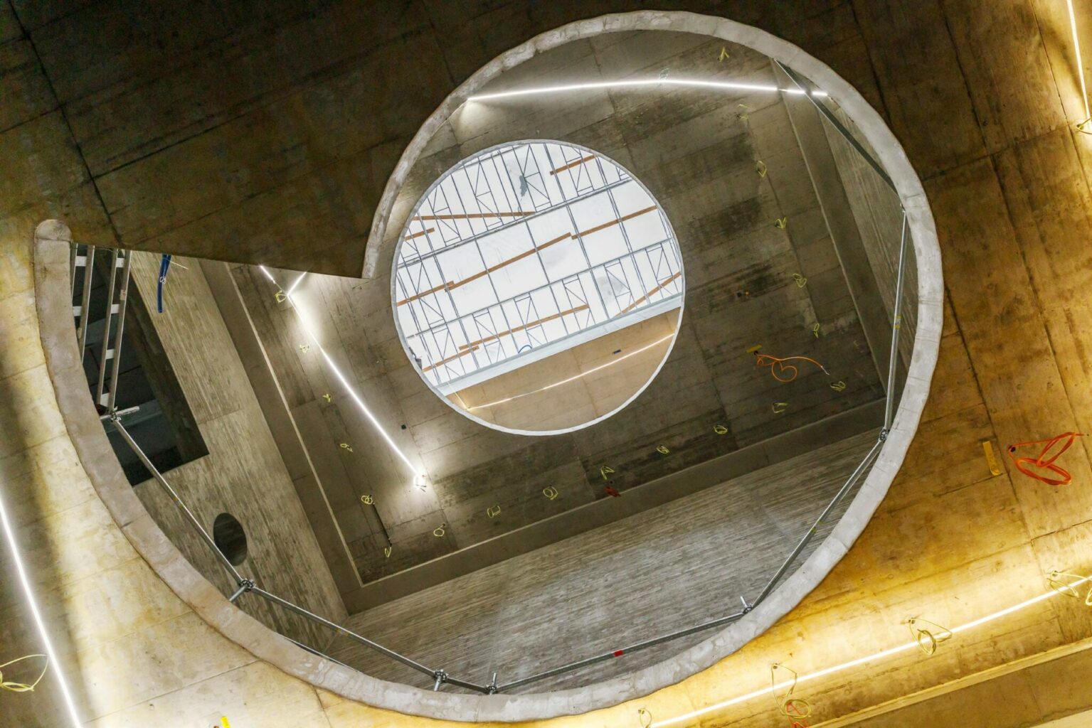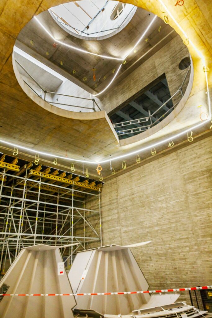Rohbau der gemeinsamen Eingangshalle mit Stahlkonstruktion der Empore (rechts) und Unterkonstruktion des Museumsshops (links), Foto: Derek Li Wan Po, Oktober 2024