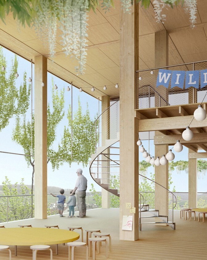 «Der überdeckte Bereich beim Eingang bildet einen geschützten Aussenraum für den täglichen Gebrauch und organisiert die Erschliessung. Die Struktur ist so ausgelegt, dass sie langfristig anpassbar bleibt und zu einem späteren Zeitpunkt in Klassenzimmer umgewandelt werden kann. Dadurch entsteht ein funktionales Element, das Nutzung, Erweiterbarkeit und Konstruktion zusammenführt.»