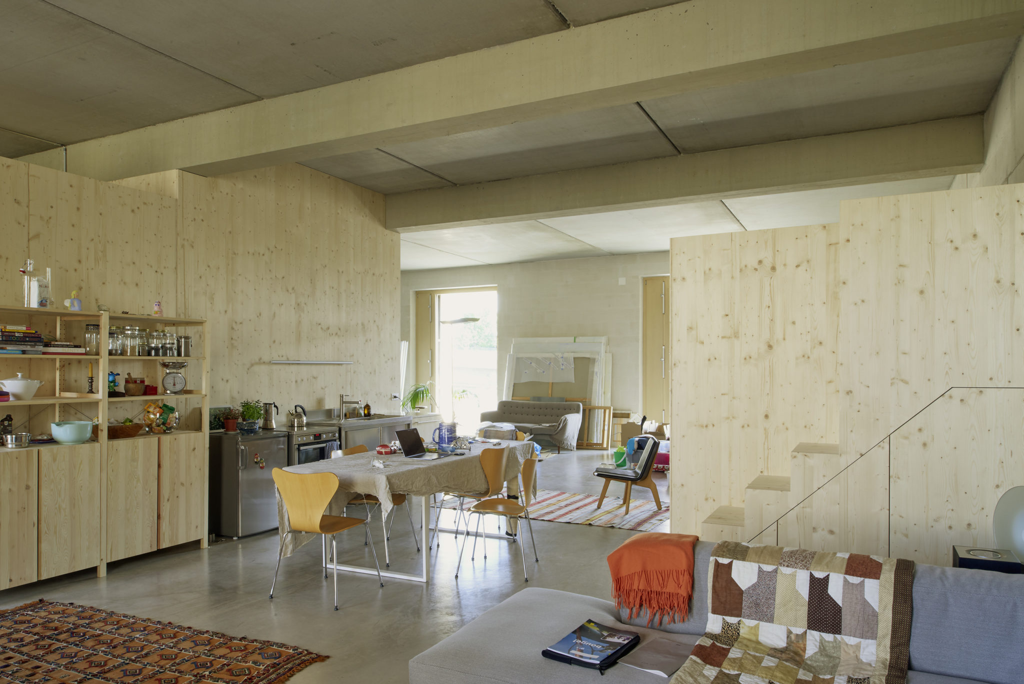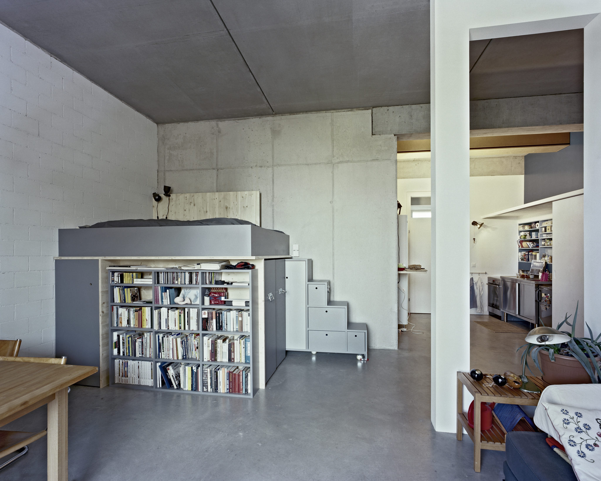 Der Rohbau-Chic machte die Bewohner erfinderisch – wie der Blick ins Innere des Hauses ein Jahr nach Fertigstellung beweist. Mit preiswerten Dreischichtplatten aus Fichtenholz wurden da clevere Möbel als Raumteiler mit integrierter Schlafgalerie eingebaut. Dabei erweist sich die Raumhöhe von 3.45 m nicht nur aus klimatischen Gründen (Stichwort: sommerlicher Wärmeschutz) als besonders sinnvoll – viele Bewohner nahmen mit klugen Einbauten die Möglichkeit der doppelten Nutzung der Grundfläche wahr. Auf jeden Fall funktioniert die Kombination der rohen Betondecken und -böden, den nackten Kalksteinmauern mit warmen Holzflächen hervorragend – keine neue Erkenntnis zwar, aber auf jeden Fall ein Argument mehr für das suffiziente Bauen.