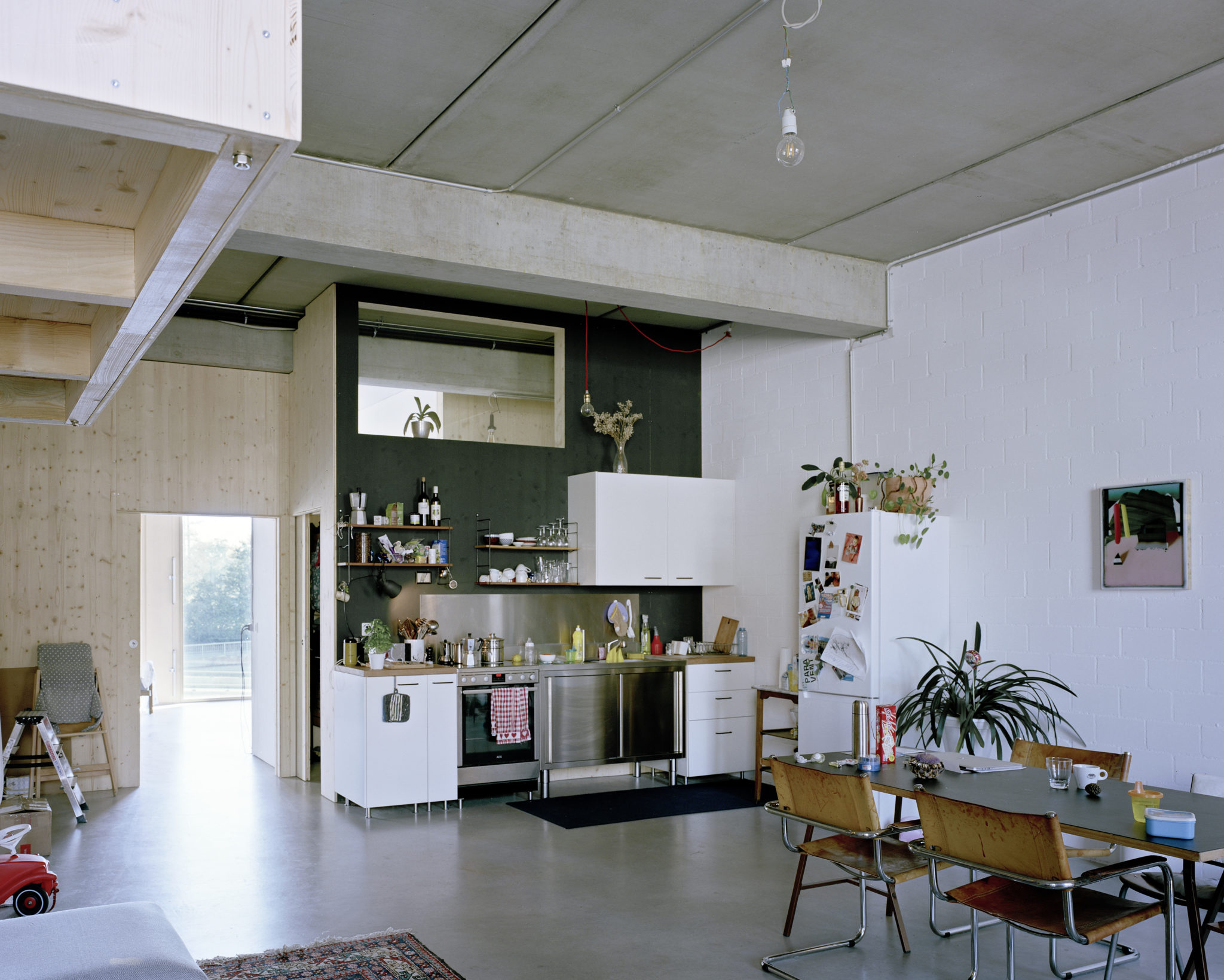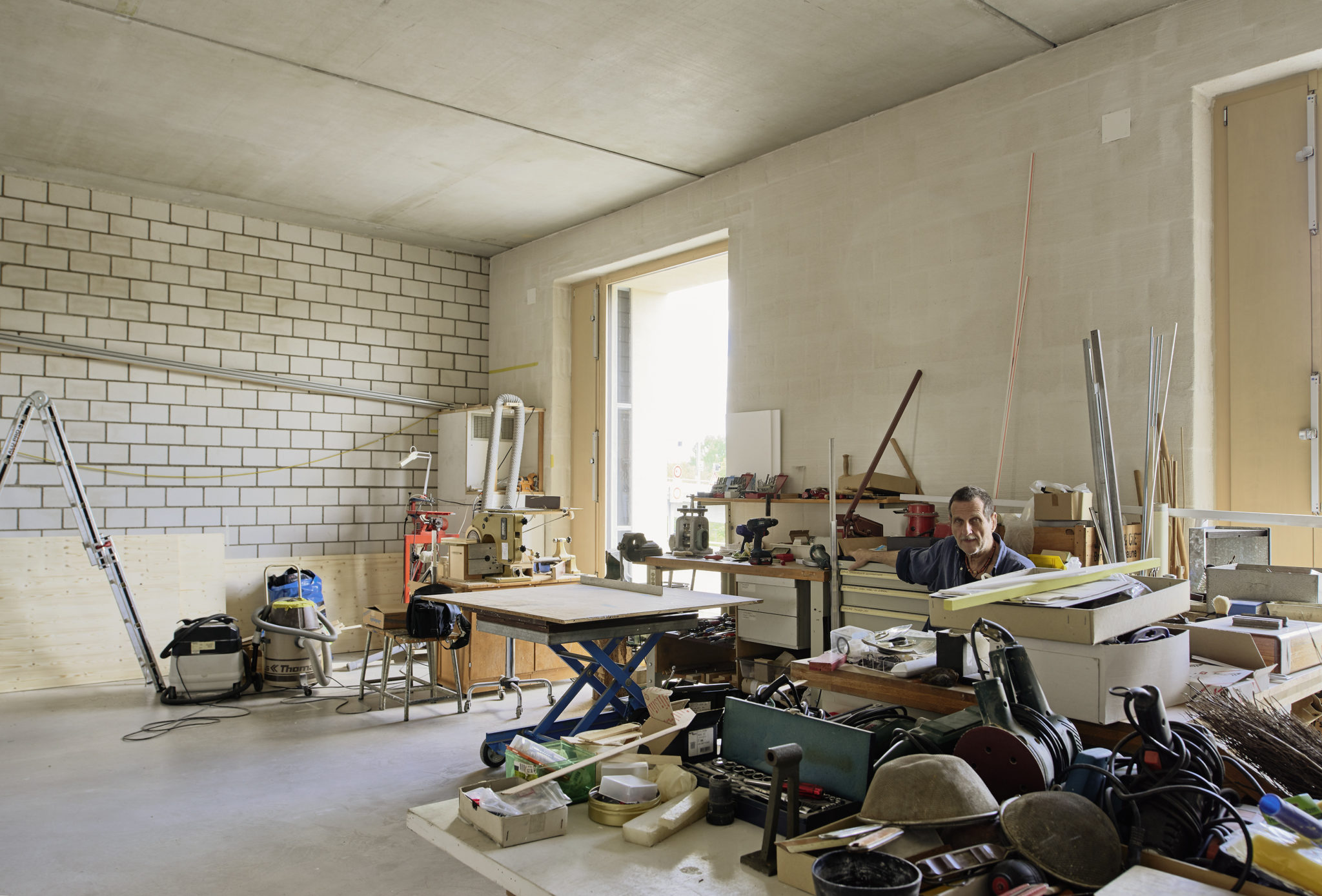 Irgendwie besonders entspannt sind die Räume, die tatsächlich als Werkstatt genutzt werden, wo gesägt, gehobelt und gehämmert wird – wo es in erster Linie um das Machen und nicht um den Lifestyle geht. Hier kommt die räumliche und konstruktive Robustheit des Hauses voll zum Tragen. Kratzer und sonstige Gebrauchsspuren steckt es locker ein; die dadurch gewonnene Patina lässt das Haus sogar gewinnen.