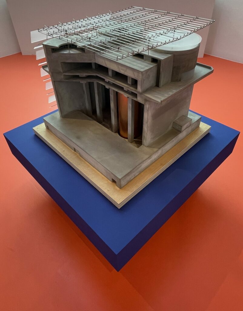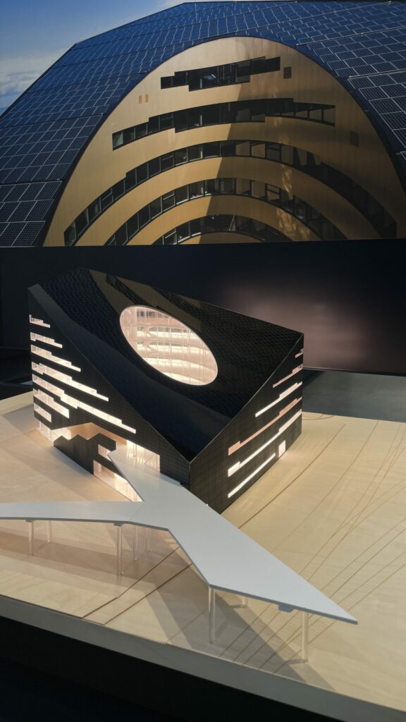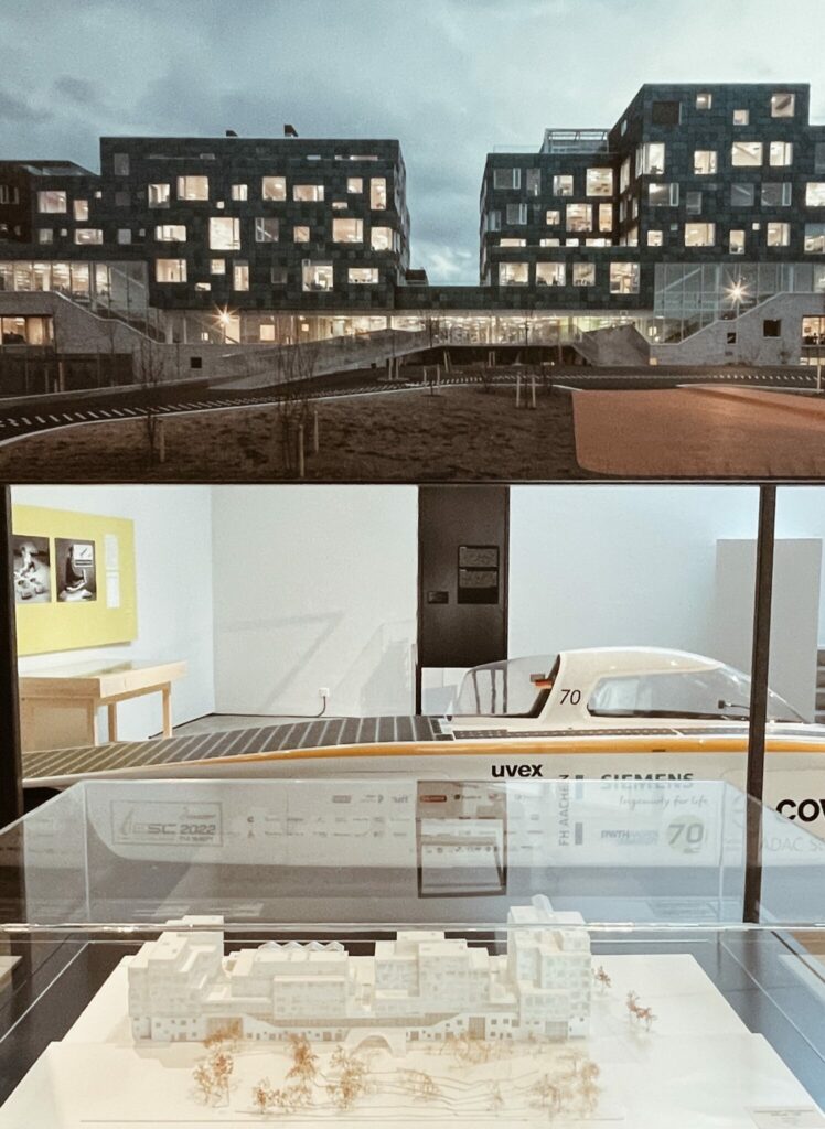 Im selben Raum steht das Modell der Internationalen Schule in Kopenhagen im Massstab 1:500. Das 2017 fertiggestellte Gelände mit Schulgebäude für über 1200 Schülerinnen und Schüler imponiert mit einer einzigartigen Fassade bestehend aus 12´000 Solarpanelen. Diese sind einzeln abgewinkelt, um einen paillettenartigen Effekt zu schaffen. Das Gebäude kann so über die Hälfte des eigenen jährlichen Stromverbrauchs abdecken.