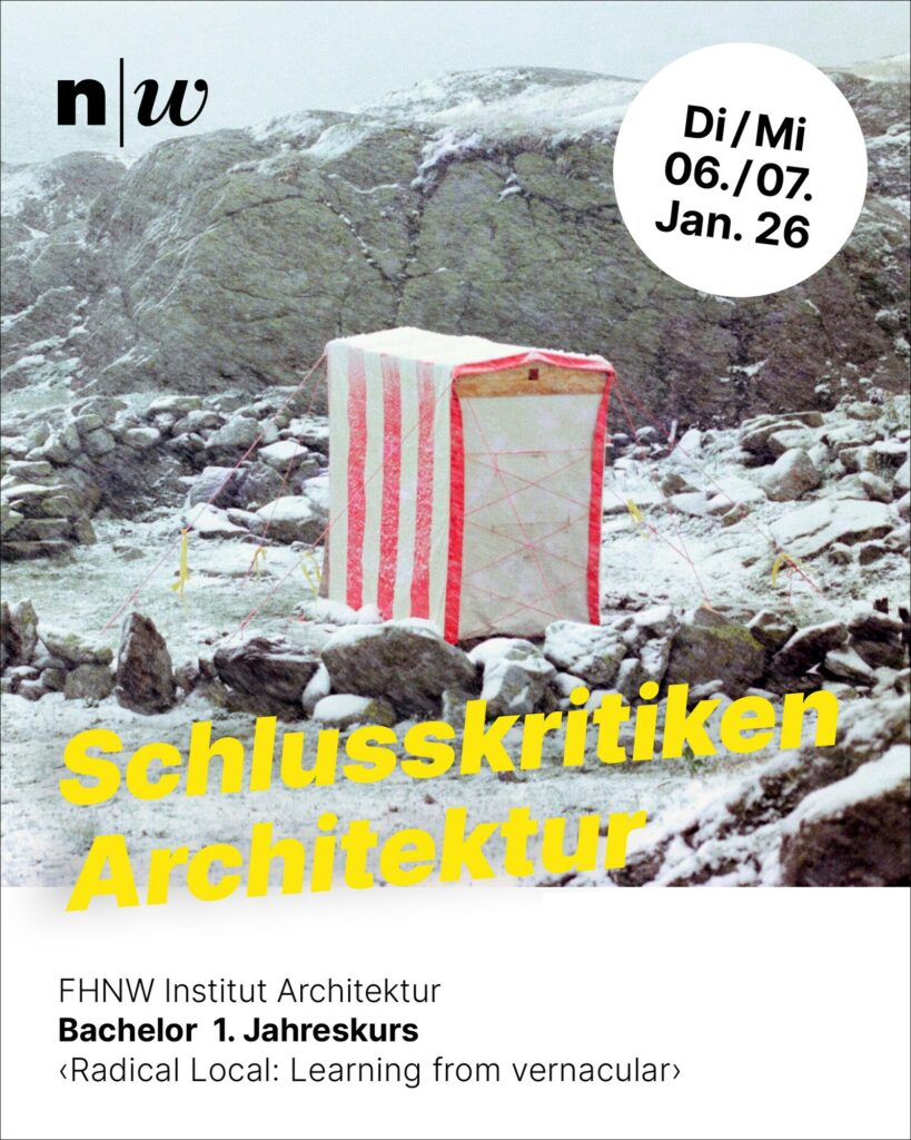 «Radical Local: Learning from vernacular» Im Fokus stehen lokale Ressourcen, Klima und Low-Tech-Strategien, die Raum und Konstruktion prägen. Die Studierenden untersuchen die Transformation von Räumen, Ideen und Bauweisen im Kontext eines klimagerechten Bauens. Vernakuläre Architektur – über Jahrhunderte entwickelte lokale Bauweisen – dient dabei als Inspirationsquelle für Entwürfe, die wieder in einen Dialog mit Ort und Klima treten. Diese Prinzipien werden konkret am Entwurf einer Schutzhütte erprobt. Dozentin Prof. Friederike Kluge Assistenz Kora Ballmer | Kevin Guida | Suna Petersen | Luca Riggio Gastkritik Sascha Roesler | Daniel Tata Schneider | Franziska Wittmann | Saikal Zhunushova Di/Mi 06./07.01.2026, jeweils 09:00 bis 18:00 Uhr FHNW Campus Muttenz, 3.OG Nord