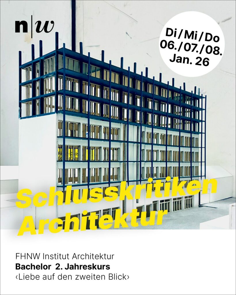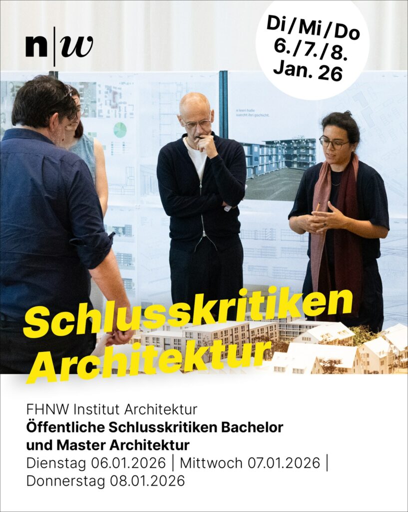 Mit dem Jahr neigt sich auch das Herbstsemester zu Ende - vom 6. bis 8. Januar 2026 stellen die Architekturstudierende ihre Projekte der Kritik von Dozierenden sowie externen Fachleuten. Ein Besuch in Muttenz lohnt sich, einmal mehr wurde Seitens der Studierenden viel investiert und schöne Projekte erarbeitet.