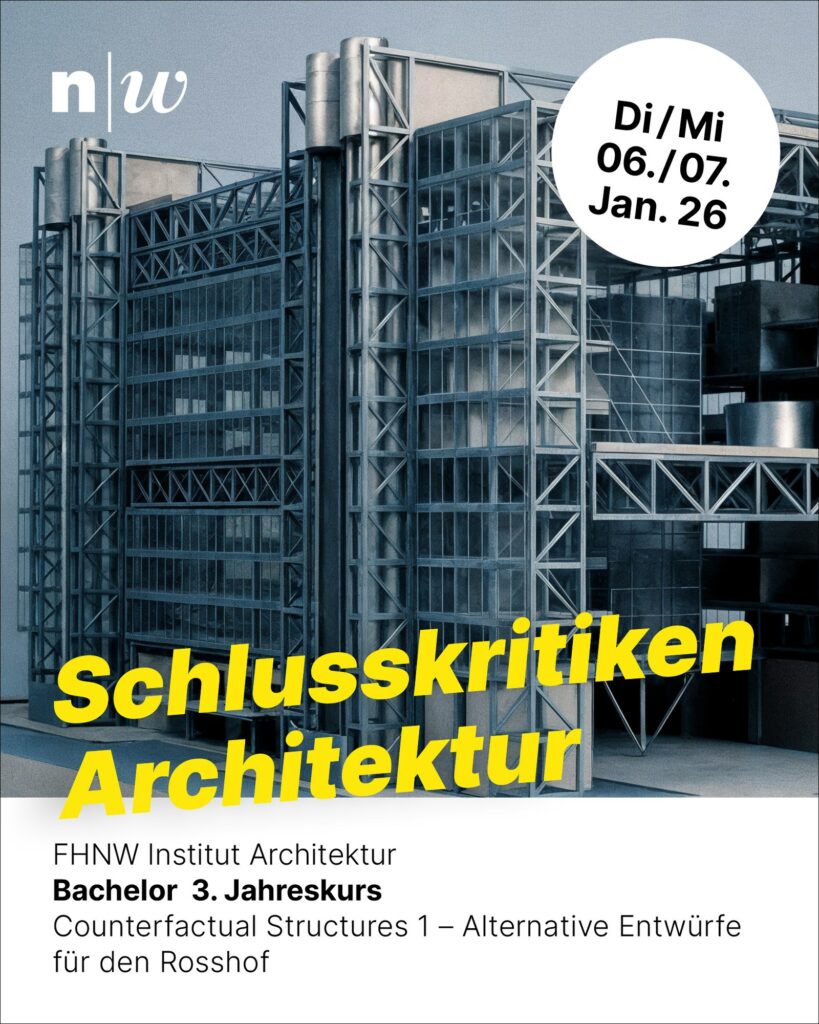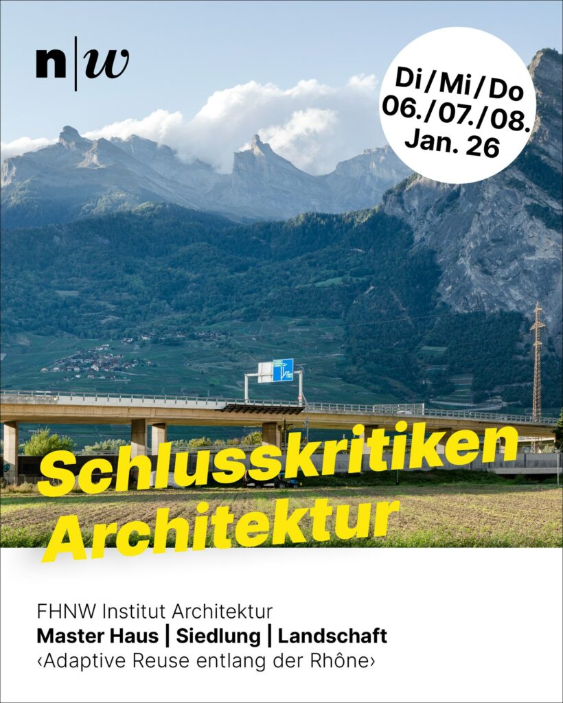 «Adaptive Reuse entlang der Rhône» Die Entwürfe im Landschaftsraum der Rhône, vom Quellgebiet im Obergoms bis zur Mündung in den Genfersee, entwickeln sich aus den vorgefundenen Obsoleszenzen und formulieren eine Vision für eine zukunftsfähige Transformation, die räumlich, programmatisch und sozial auf lokale Bedürfnisse reagiert. Dozierende Gastprof. Céline Guibat | Prof. Axel Humpert | Prof. Dominique Salathé | Prof. Tim Seidel Assistenz Fabio Gsell | Constance Leroy | Laura Schneider Begleitung Thomas Boyle | Axel Schubert | Dr. Andreas Nütten Gastkritik Di 06.01.2026 Marco Rampini, atelier adr, Genève Gastkritik Mi 07.01.2026 Catherine Gay Menzel, GayMenzel, Monthey Gastkritik Do 08.01.2026 Rita Wagner, Stellvertretende Kantonsarchitektin VS Di/Mi/Do 06./07./08.01.2026, jeweils 09:00–16:30 Uhr FHNW Campus Muttenz, 3.OG NordMehr Informationen finden sich hier: https://www.fhnw.ch/de/die-fhnw/hochschulen/architektur-bau-geomatik/institute/institut-architektur/events/schlusskritiken