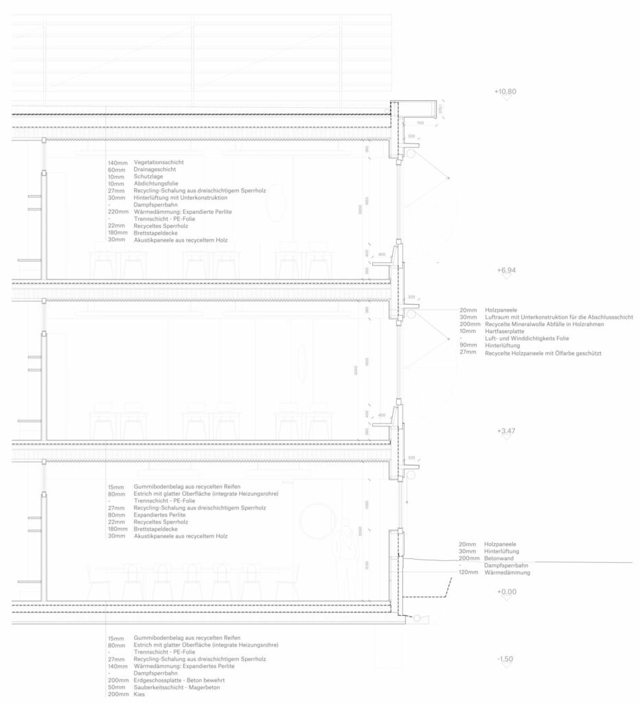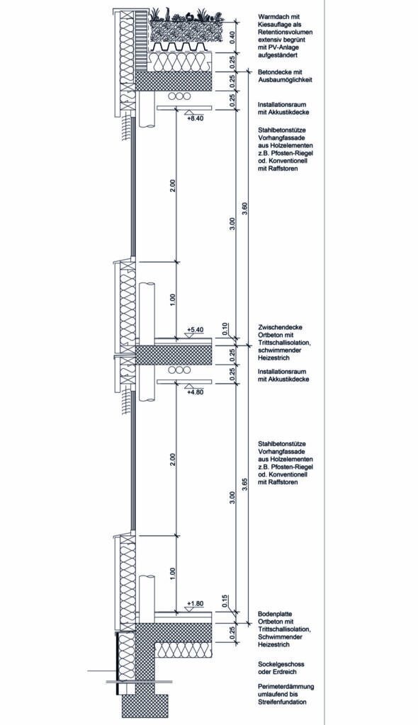Der schematische Fassadenschnitt, ohne architektonische Gestaltung mit hohen Brüstungen und ins Fensterlicht ragenden Rafflamellen veranschaulicht die Qualitätseinbusse vom Gegenvorschlag © Arbeitsgruppe „Ratio“